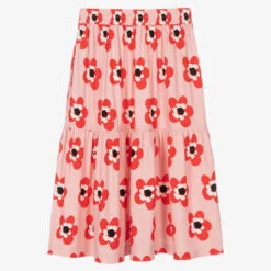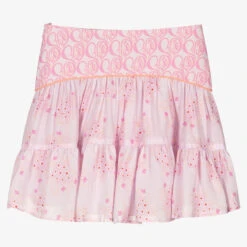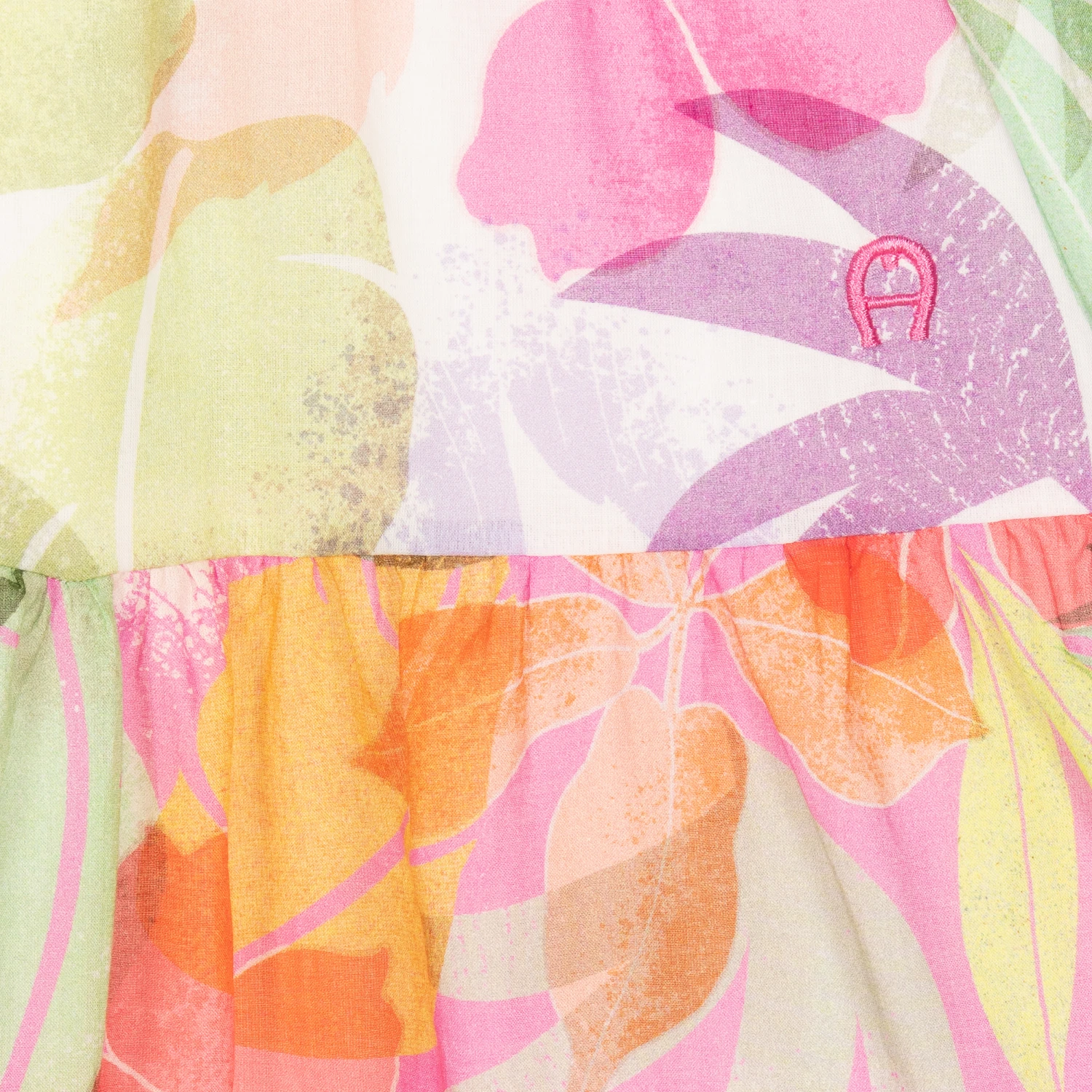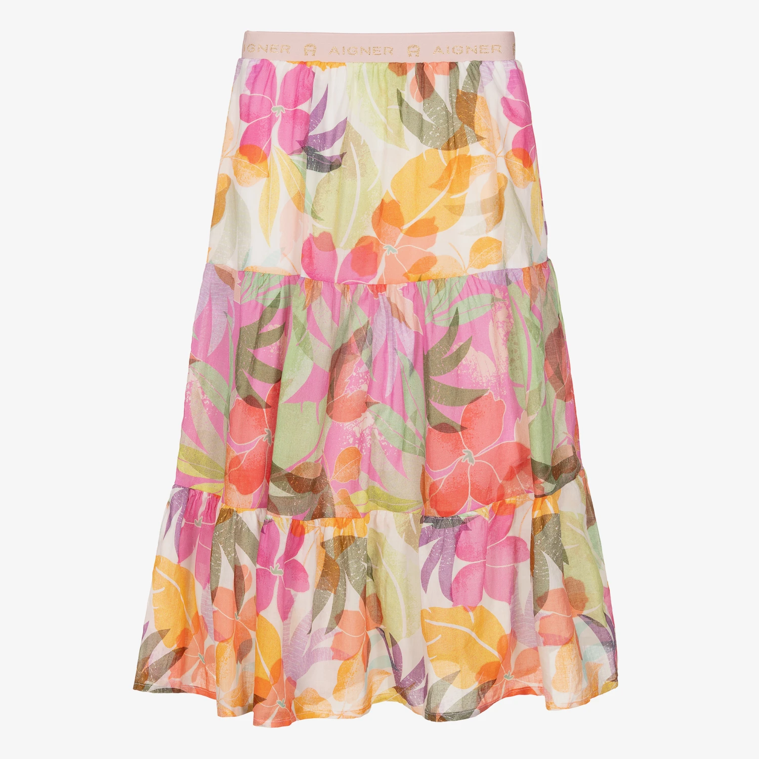 Pink ruffle skirt for teen girls by German label AIGNER, in a colourful orchid floral design. This tropical piece is complete with a pale pink elasticated waistband, finished with gold logo detailing for designer appeal. It also features the brand’s signature ‘A’ horseshoe logo embroidered in pink on one side. It is made in lightweight and breathable cotton voile with a soft lining for added comfort.
