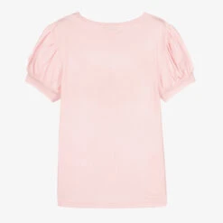 An ivory T-shirt for teen girls by AIGNER. It is made in soft and stretchy cotton jersey, with elasticated cuffs to create a feminine puff effect. Decorating the front is a cool Trompe l’oeil bag graphic in pink and blue, with the designer’s signature ‘A’ horseshoe logo detailed on the gold chain print.