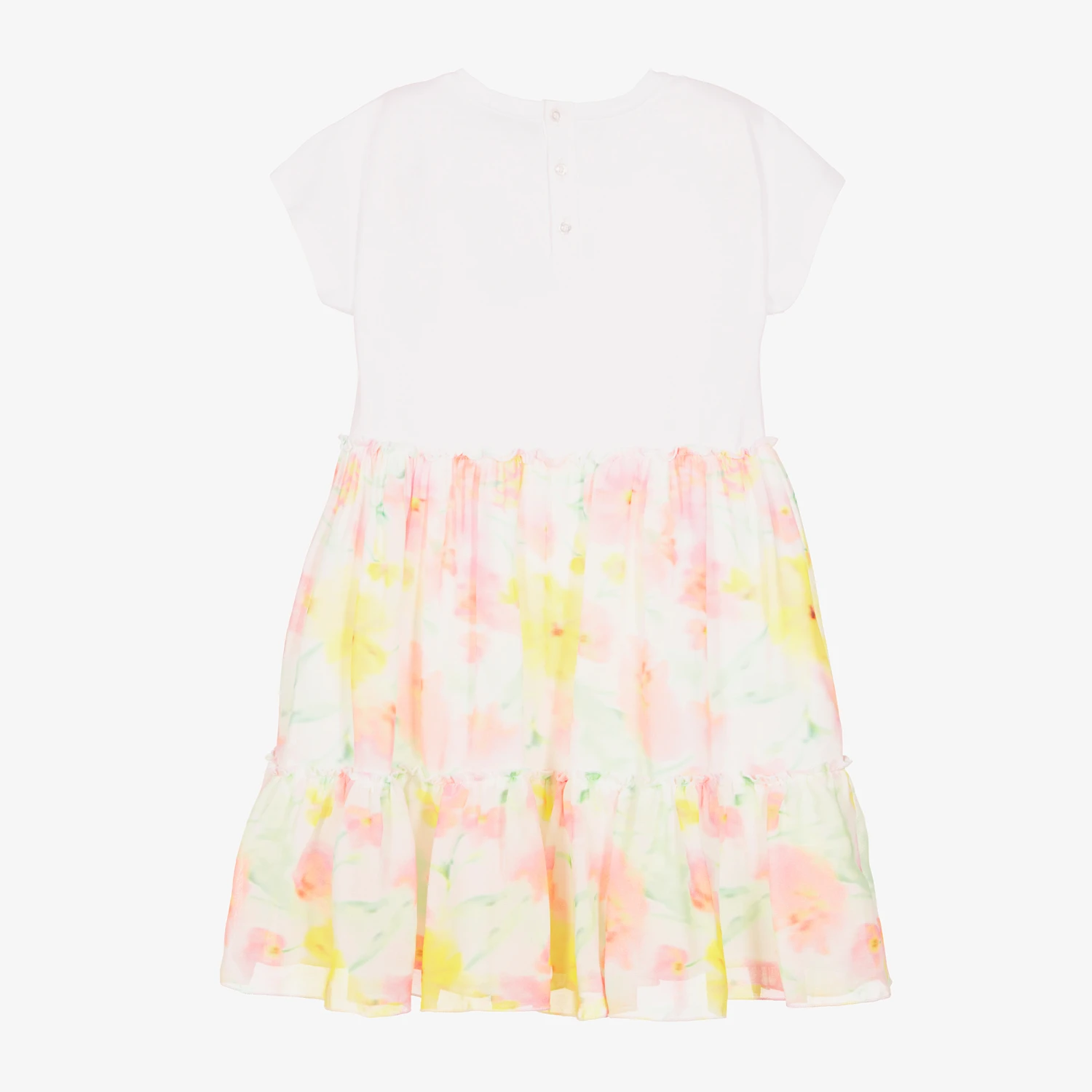 White with a colourful floral pattern, this pretty and feminine dress for teen girls is by AIGNER. Easy and comfortable to wear, the bodice is made in soft cotton jersey and the gathered skirt is in lightweight chiffon. There is a floral motif printed on the bodice, with the brand’s signature ‘A’ horseshoe logo in the centre. The skirt is lined in lightweight cotton for comfort, and there are branded button fastenings on the back for a finishing designer touch.