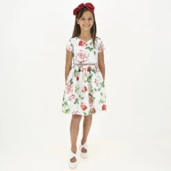 White dress for teen girls by German brand AIGNER, with the brand’s signature ‘A’ horseshoe logo embroidered in black on the front. Made in tiered, lightweight chiffon, this unique dress is patterned with shiny gold polka dots and framed with a deep, gold ruffled neckline. A zip fastening is neatly concealed on the back and the lightweight voile lining offers lasting comfort.
