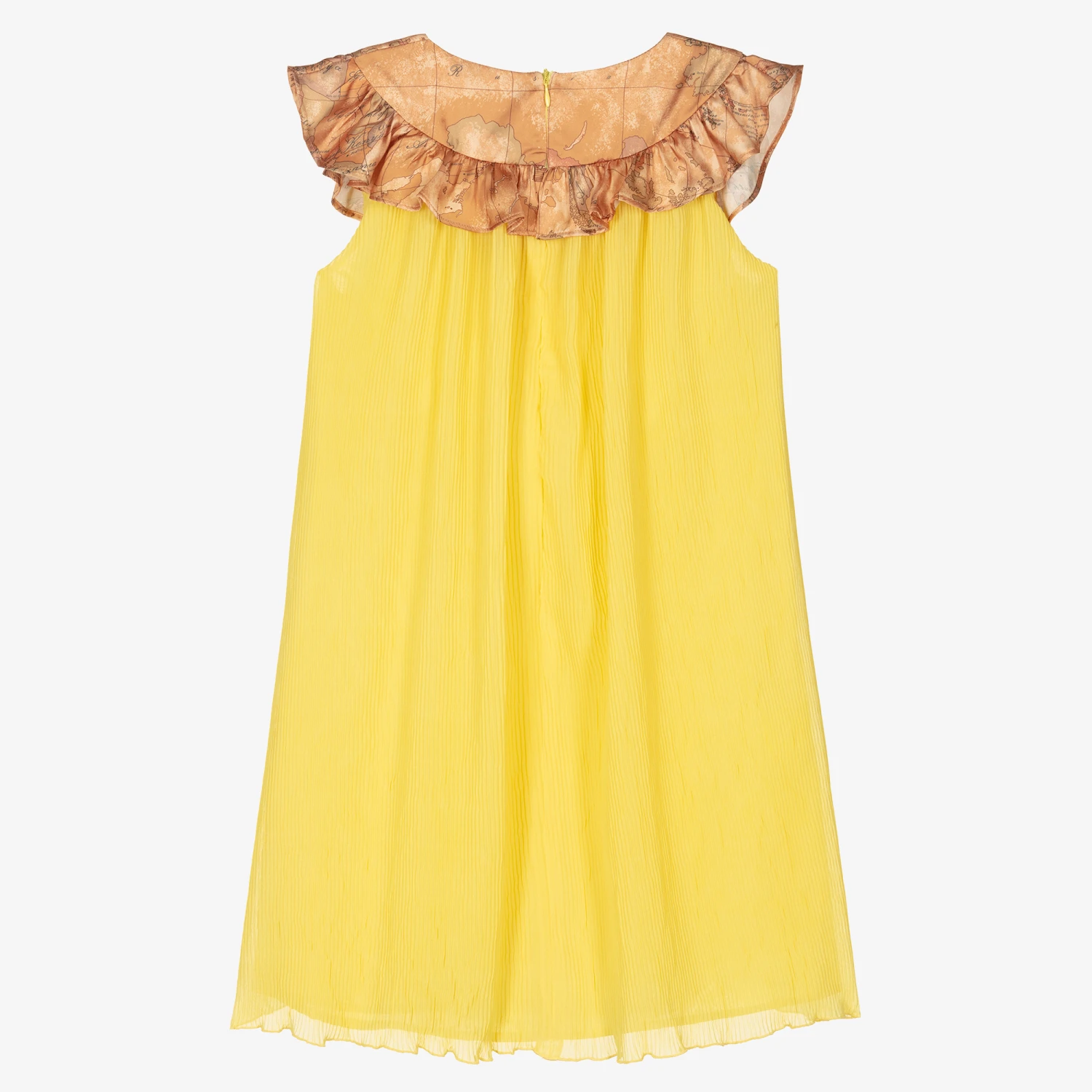 Teen girls chic yellow dress by Alviero Martini, trimmed with the iconic dark beige Geo map print. Lined with soft cotton voile, it has a frilled satin bodice with a gold logo charm, and is made in pleated chiffon for a sophisticated look.