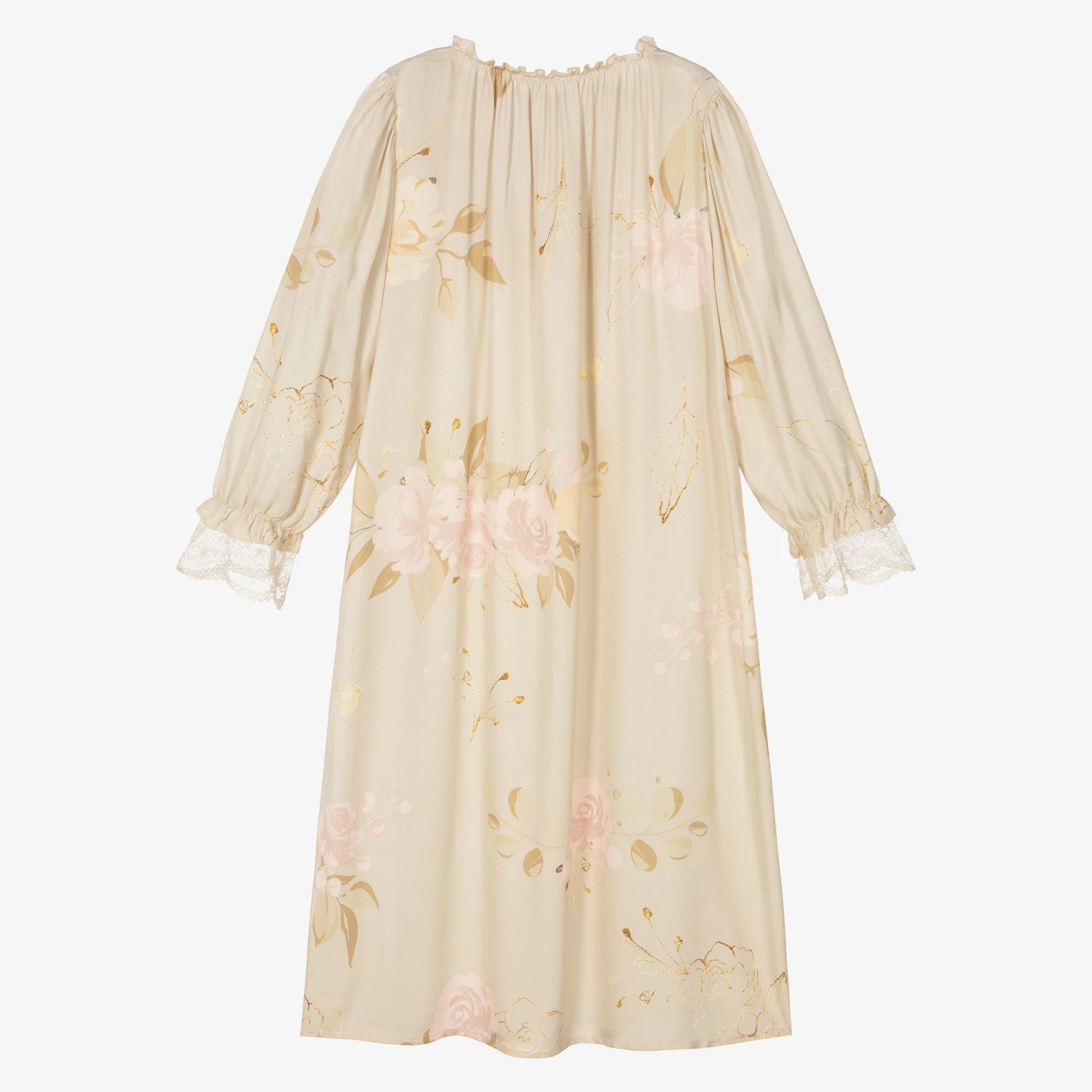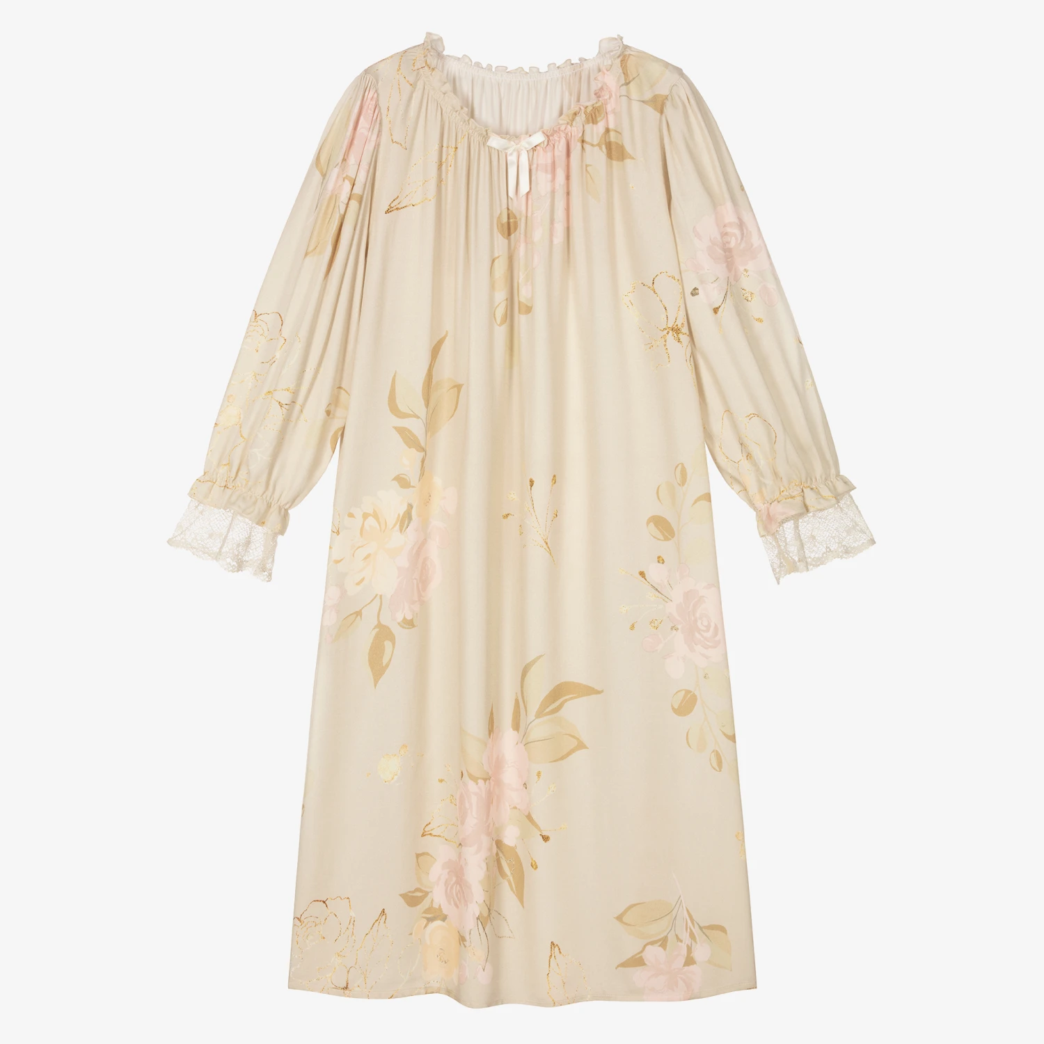 Beautiful beige nightdress for teen girls by AMIKI Children, with a pink vintage rose print. Made in luxuriously soft and lightweight viscose, it has a gently elasticated ruffled neckline with a sweet satin bow detail. The sleeves are full and gathered, with elasticated cuffs and delicate ivory lace trim.