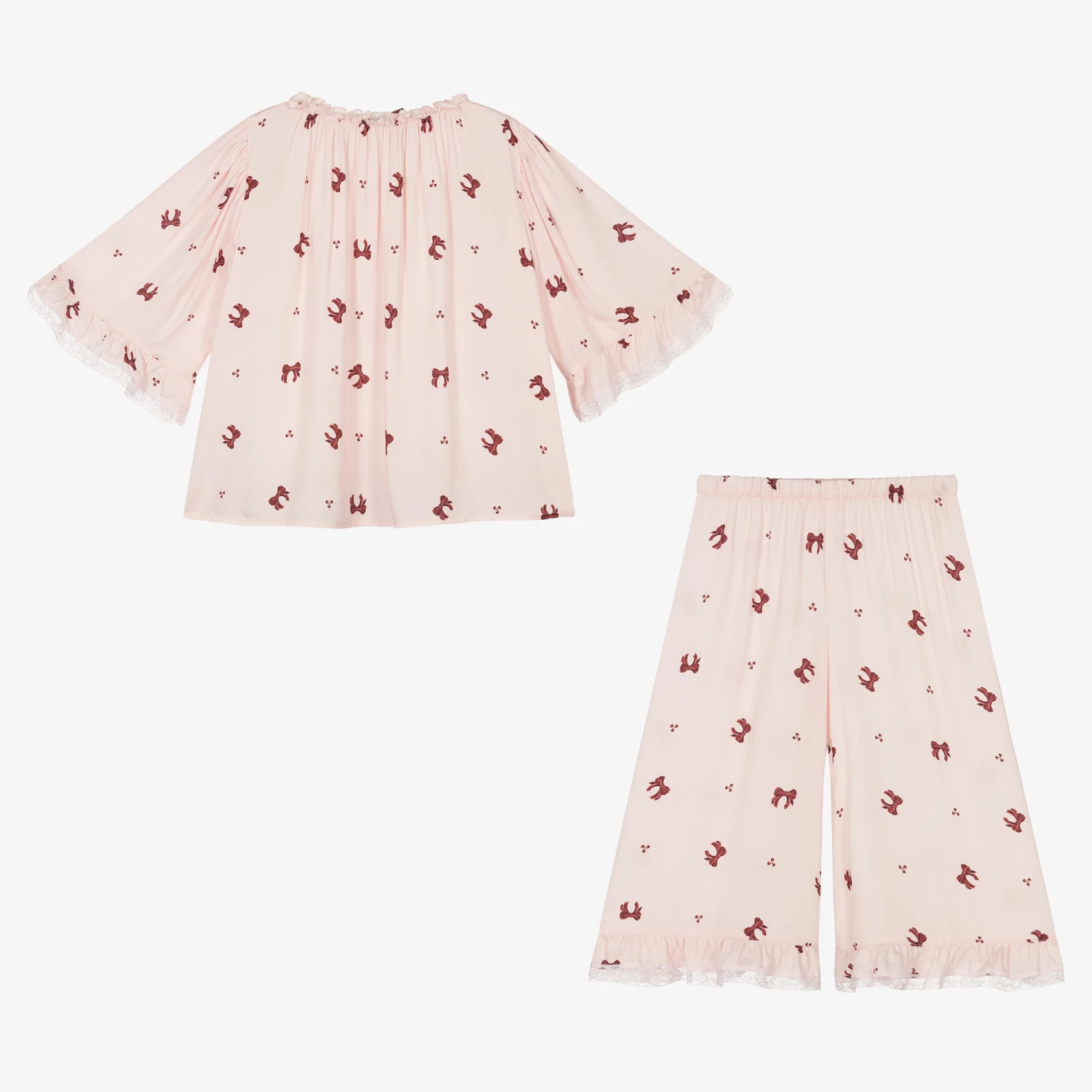 Teen girls pink pyjamas from AMIKI Children. These lovely pyjamas are made in beautifully silky and lightweight viscose with a dark red bow print and delicate blue lace edging. The top has a softly elasticated neckline with a satin bow. The matching trousers have an elasticated waistband.