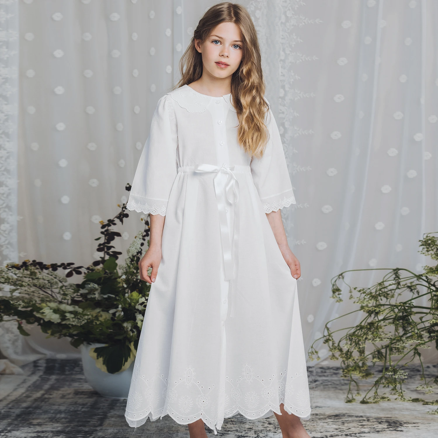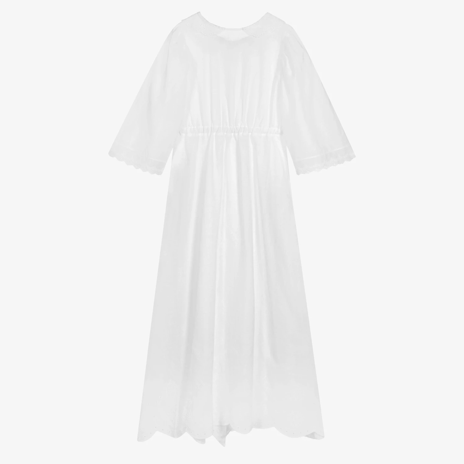 An elegant white cotton broderie anglaise nightie for teen girls by AMIKI Children. This loose-fitting design is made in super soft and lightweight voile for comfort, and has a scalloped collar and three-quarter sleeves with broderie anglaise trims. It buttons down on the front with a satin ribbon sash around the waist for an adjustable fit.