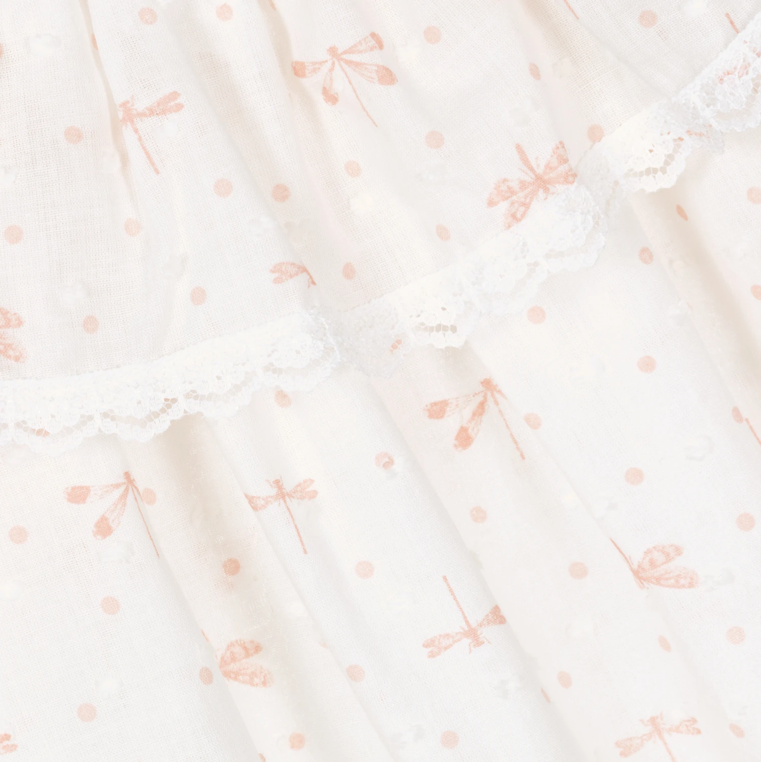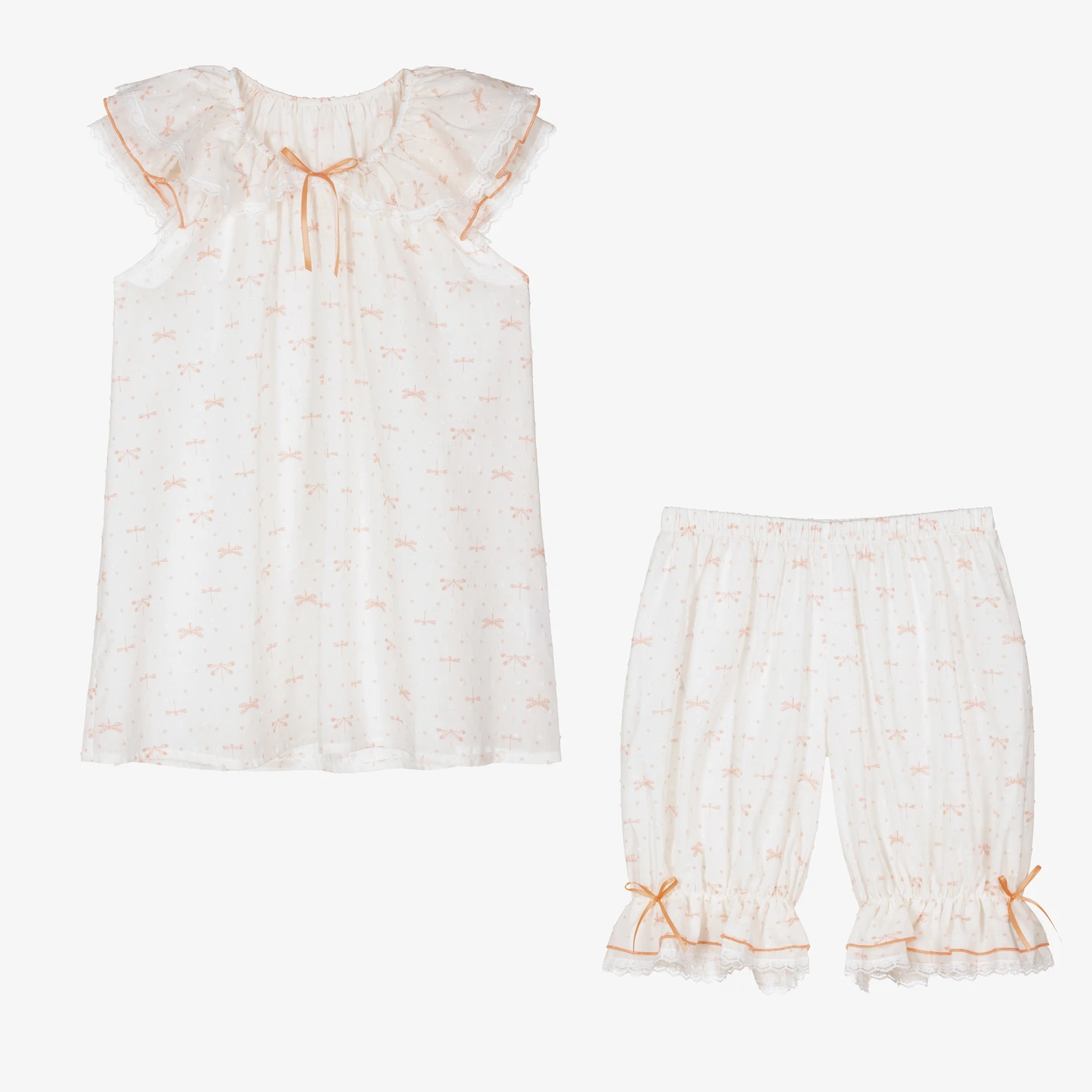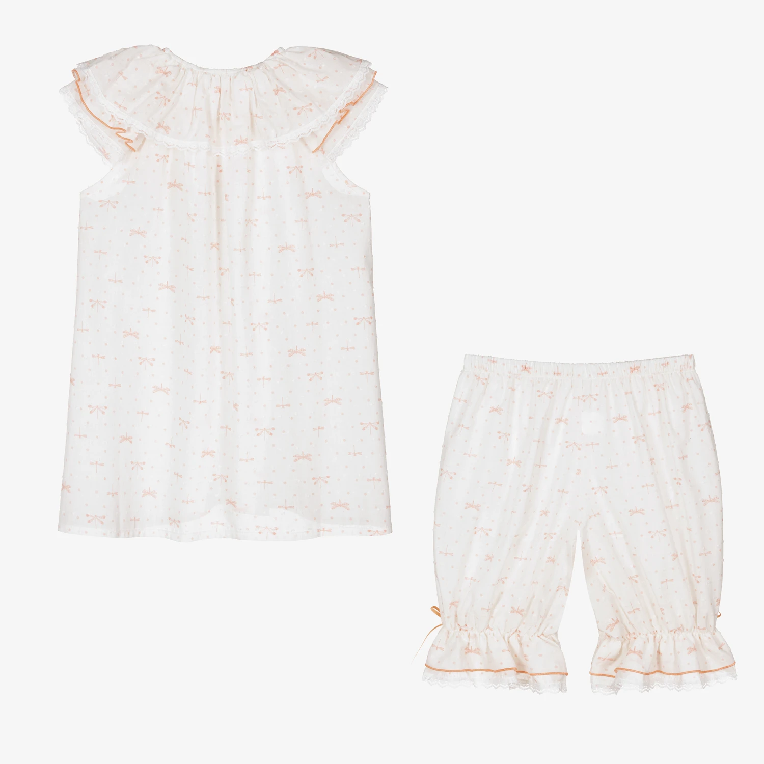 White pyjamas for teen girls by AMIKI Children, with a peach pink dragonfly print. Made in soft and lightweight cotton plumeti, both pieces have pretty ruffles with delicate lace trims and satin bows, and are gently elasticated for a comfortable night’s sleep.