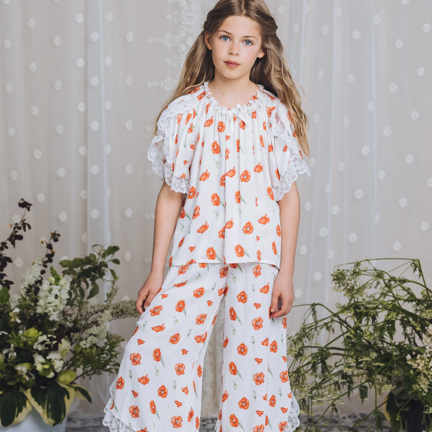 Lovely white loose-fitting pyjamas for teen girls by AMIKI Children, made in super soft and silky fabric. Great for adding a touch of elegance to bedtime, they have a pretty red poppy pattern and white floral-patterned lace trims. The top has a gently elasticated neckline with a white satin bow.