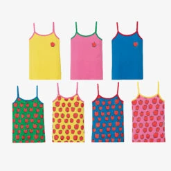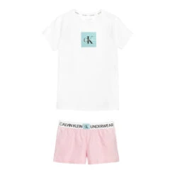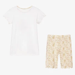 Teen girls off-white short pyjamas by AMIKI Children. Made in luxurious silk with white lace trims, they have a pretty red strawberry print. Loose fitting, they are lightweight and comfortable to wear. The top has ruffle sleeves and a gently elasticated neckline with an ivory satin bow. The matching shorts have an elasticated waistband and lace trims.