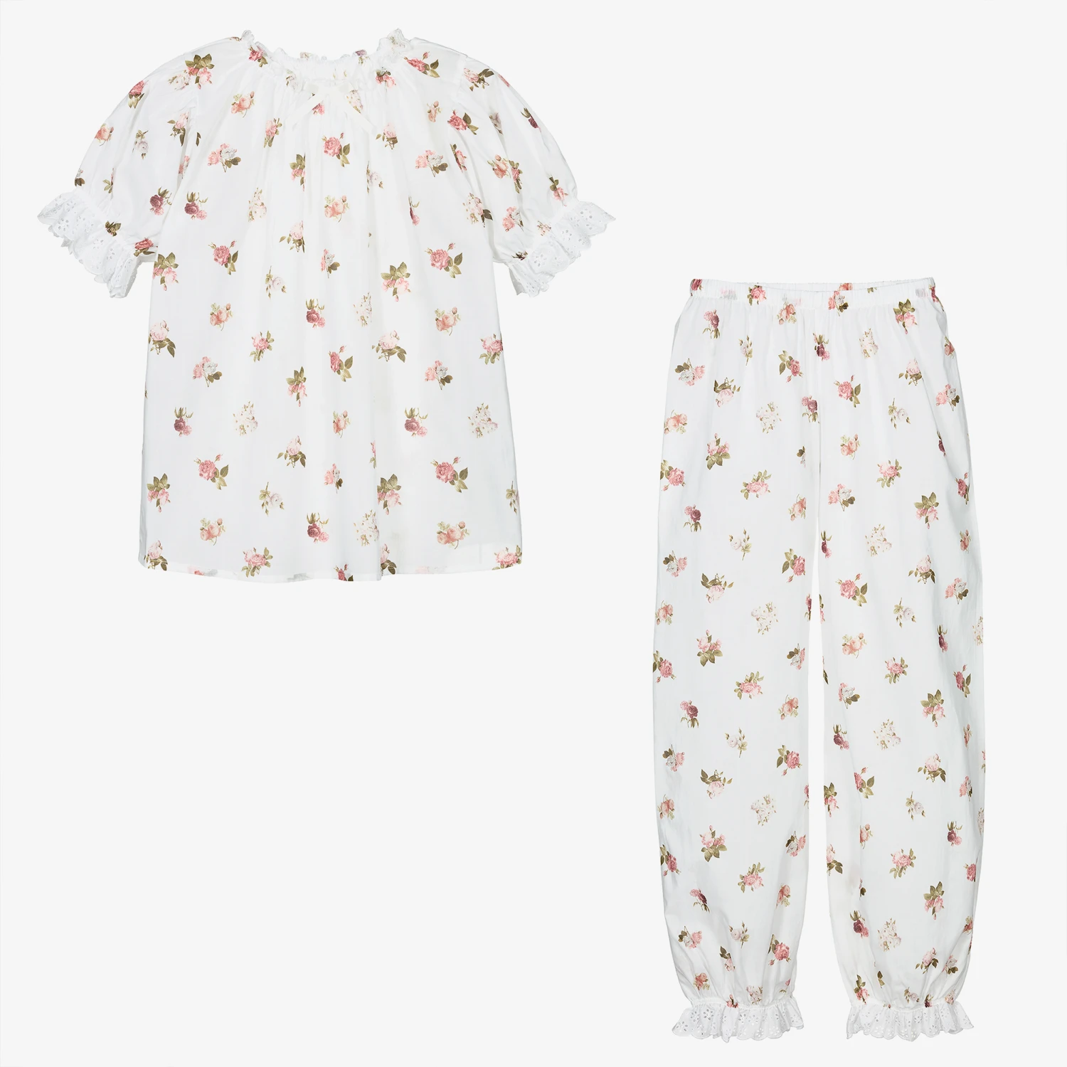 White pyjamas for teen girls, from AMIKI Children, made in soft and lightweight cotton. Both pieces have an elegant pink and green vintage floral print and gently elasticated trims for a comfortable night’s sleep. There is delicate broderie anglaise edging and a satin bow on the neckline of the top.