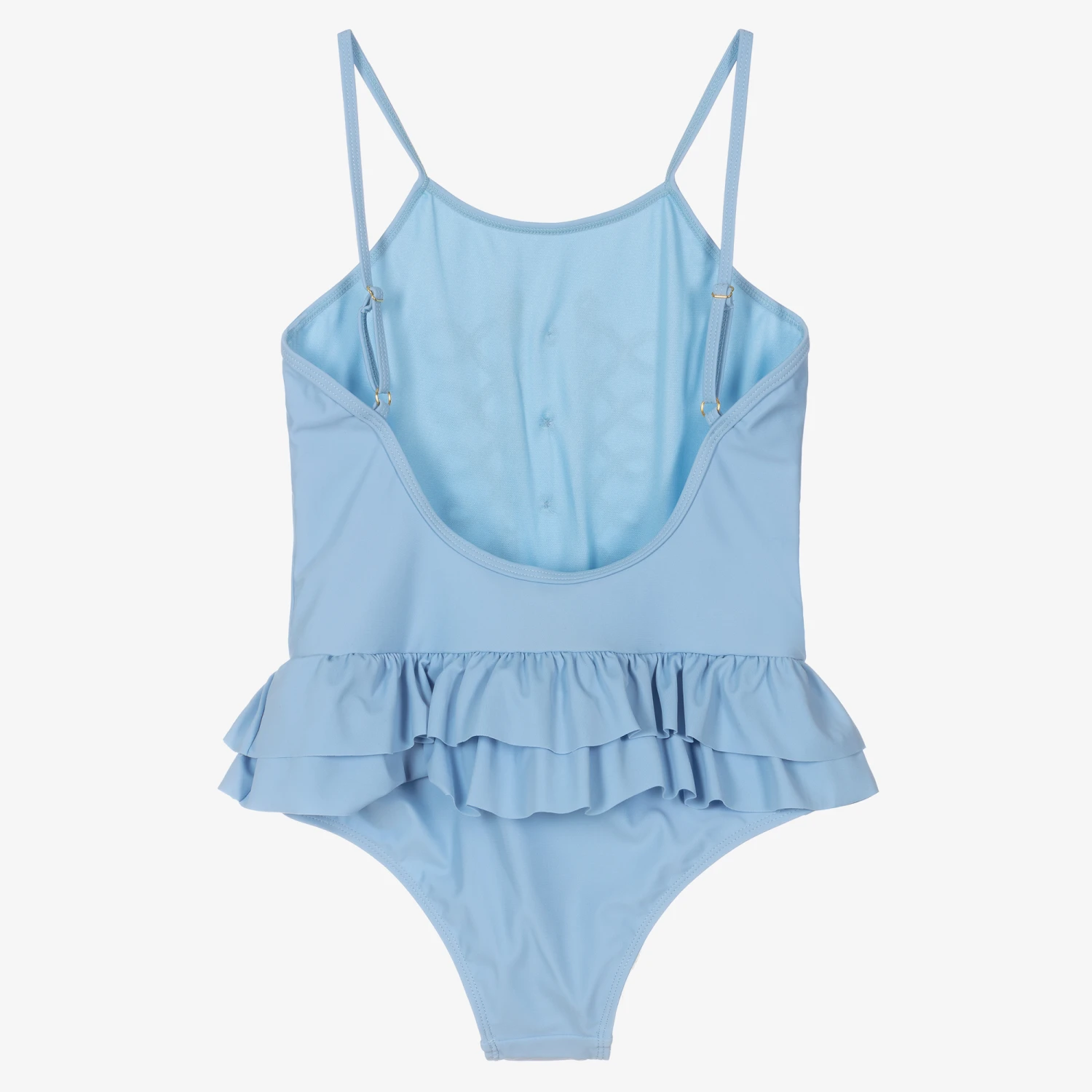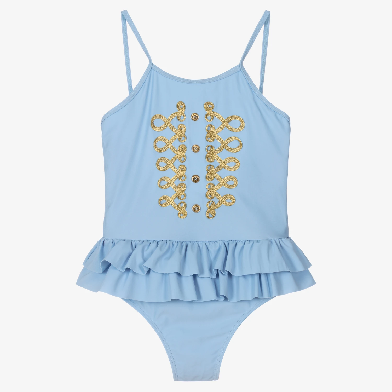 Teen girls sky blue swimsuit from Angel’s Face, made in stretchy nylon with SPF 50+ protection. Fully lined, this beautiful one-piece has gold military-style braiding and buttons on the front. It has adjustable shoulder straps and ruffles around the hips.