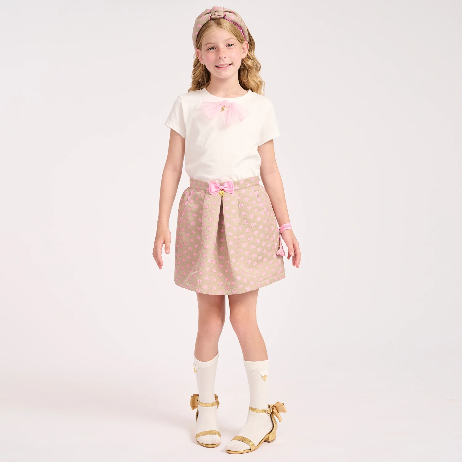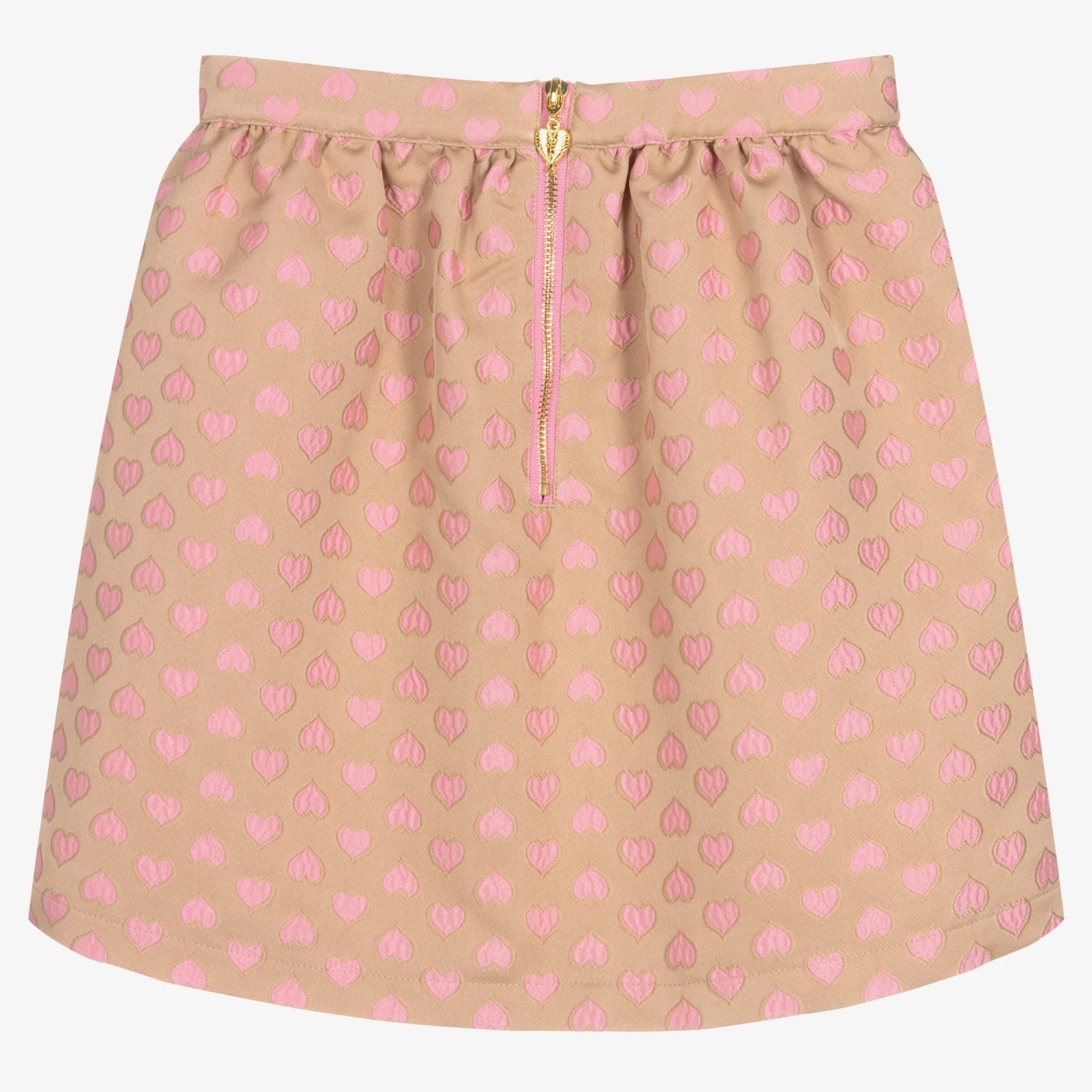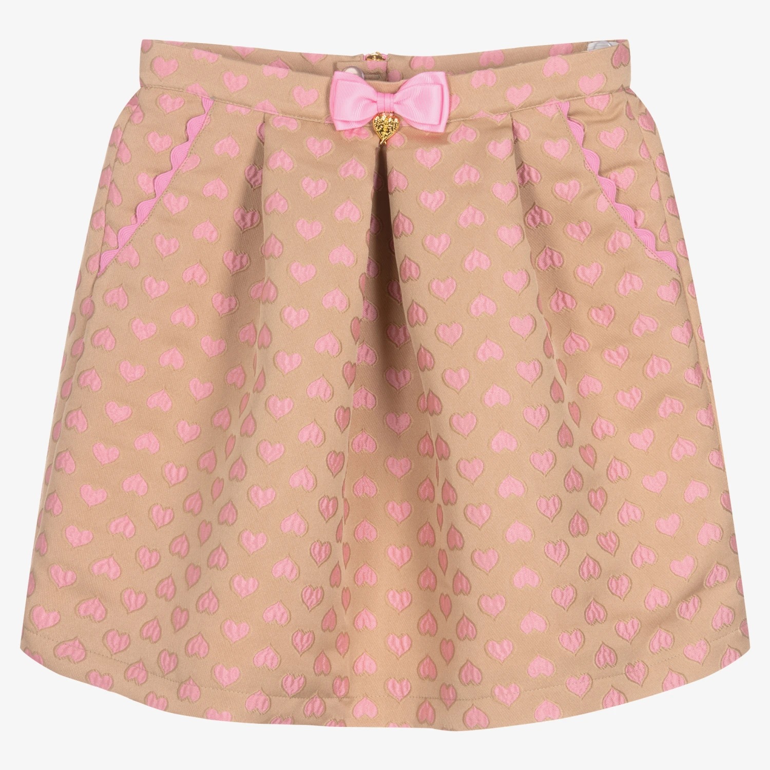 A pretty beige and pink heart patterned jacquard skirt for teen girls from Angel’s Face. It has lovely front pockets, trimmed with cute pink ric rac ribbons and the designer’s signature golden heart charm and bow centerpiece on the front of the waistband. Fully lined in soft pink crêpe for comfort, it fastens with an exposed golden zip on the back.