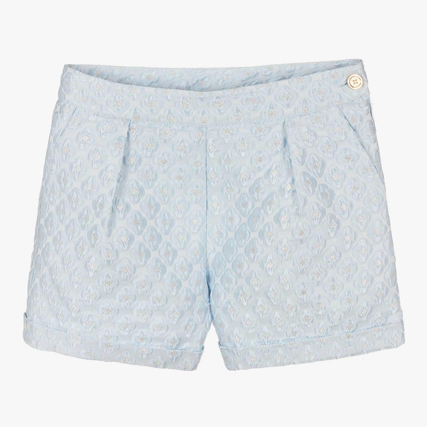Light blue brocade shorts for teen girls by Angel’s Face. Darted for shape, these flattering shorts are woven in a blue and silver floral jacquard design with a lovely shimmering effect. They have a lightweight crêpe lining, useful pockets and a hidden zip with a statement gold branded button fastening on the side.