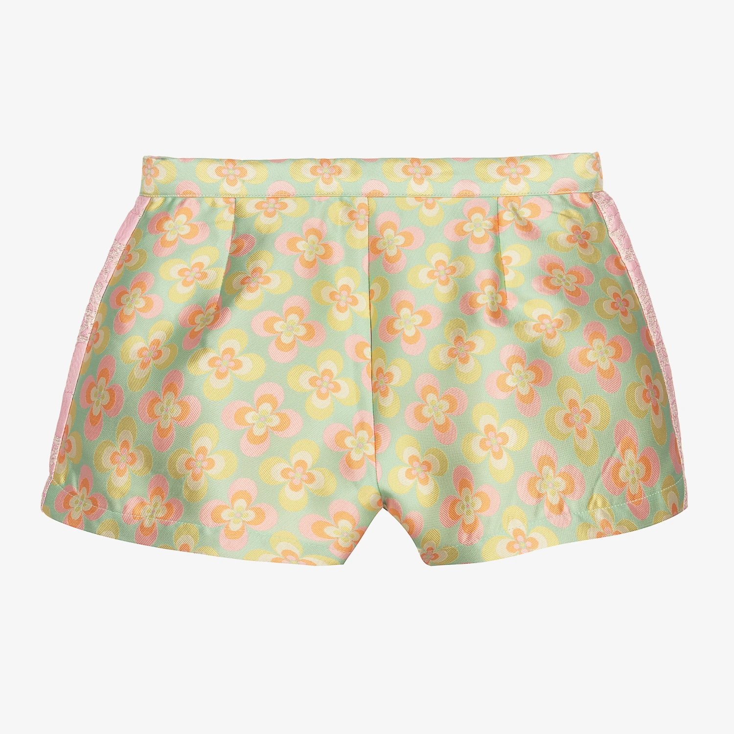 Teen girls green and pink shorts from Angel’s Face, made in silky jacquard with a colourful floral pattern. Lined in lightweight satin, they have front pockets and an adjustable waistband. There are pink and gold floral brocade panels on the sides, and a logo-embossed gold button and zip to fasten.