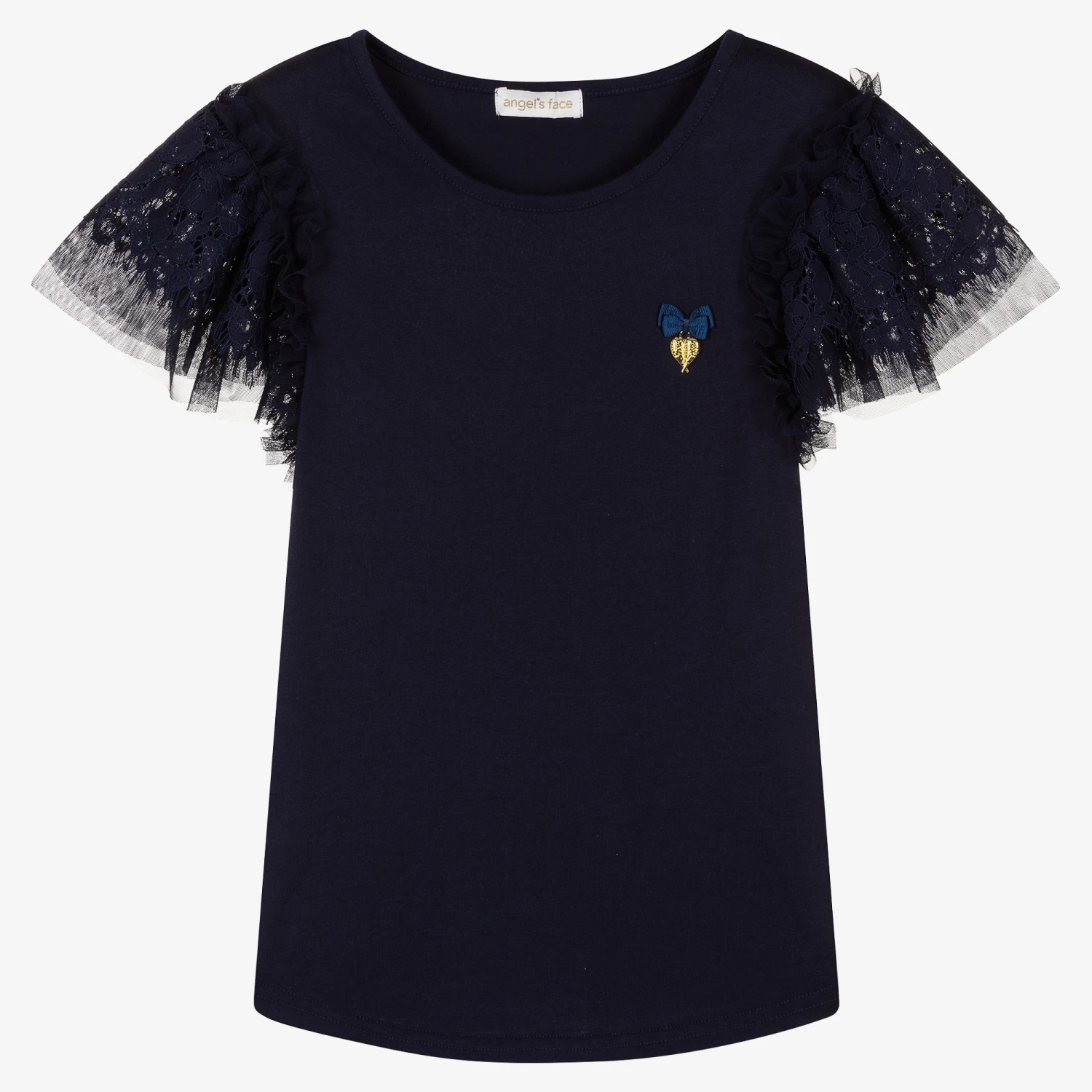 An effortlessly chic navy blue top for teen girls by Angel’s Face. The pretty flutter sleeves are designed in layers of beautiful lace and soft tulle with delicate ruffle trim. Made in super soft cotton and modal blend jersey. the signature gold heart charm and bow is stitched on the chest for sweet and subtle branding.