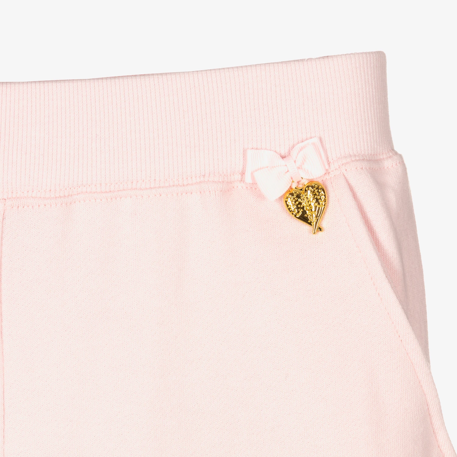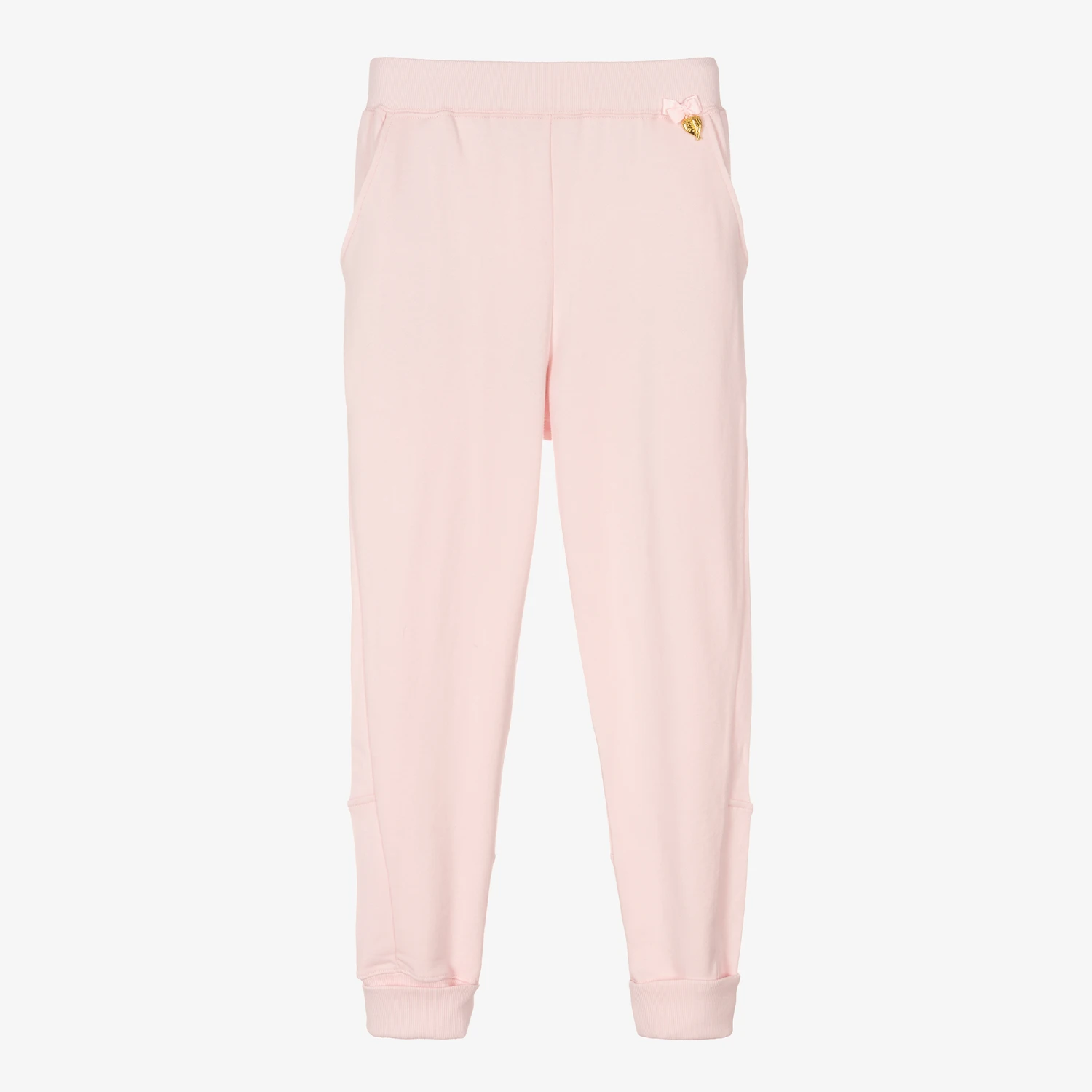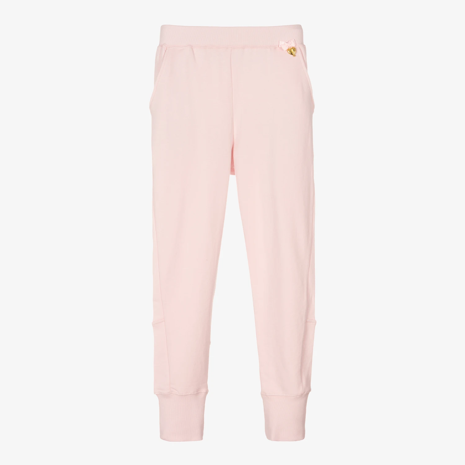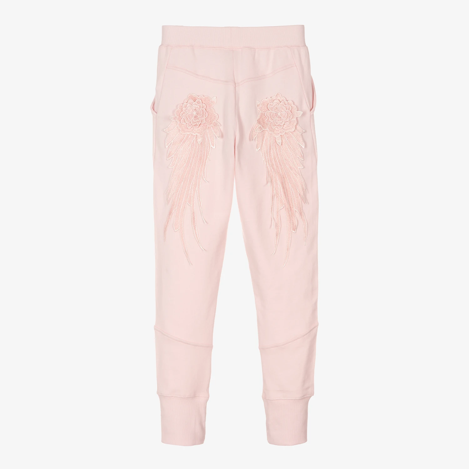 Teen girls pink cotton joggers by Angel’s Face, featuring the signature gold heart charm and bow on the elasticated waist. With casual ribbed trims, they have front pockets, and glamorous pink embroidered wing and flower appliqués on the back.