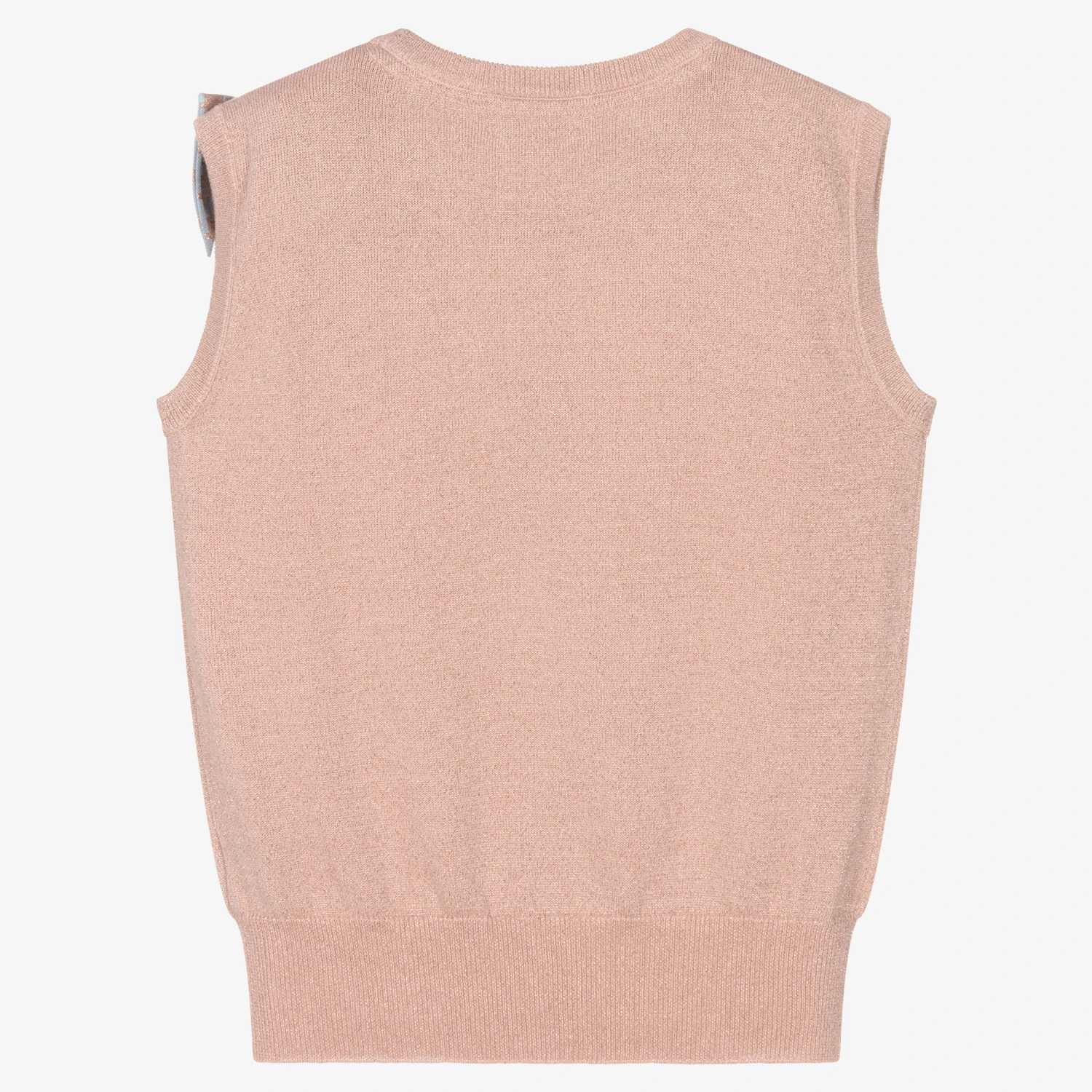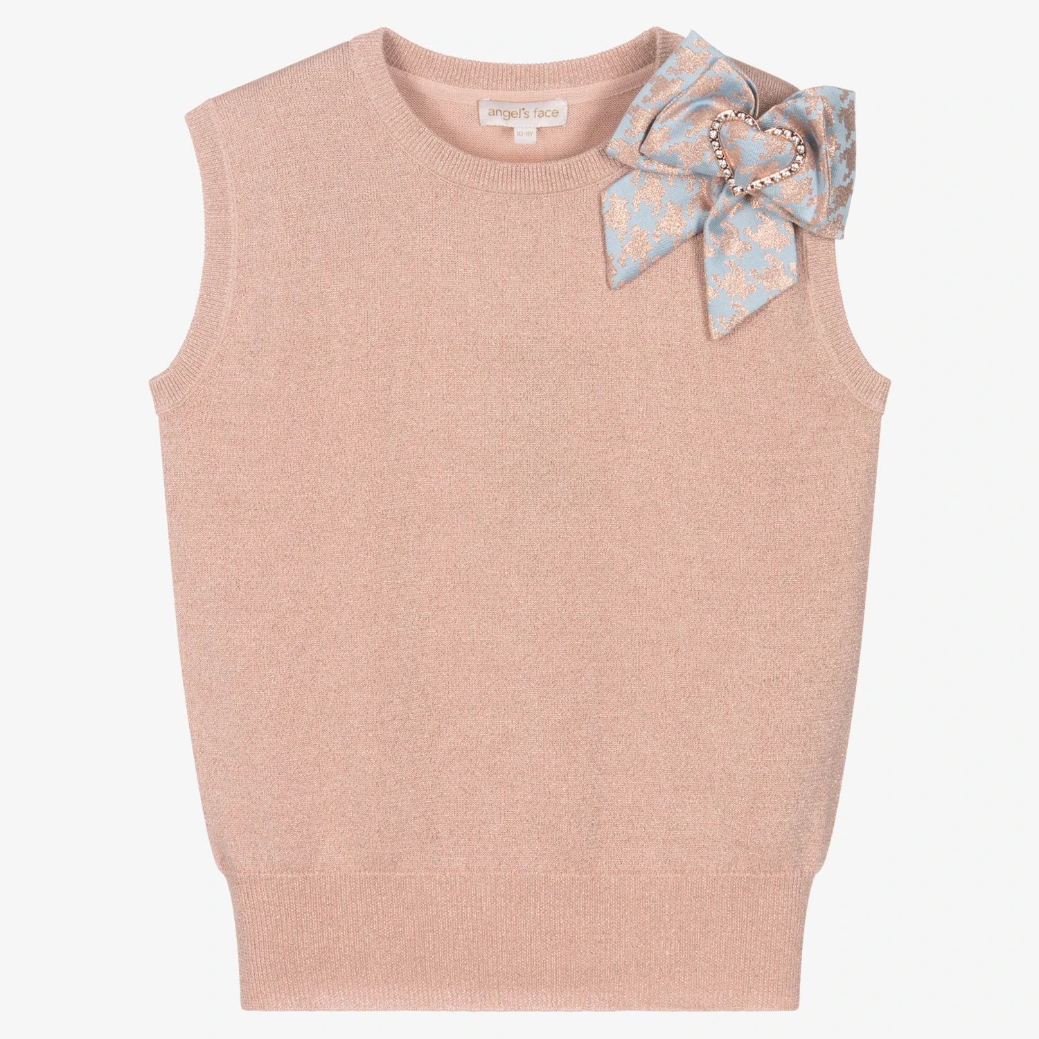 A dusky pink sweater vest for teen girls by British label Angel’s Face, woven with lurex thread for a shimmery rose gold finish. Knitted in a soft cotton blend, this gorgeous piece has a removable blue jacquard bow on the neckline designed in a rose gold houndstooth pattern. It features a heart-shaped diamanté buckle for an extra touch of glamour.