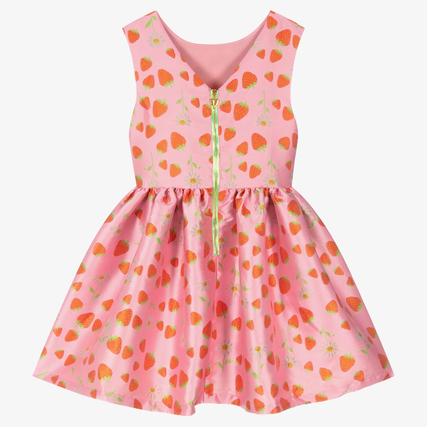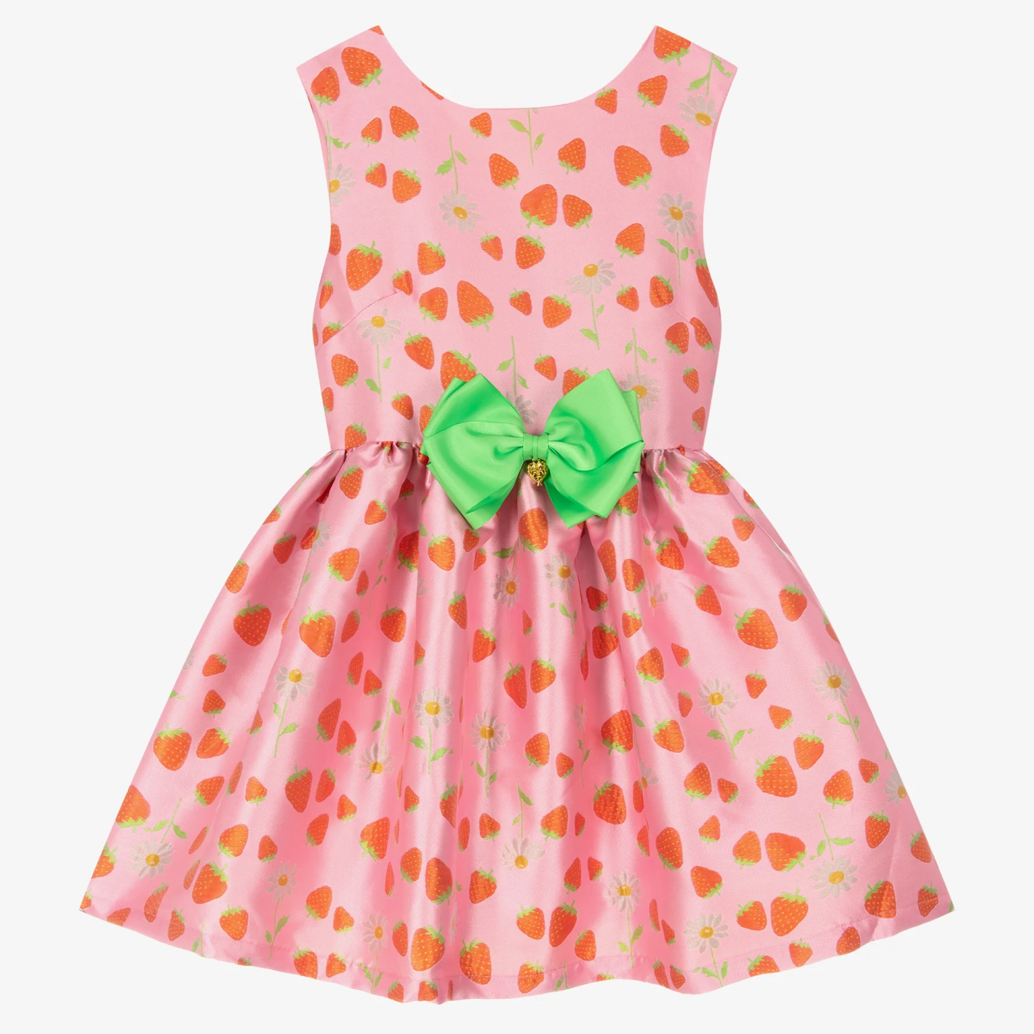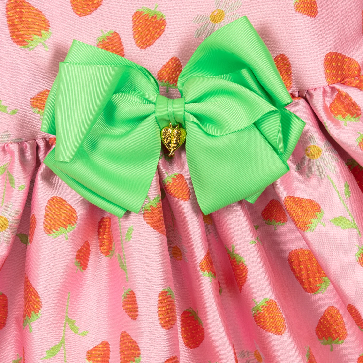 A pink, fit and flare dress for teen girls by Angel’s Face, in a lovely red and green strawberry jacquard pattern with a subtle sheen. The waist is gathered for a stunningly flared skirt, with a statement green grosgrain bow and gold heart charm, a signature look of the brand. There is an exposed golden zip with the iconic heart charm to fasten on the V-back.