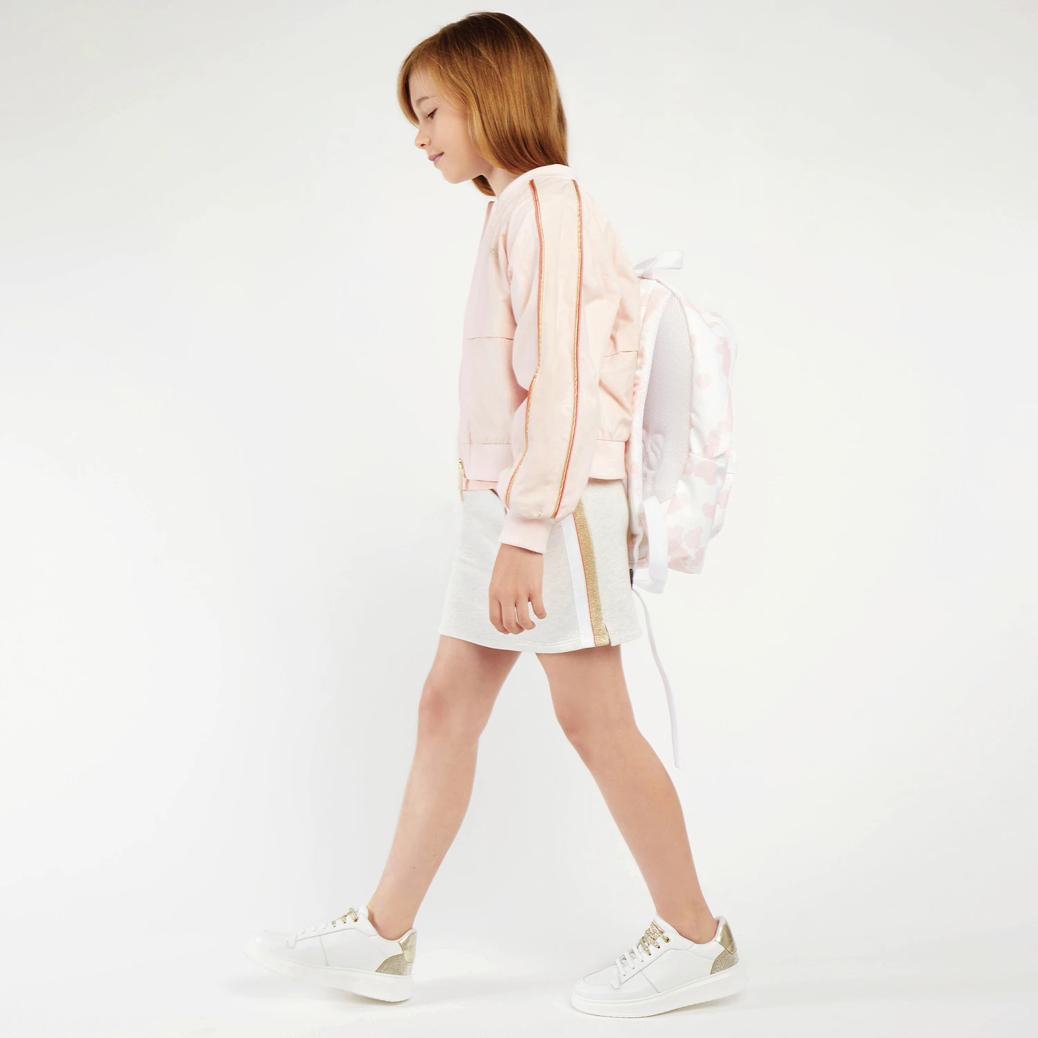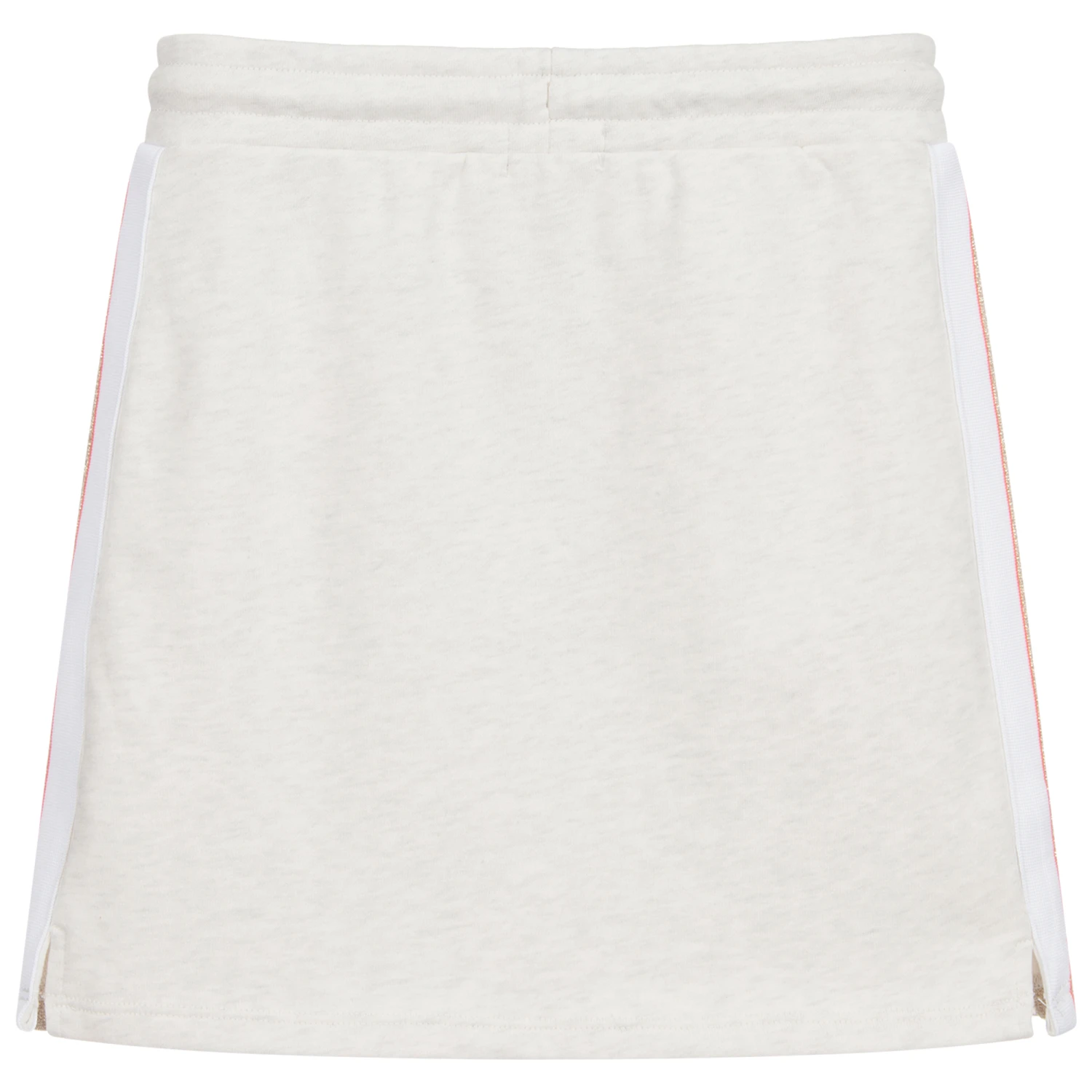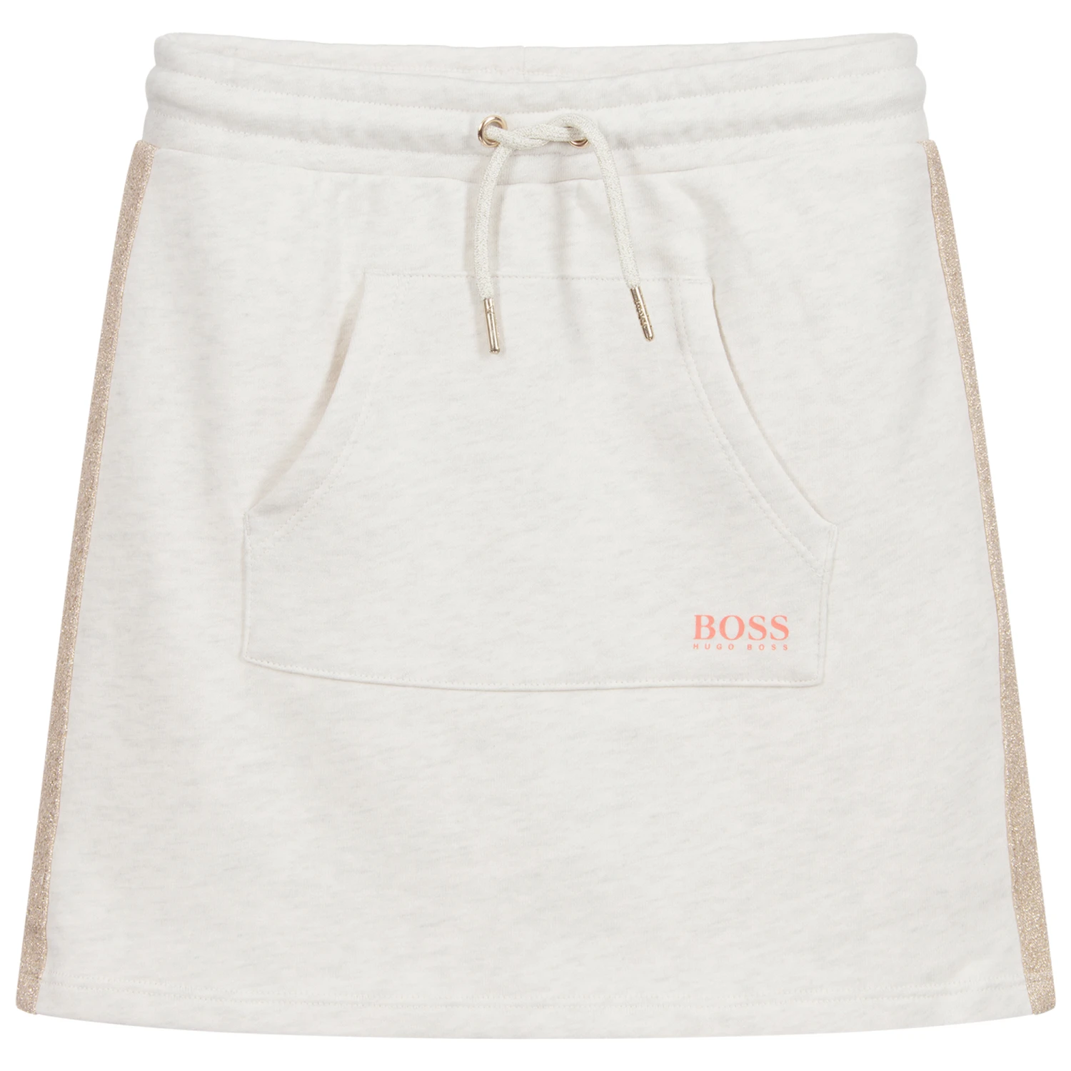 A soft jersey mini skirt with pouch pocket for teen girls by BOSS Kidswear. The pale grey sweatshirt fabric has a looped underside and the brand’s logo tape in ivory, glittery gold and orange trim the sides, For a good fit, it has an adjustable drawstring and to complete the look there is an orange logo.