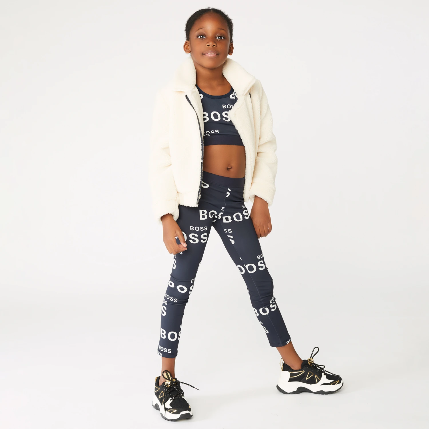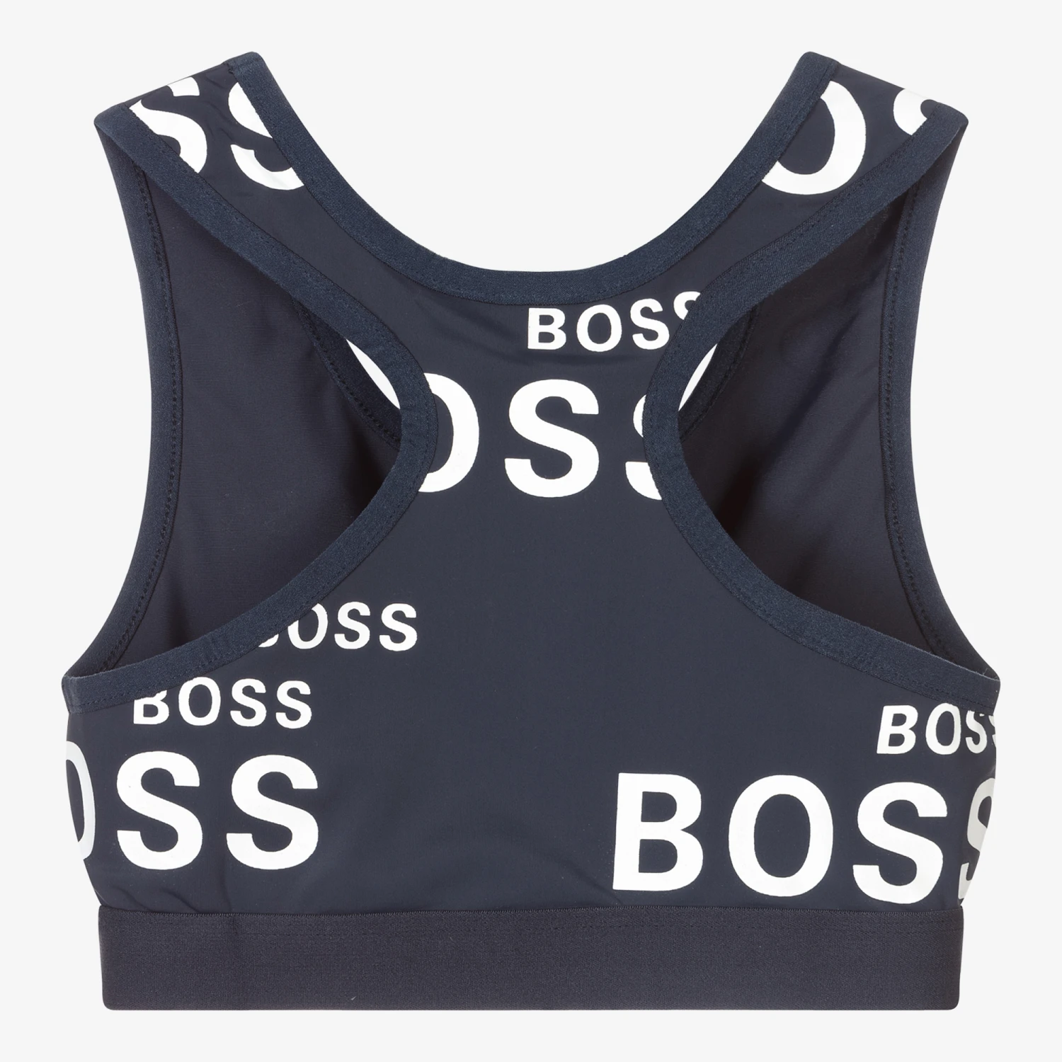A cropped sports top for teen girls in navy blue, by BOSS Kidswear. Silky smooth and stretchy, it has a white logo print all over with plain, elasticated navy blue trims.