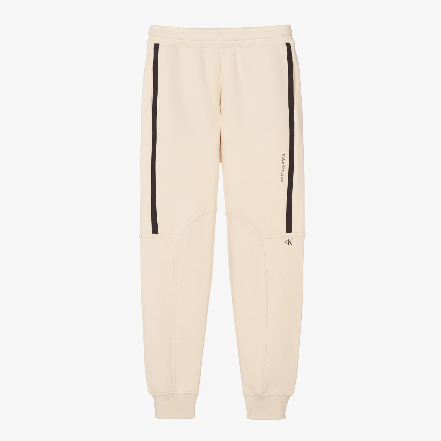 Teen boys pale beige joggers from Calvin Klein Jeans, made in mid-weight cotton jersey. They have sporty black trims on the front with logo lettering and the CK monogram at the knee. They are finished with concealed pockets and an internal drawstring waist for an optimum fit.