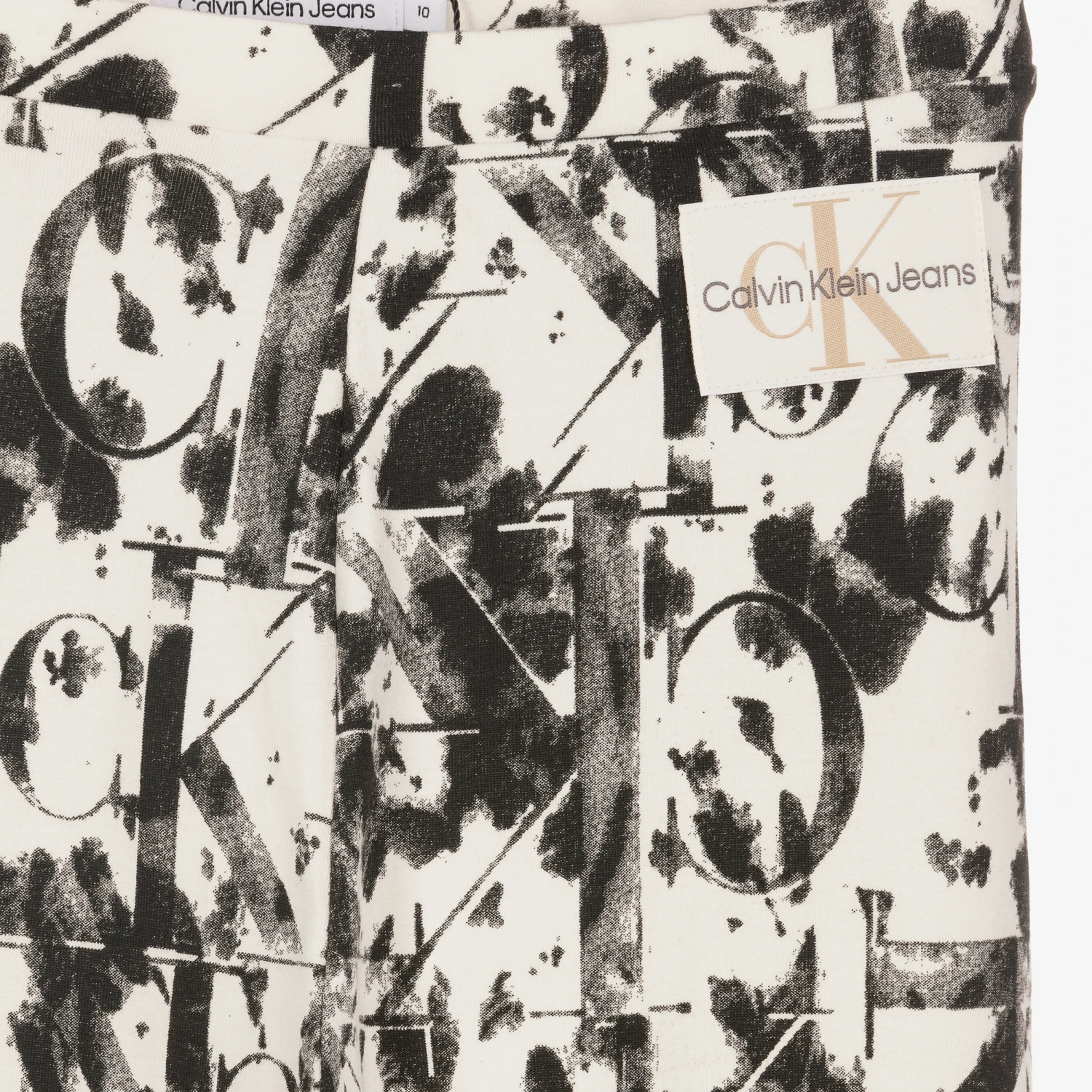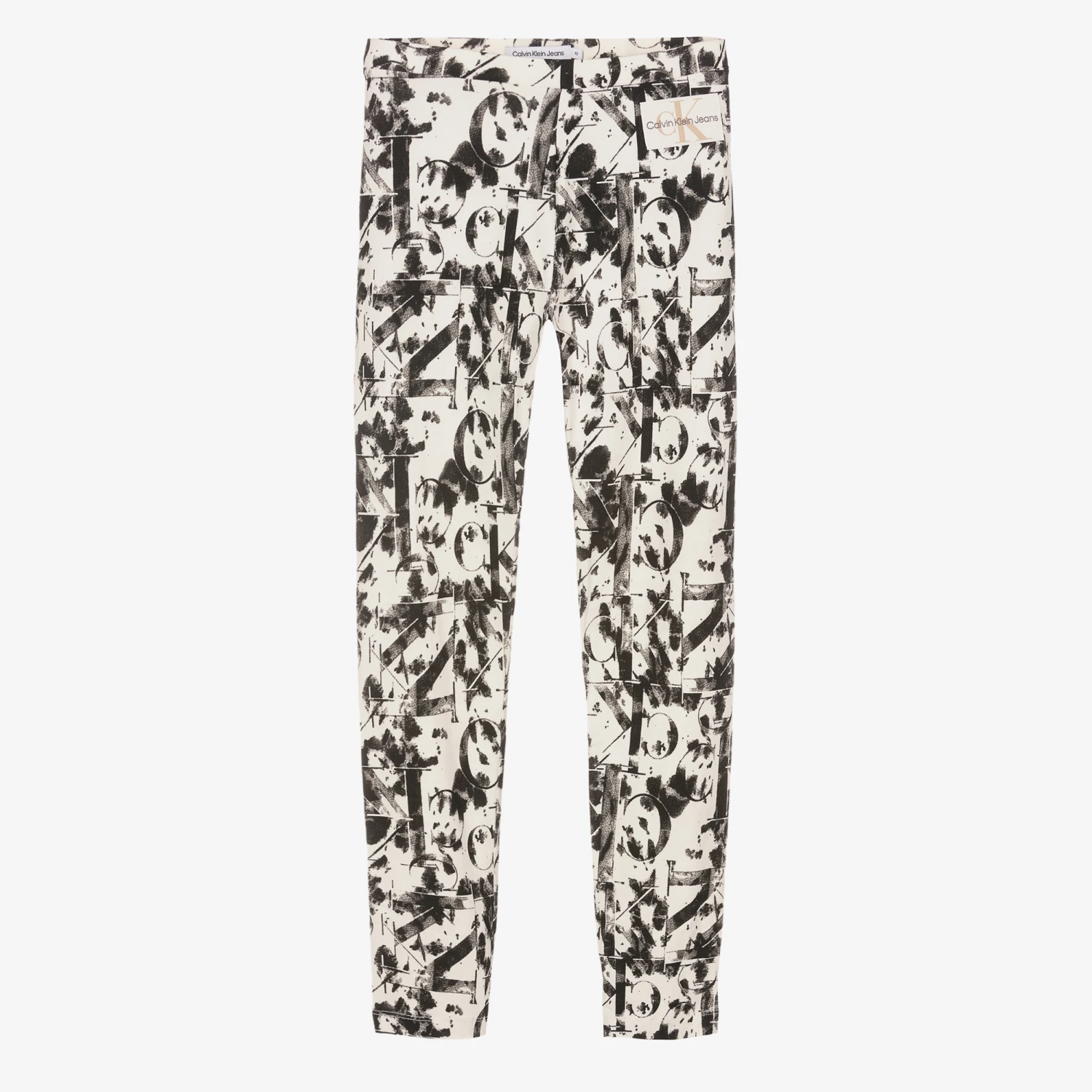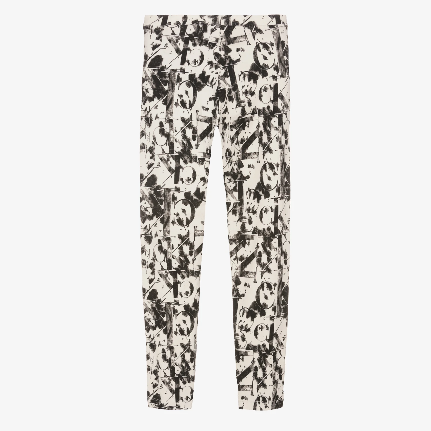 Off-white and black cotton leggings for teen girls by Calvin Klein Jeans, with an all-over black smudged monogram logo print. Full-length and made in stretch jersey with an elasticated waist, they have a cool, off-duty look.