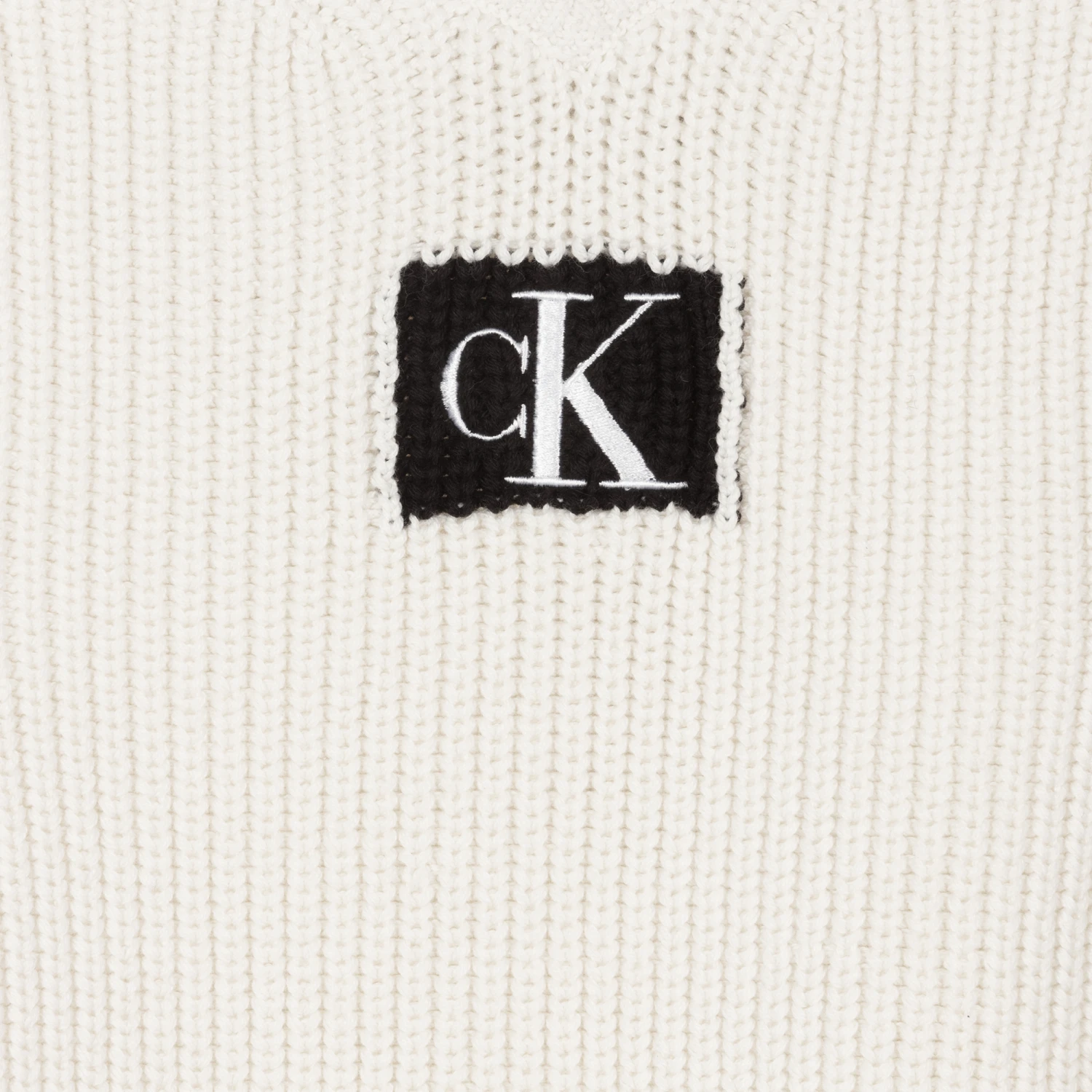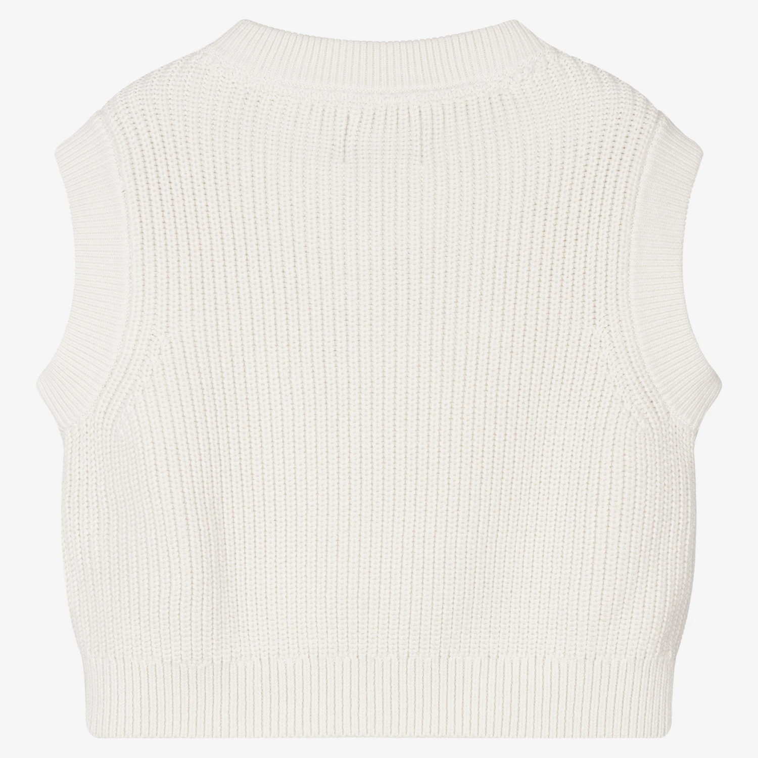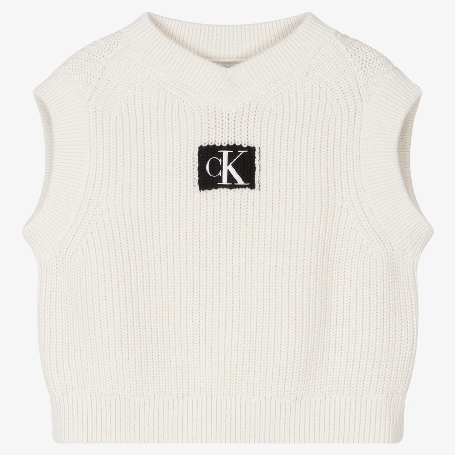 Ivory sleeveless sweater for teen girls by American brand Calvin Klein Jeans, just right for layering on cooler days. Made in a mid-weight cotton knit with ribbed trims, it has a black and white monogram logo embroidered on the front.