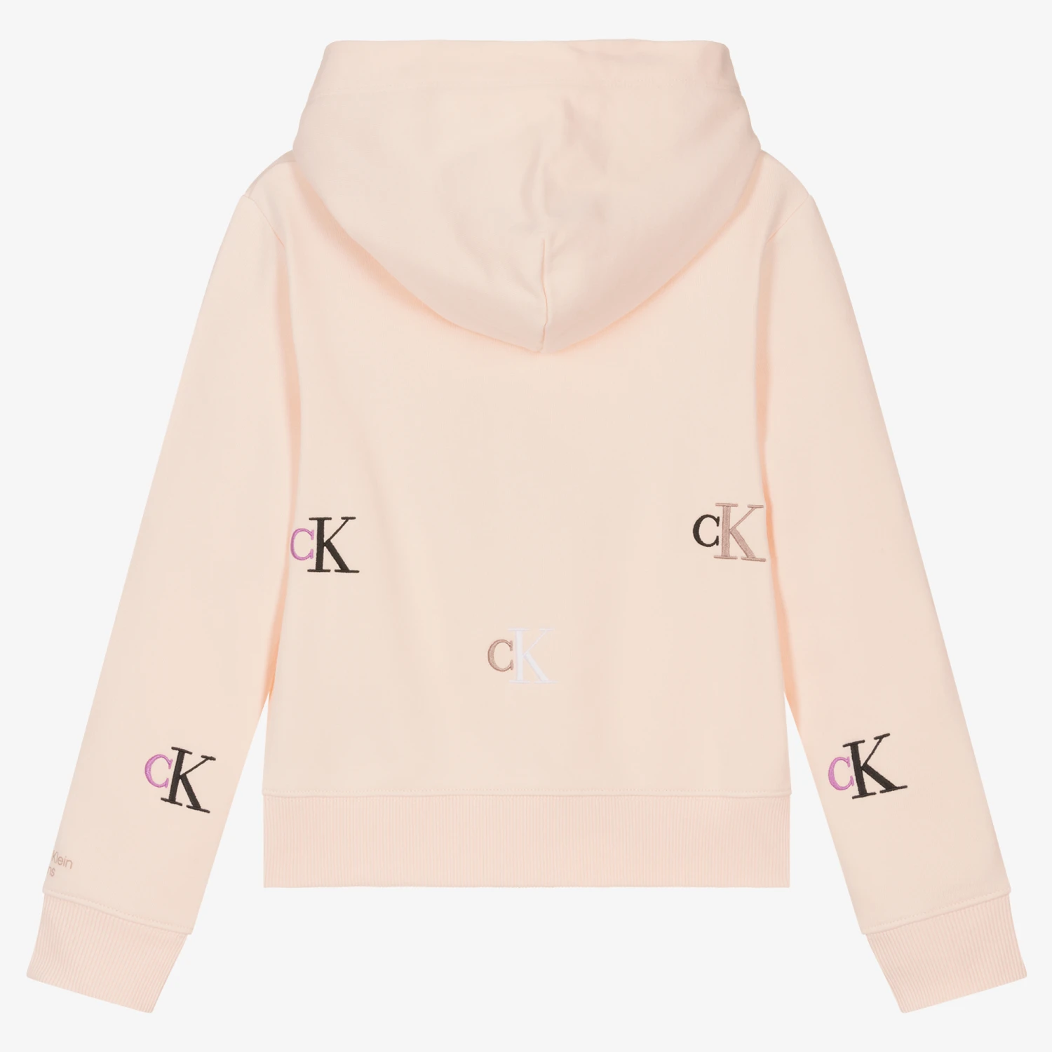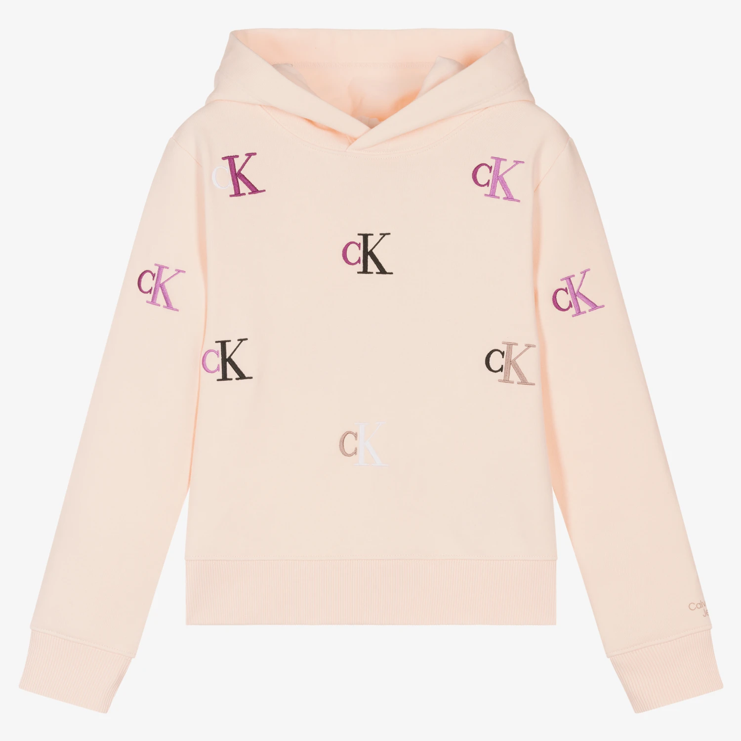Super comfortable and stylish pale pink hoodie for teen girls by Calvin Klein Jeans. Unmistakably Calvin, it has all-over CK monogram logos embroidered in varied colourways for an alternating look. This garment contains at least 40% organic cotton and 10% recycled polyester.
