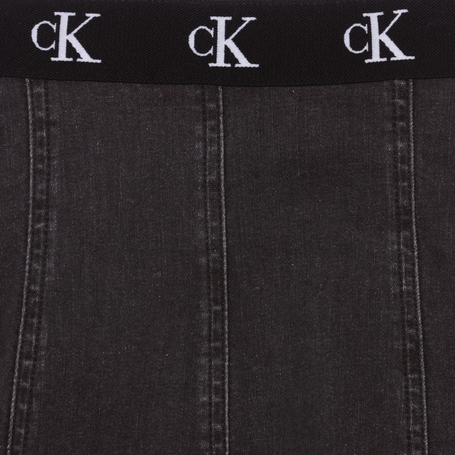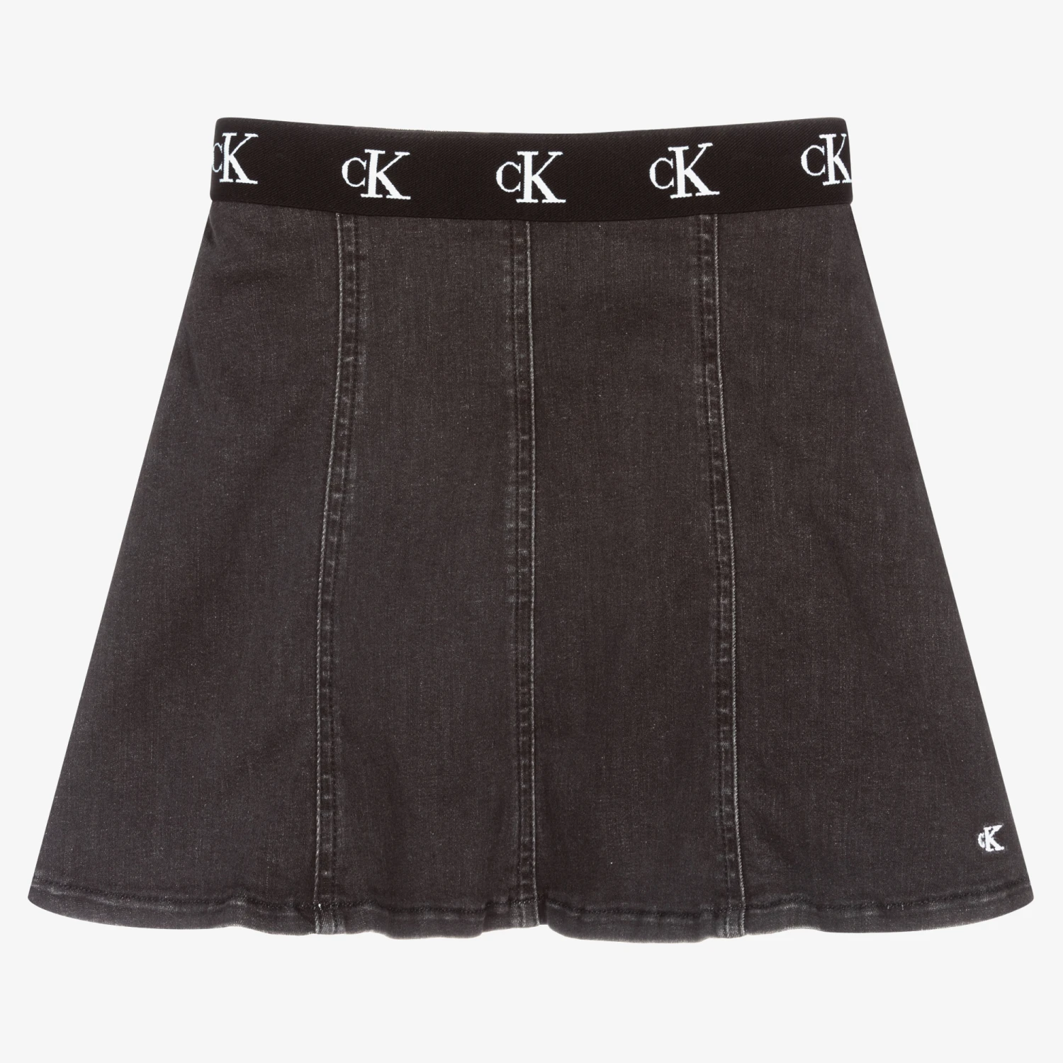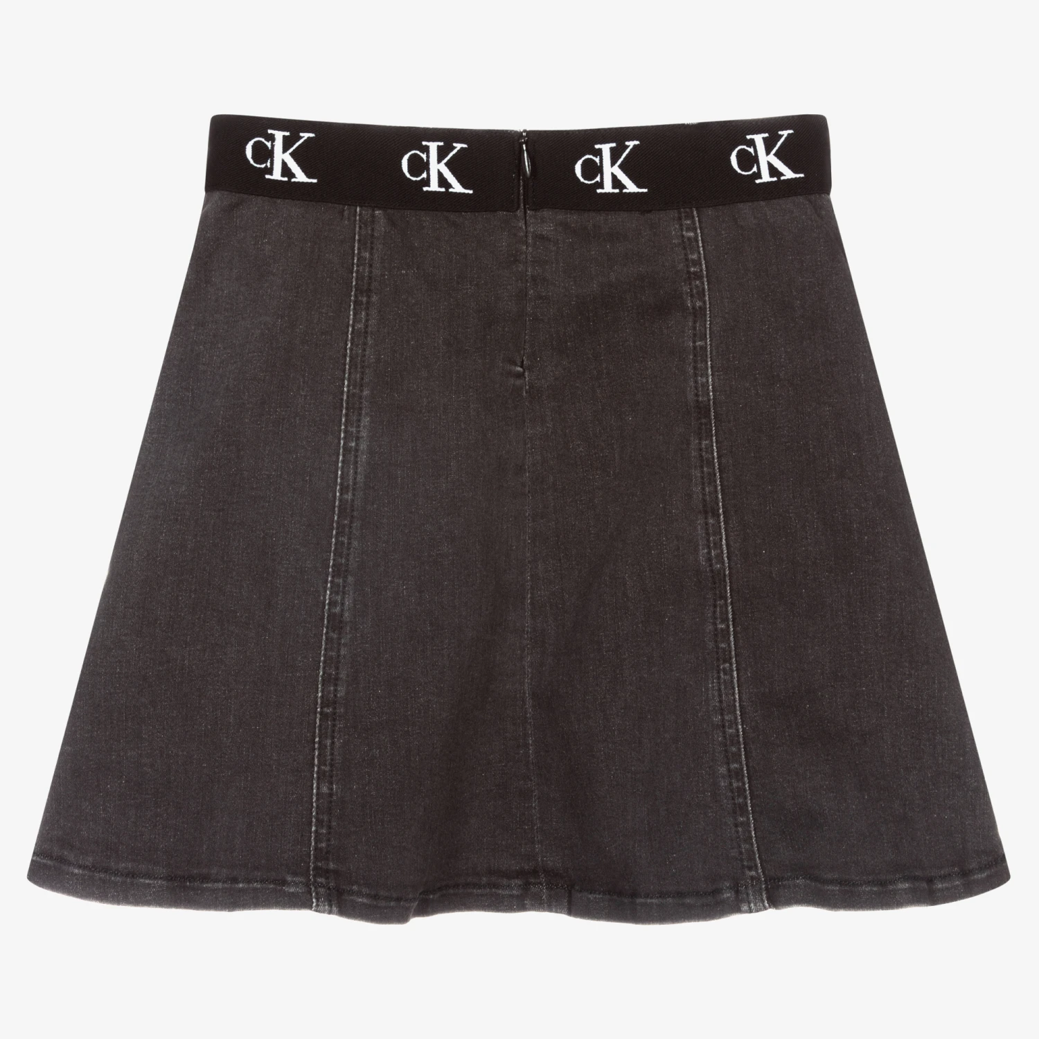Teen girls dark grey wash skirt by Calvin Klein Jeans, made in advanced stretch denim for optimal comfort and freedom of movement. In a flared panel style with a back zip fastening, it has a black and white logo jacquard waistband and an embroidered white logo on the hem.