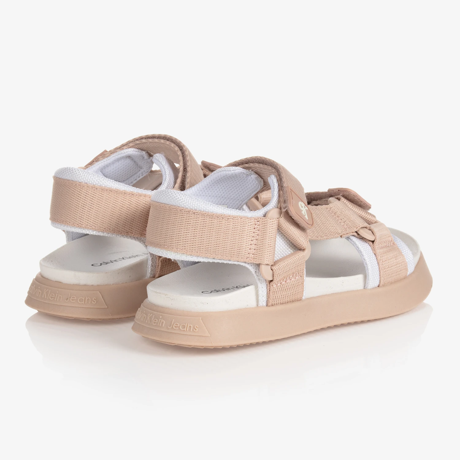 Pink sandals for teen girls by Calvin Klein Jeans, made with canvas webbing upper straps. These sporty, stylish sandals have velcro fastening straps across the toes and ankles with pink rubber trims and white raised rubber CK logos. The moulded inner soles are lightly cushioned and the outer soles are made in non-slip rubber.