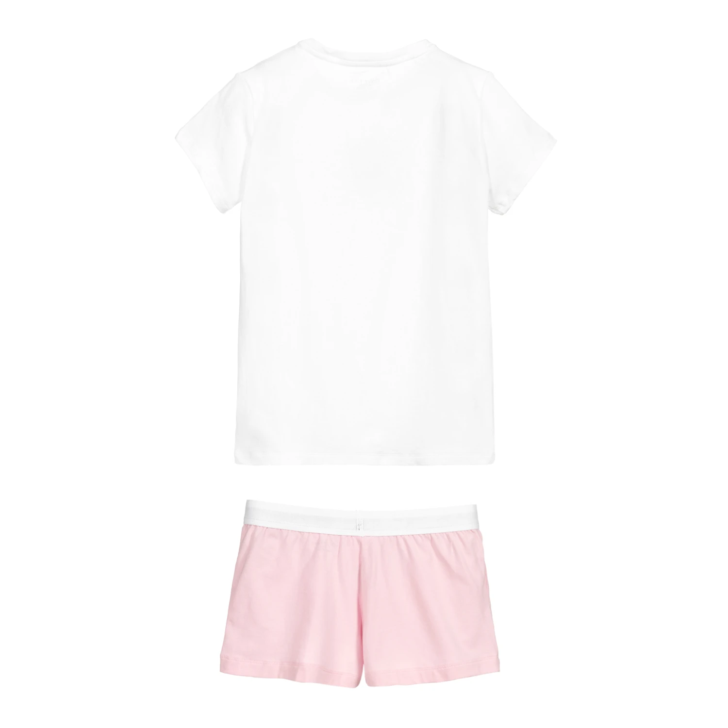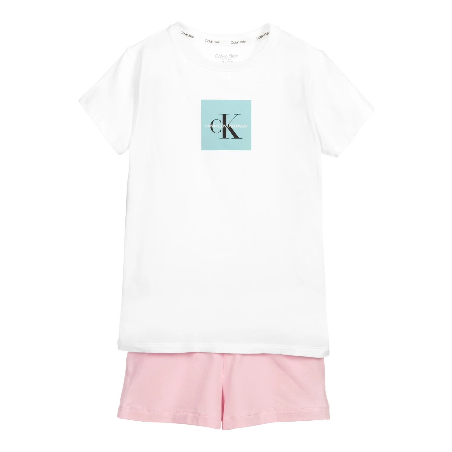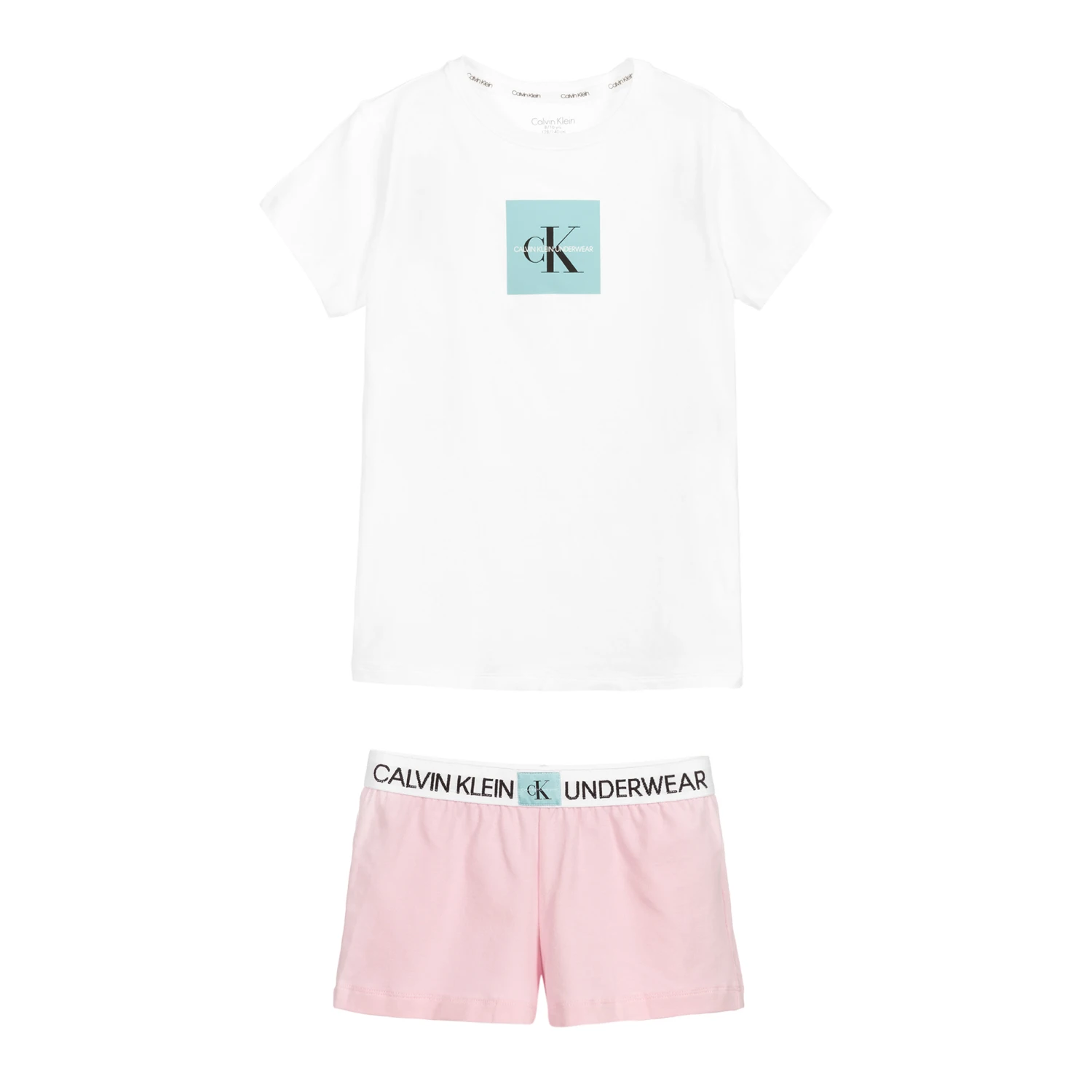 Teen girls comfortable cotton jersey pyjamas by Calvin Klein. The white top has a blue logo square on the front and the pink shorts have a branded waistband with an embroidered blue logo patch.