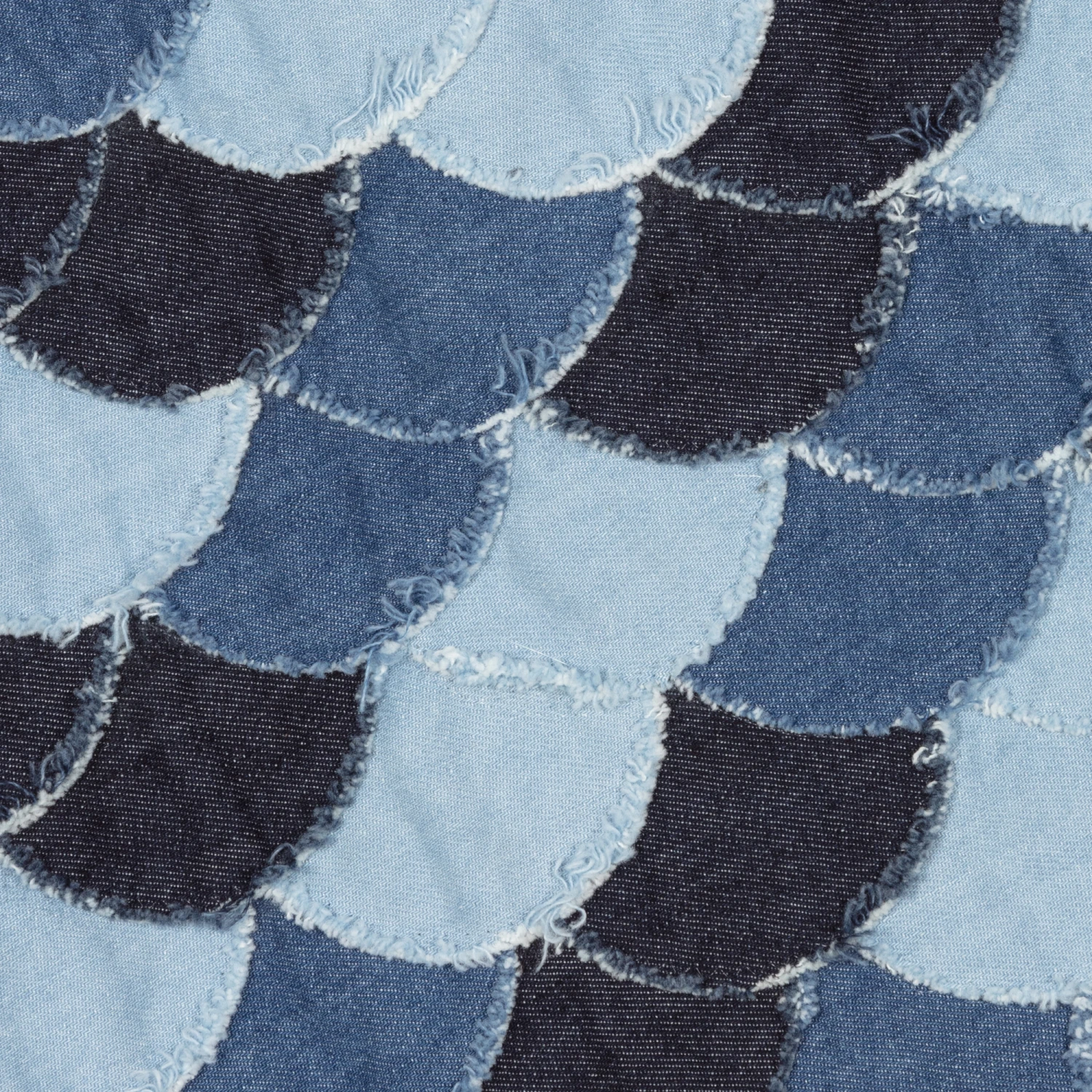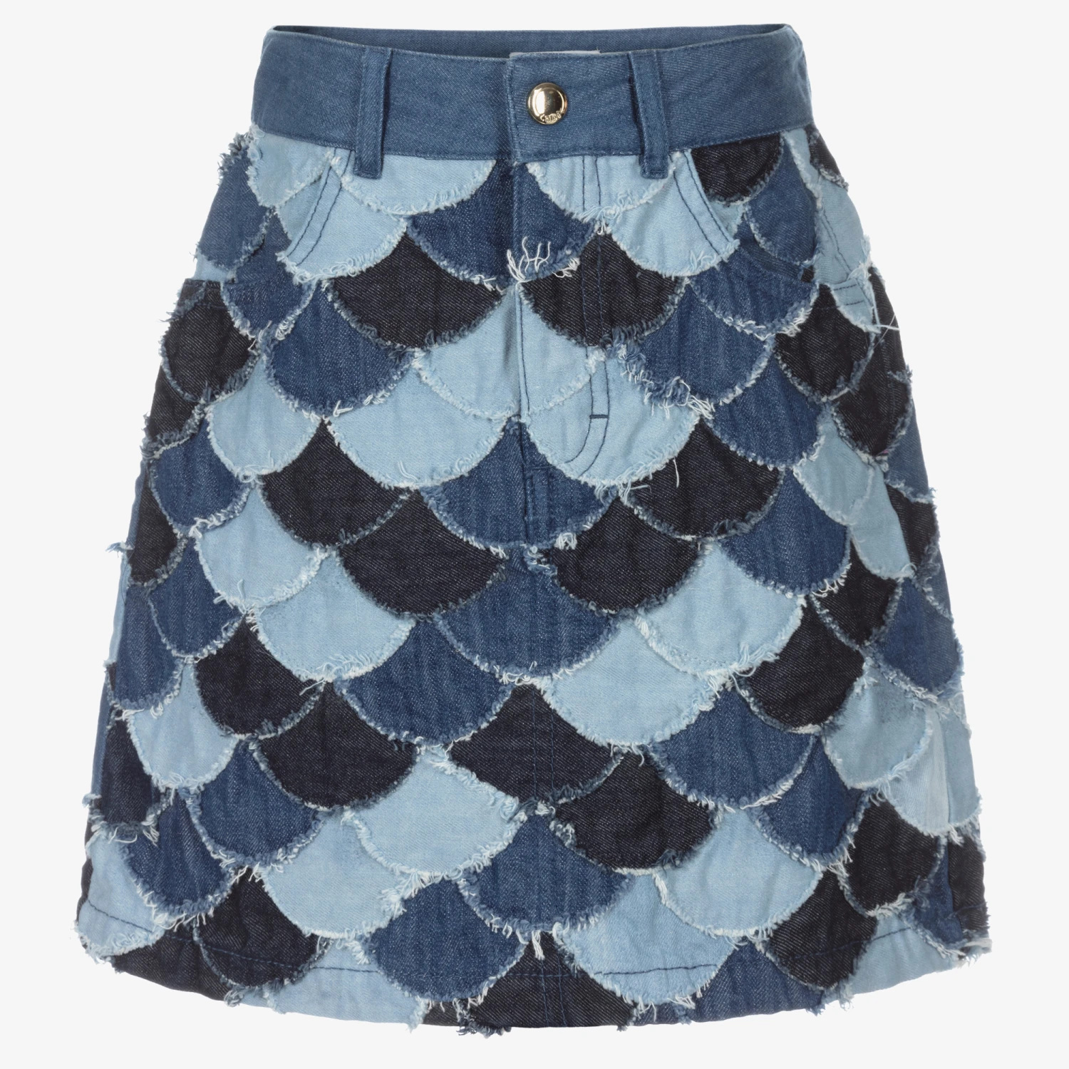 Blue patchwork style skirt for teen girls by luxury French designer Chloé, made in soft cotton denim. As seen in the adult collection, it is trimmed with layered, scalloped denim appliqués in shades of blue and has a lyocell lining. It fastens with a branded front popper and zip and has front pockets.