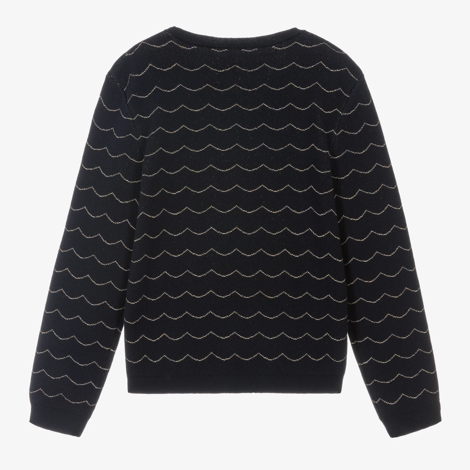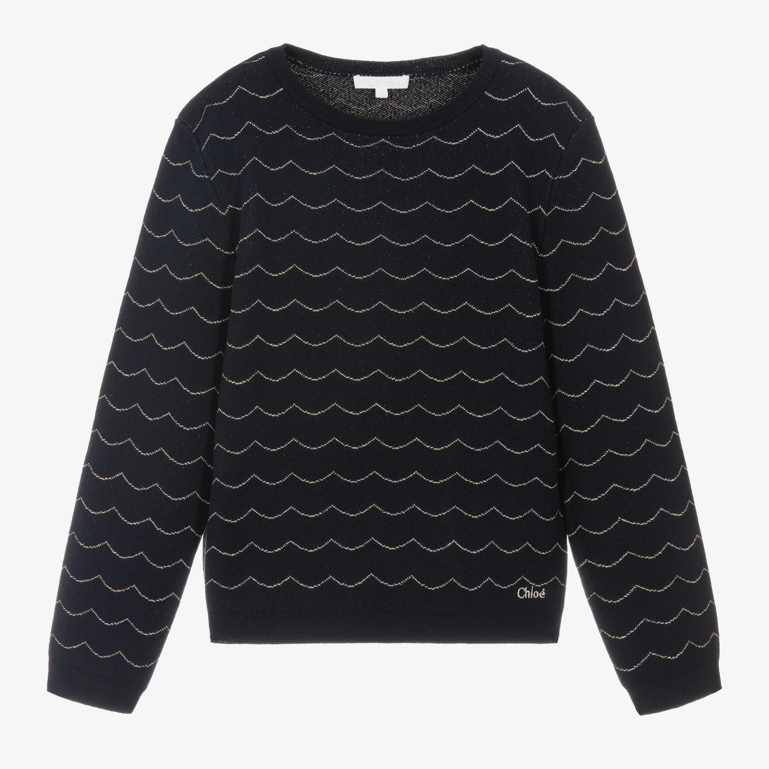 Navy blue sweater for teen girls by luxury brand Chloé, with a golden logo embroidered by the hemline, a scalloped gold pattern and sparkly gold thread in the weave. Classically styled and knitted in a super soft cotton, wool and viscose blend, it has a crew neck and ribbed trims for comfort and warmth.