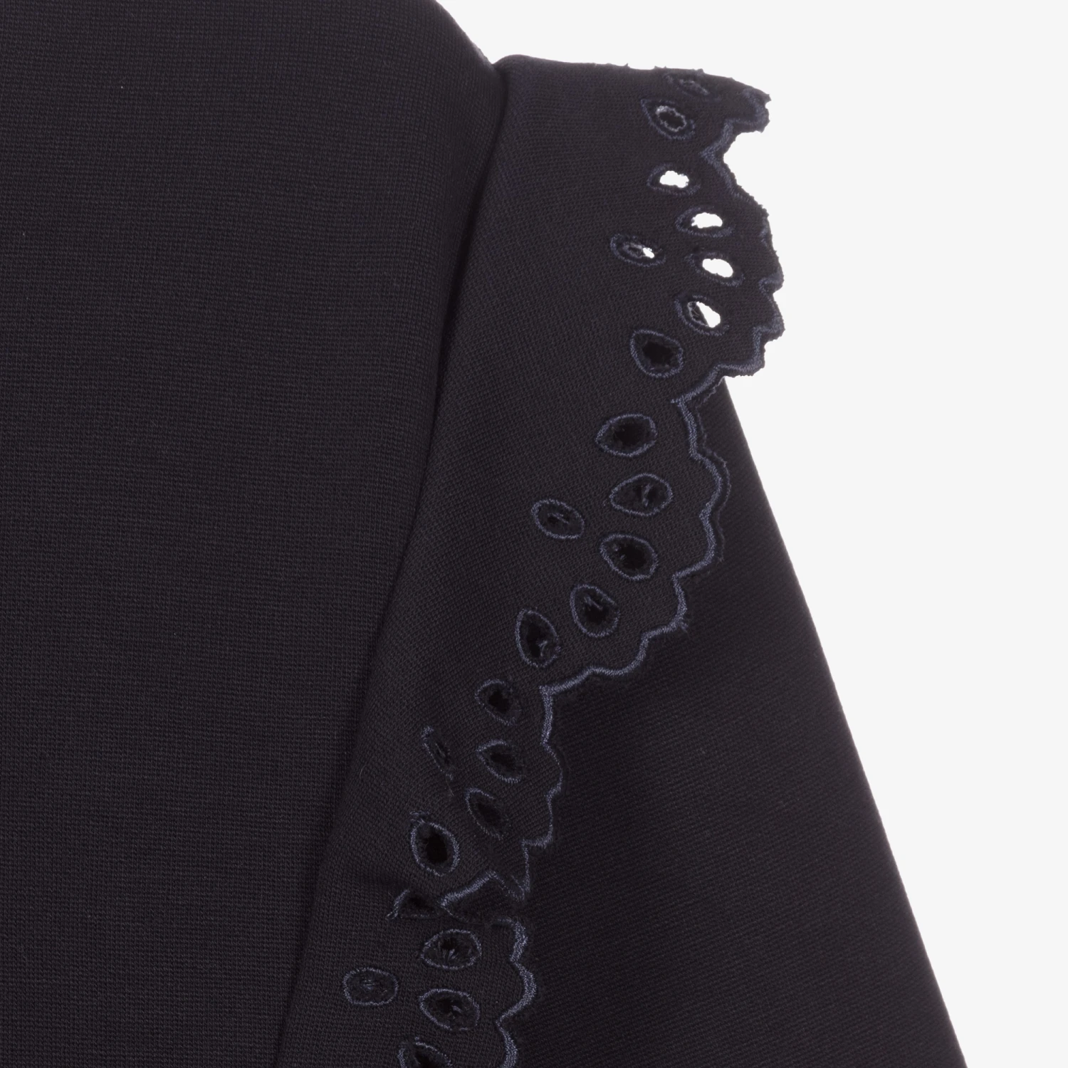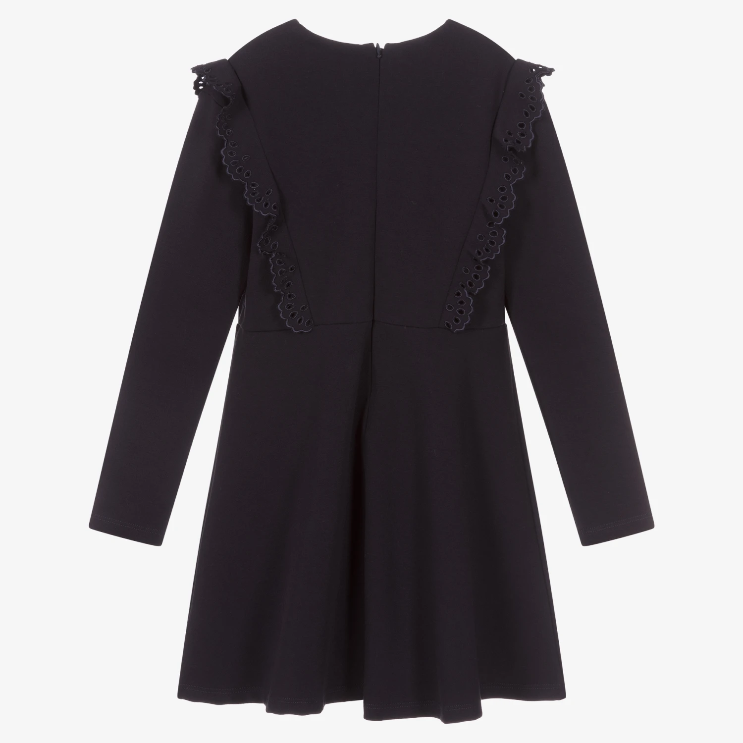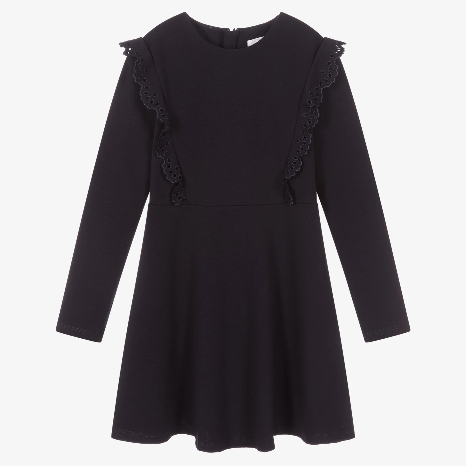 Pretty navy blue dress for teen girls, by luxury French designer Chloé. Trimmed with gorgeous ruffles on the bodice with intricate floral cut-out details, it has subtle logo embroidery near the hem, and is made in a soft modal jersey blend.