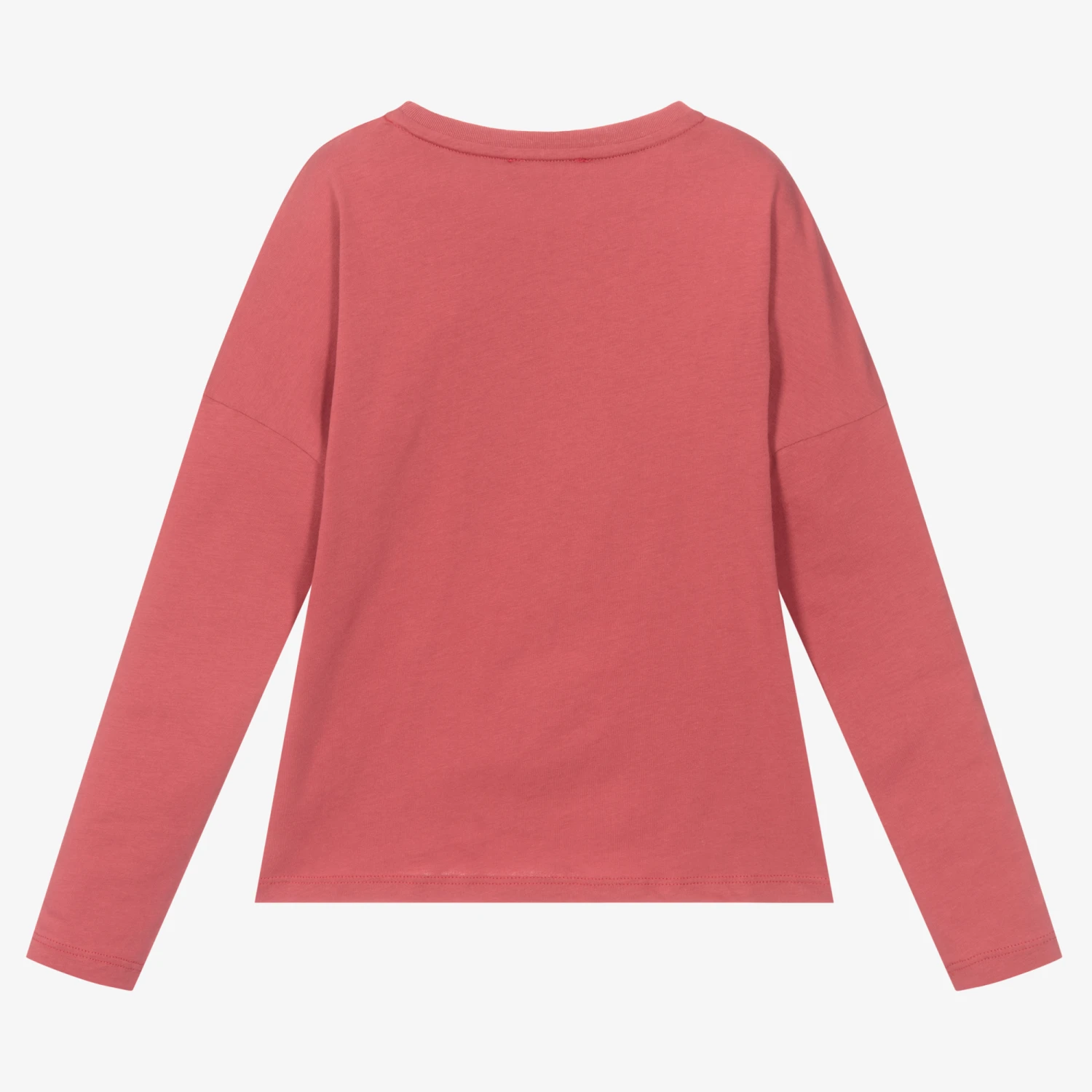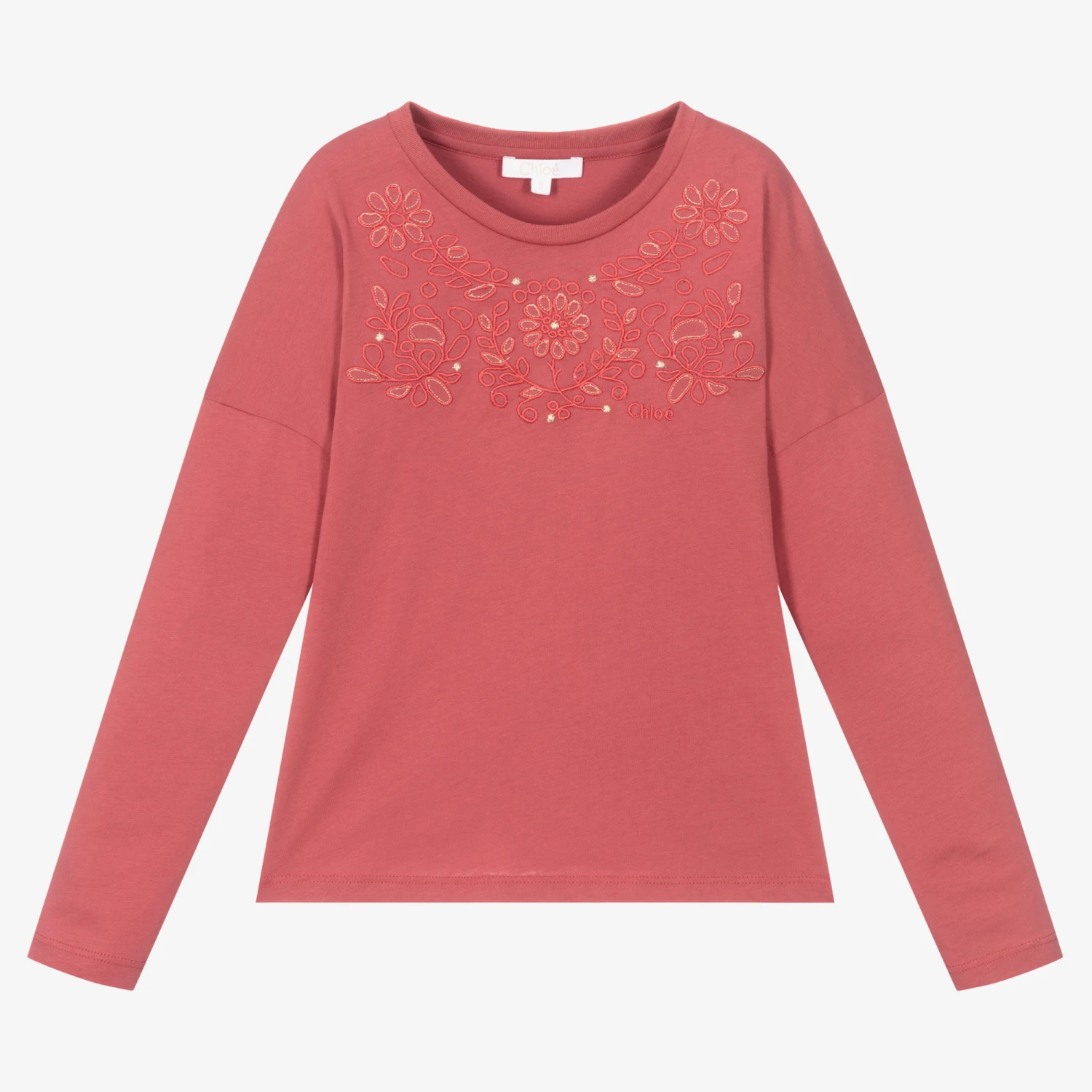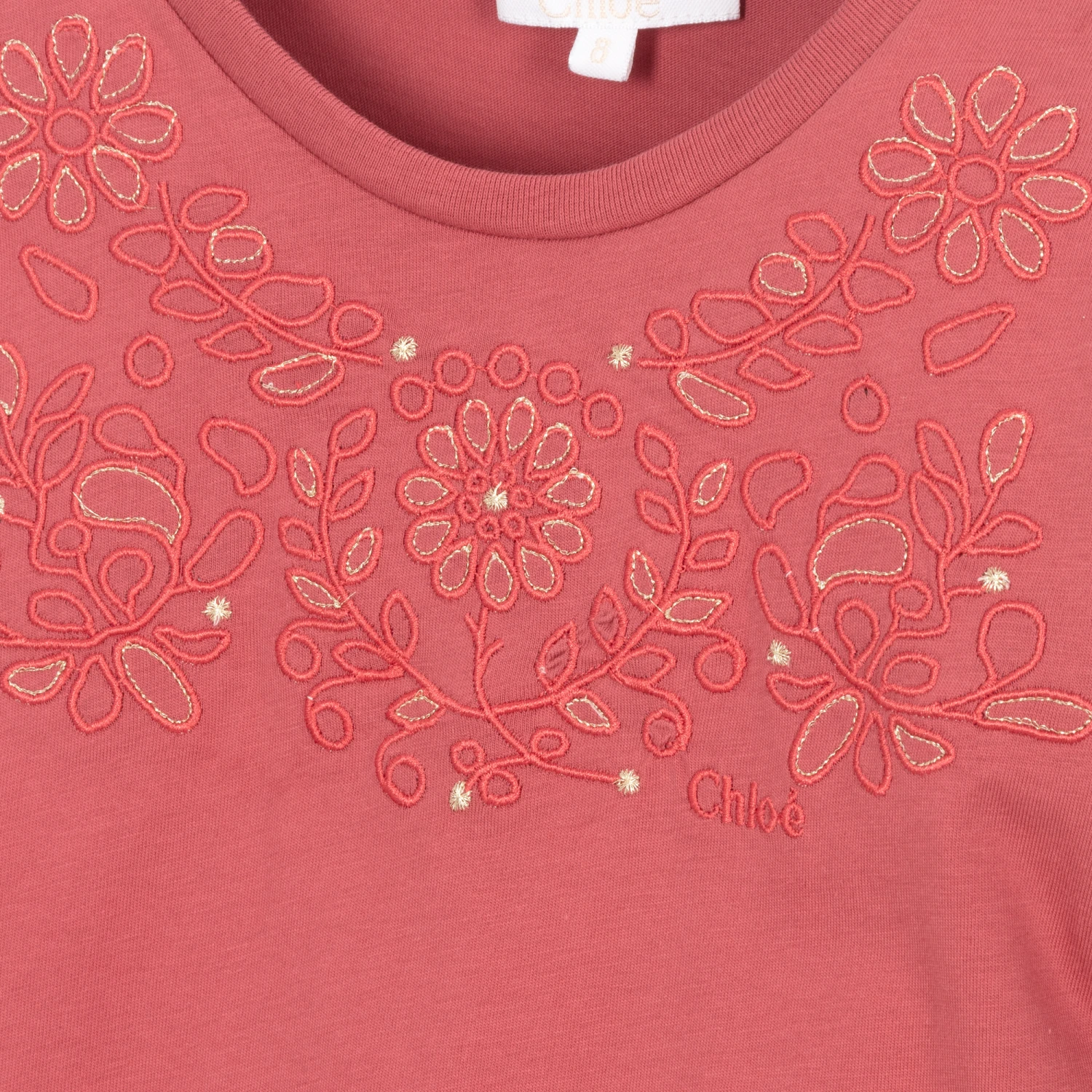 Terracotta pink top for teen girls by luxury French designer Chloé, made in soft organic cotton jersey. The front is intricately embroidered with floral details and the brand’s logo in pink and gold. Stylish dropped shoulders complete this chic top.