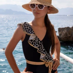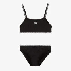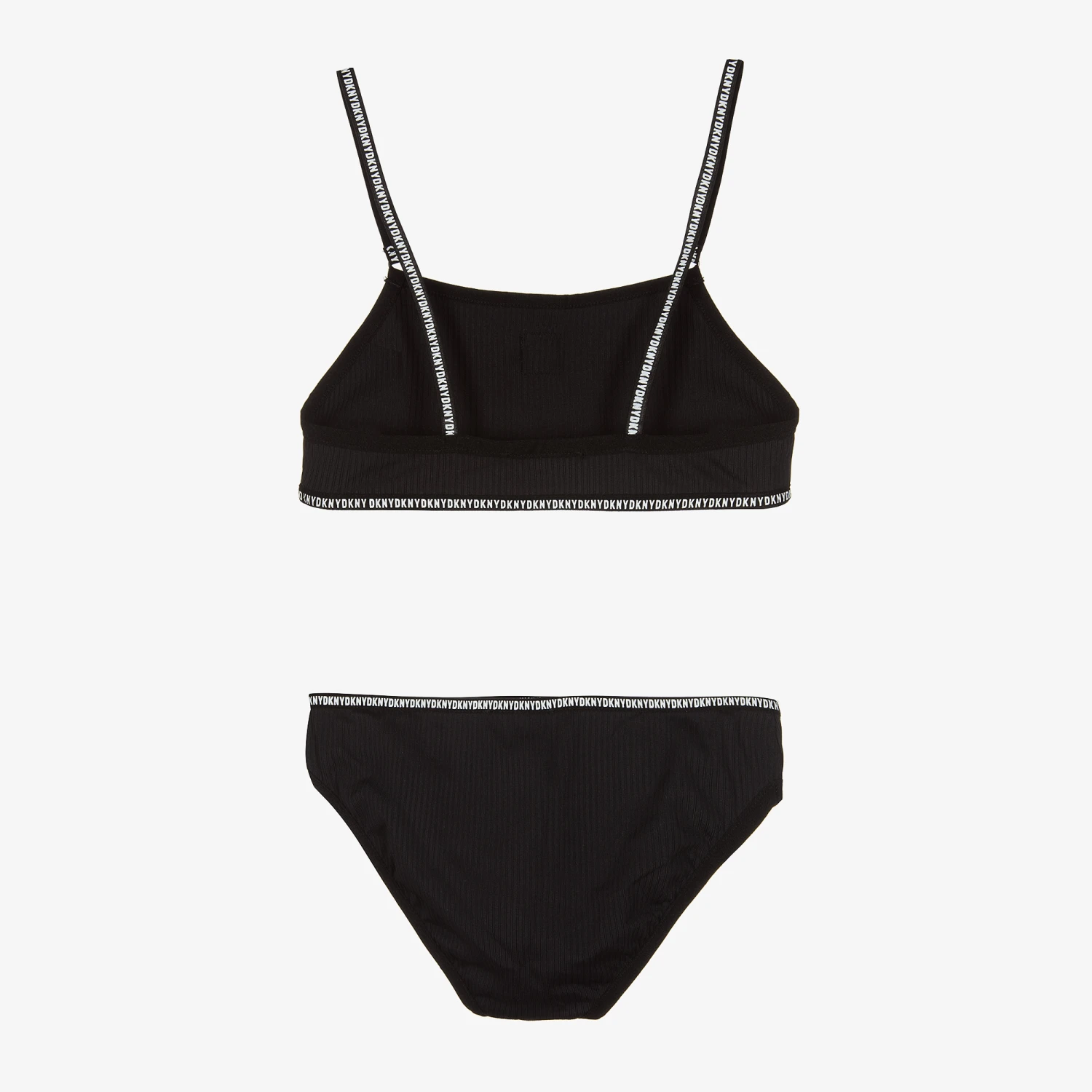 Black bikini for teen girls by DKNY, with a black and white rubberised logo patch on the chest. Made in a seamless ribbed knit, the bikini top has thin elasticated shoulder straps for a great fit. The straps and waistband are trimmed with logo branding and both pieces are fully lined for added comfort.