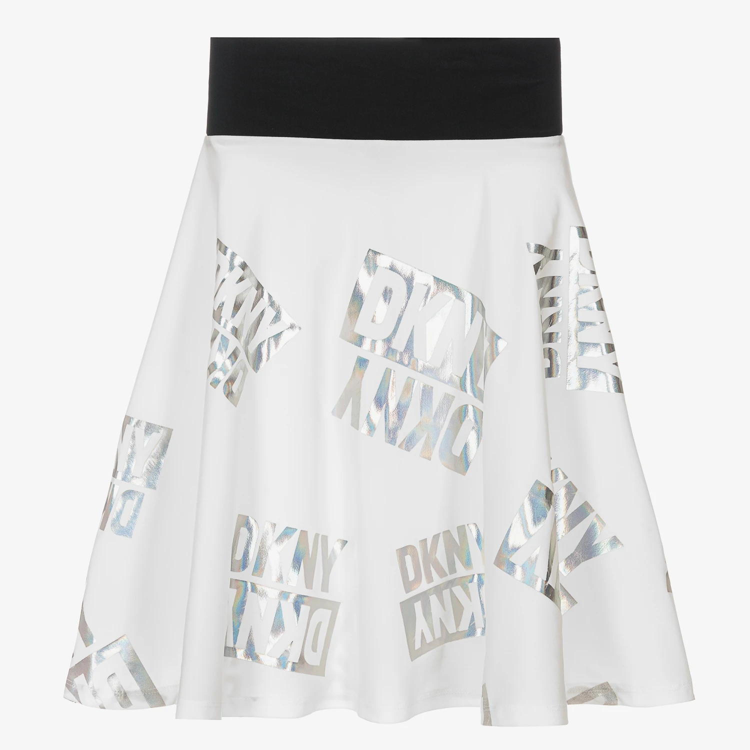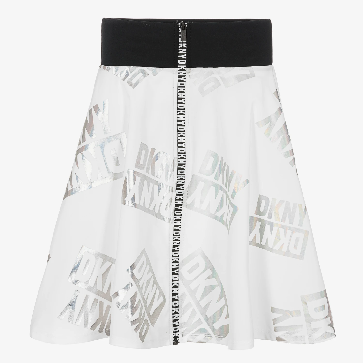 Ivory skirt for teen girls by DKNY, with an all-over logo design in a metallic silver iridescent print. Soft and silky, this trapeze-shaped skirt has a wide black waistband with a black and white branded zip fastening on the front.