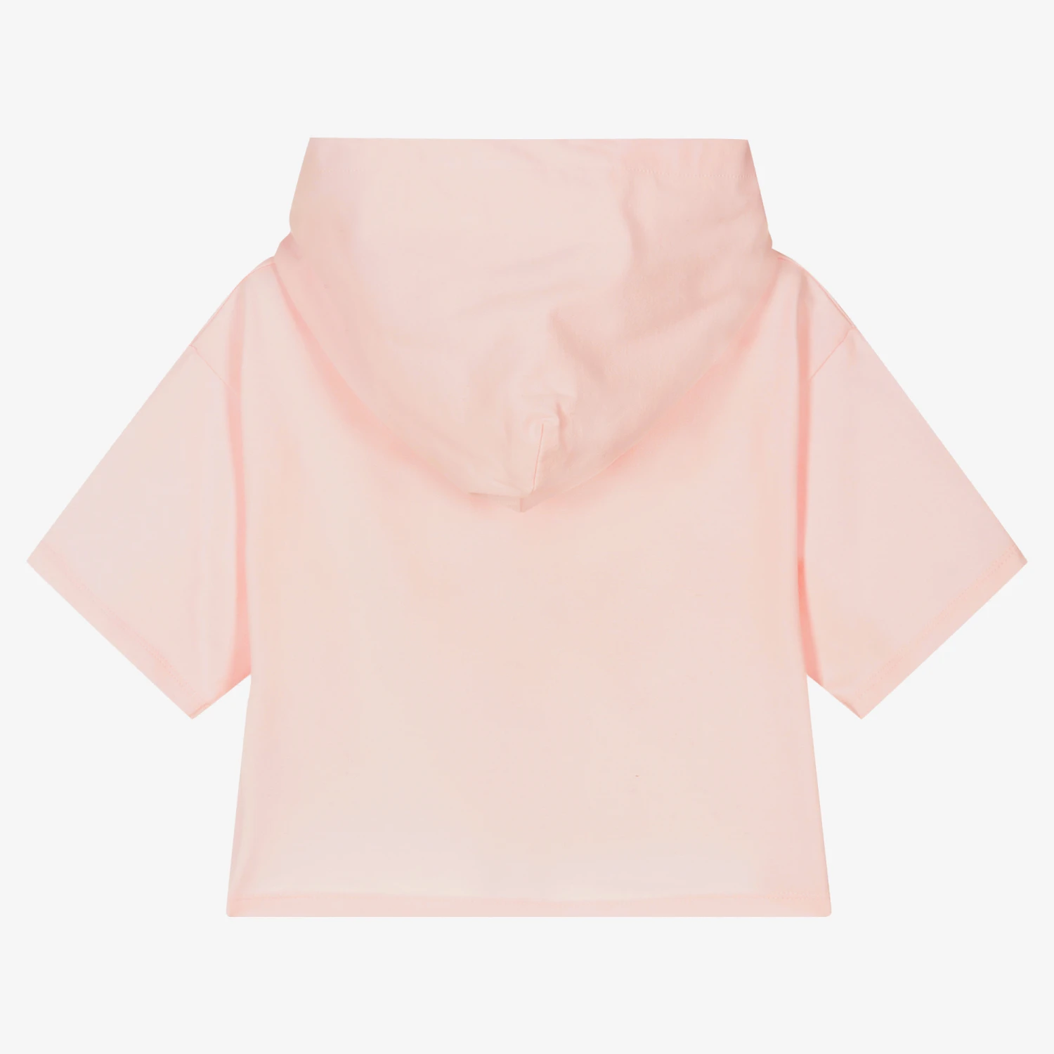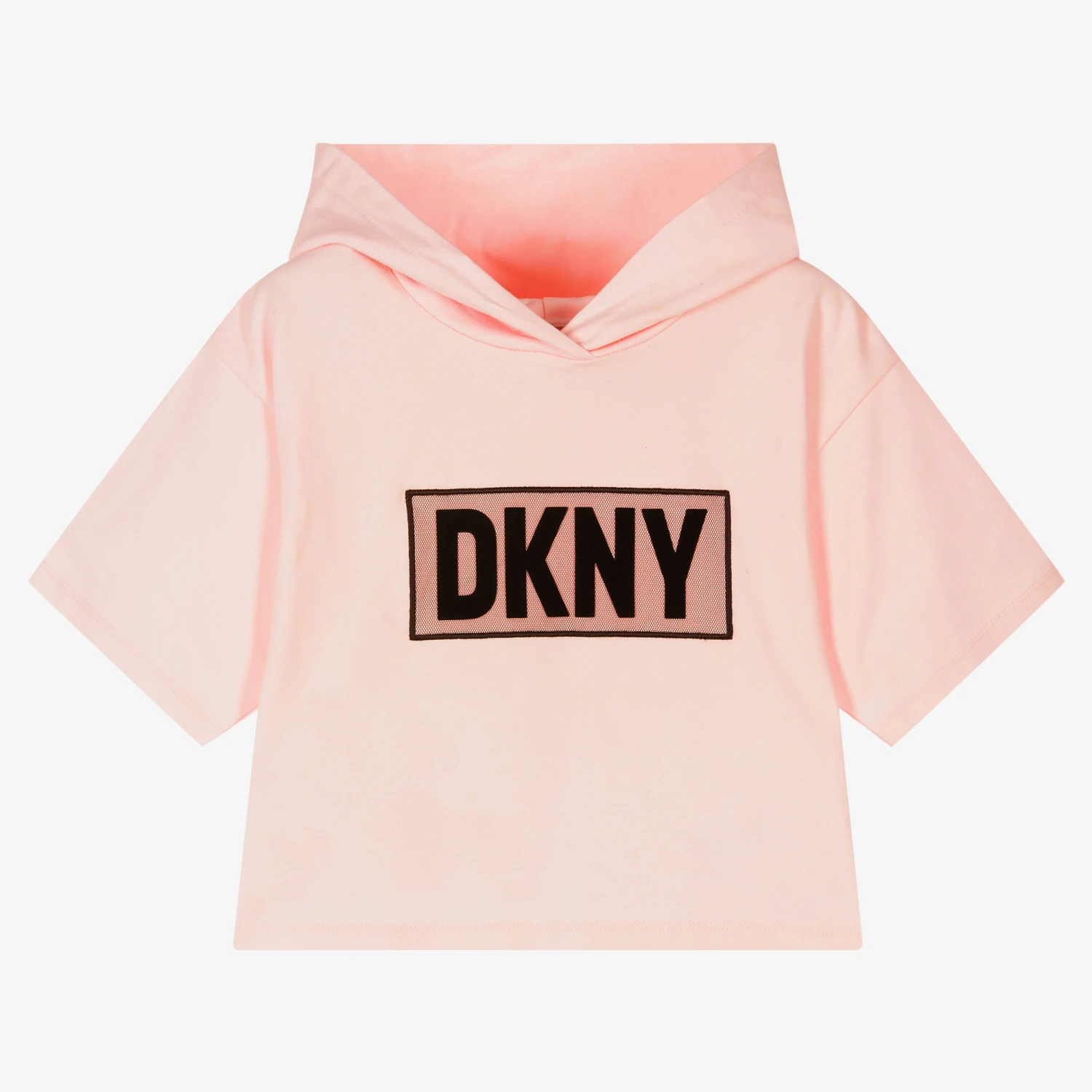 Pale pink hooded T-shirt for teen girls by American brand DKNY, with a flocked black logo on a tulle panel. It is made in soft, lightweight cotton jersey.