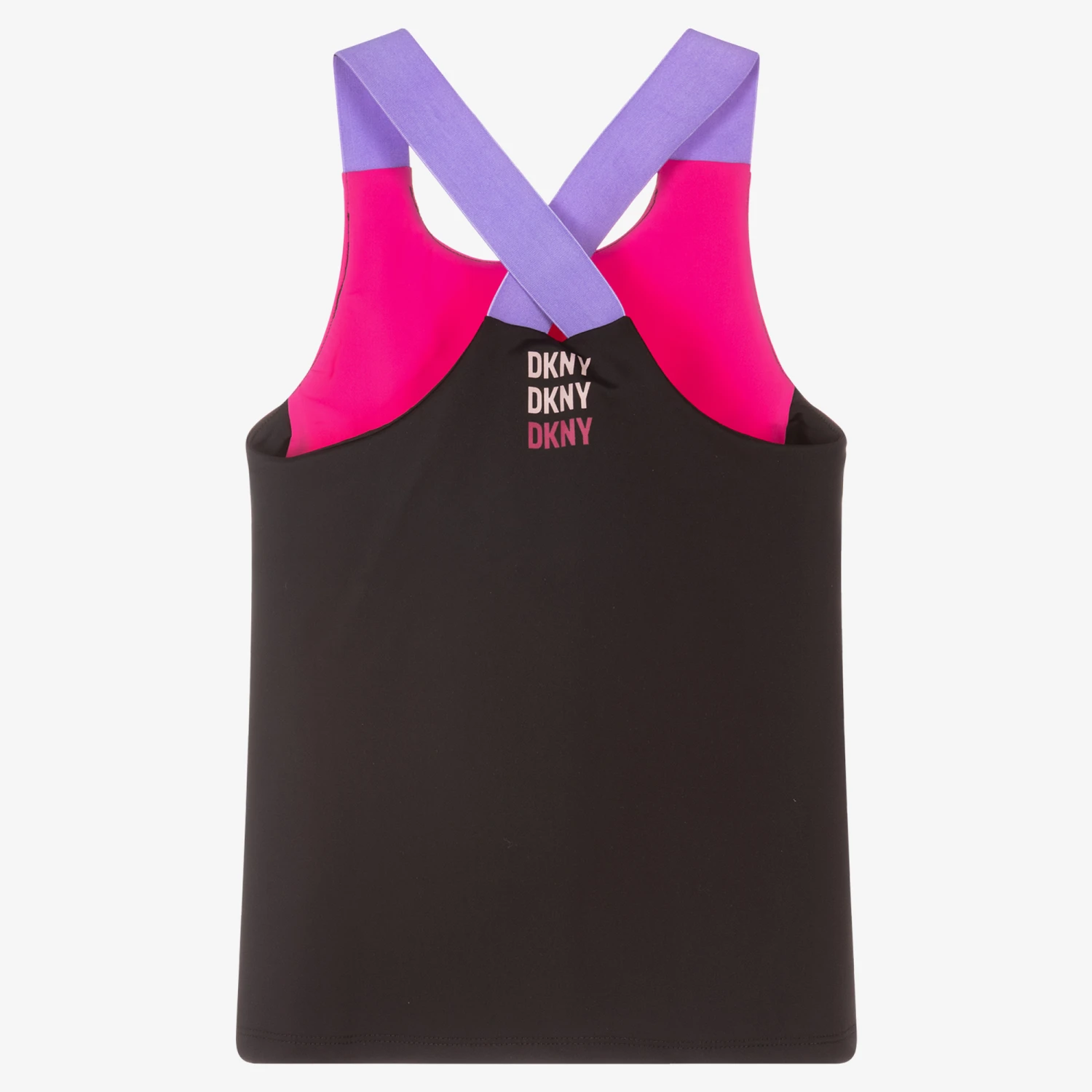 Sporty fuchsia pink and black sports top for teen girls by DKNY, with lime green logo prints on the front and back. It is made in stretchy nylon jersey with elasticated, cross-over purple shoulder straps.