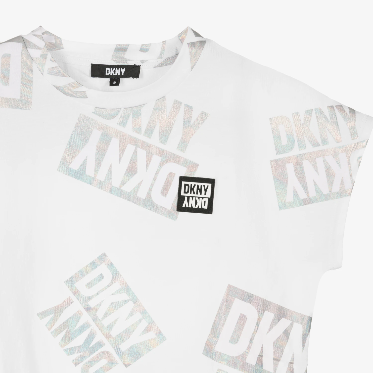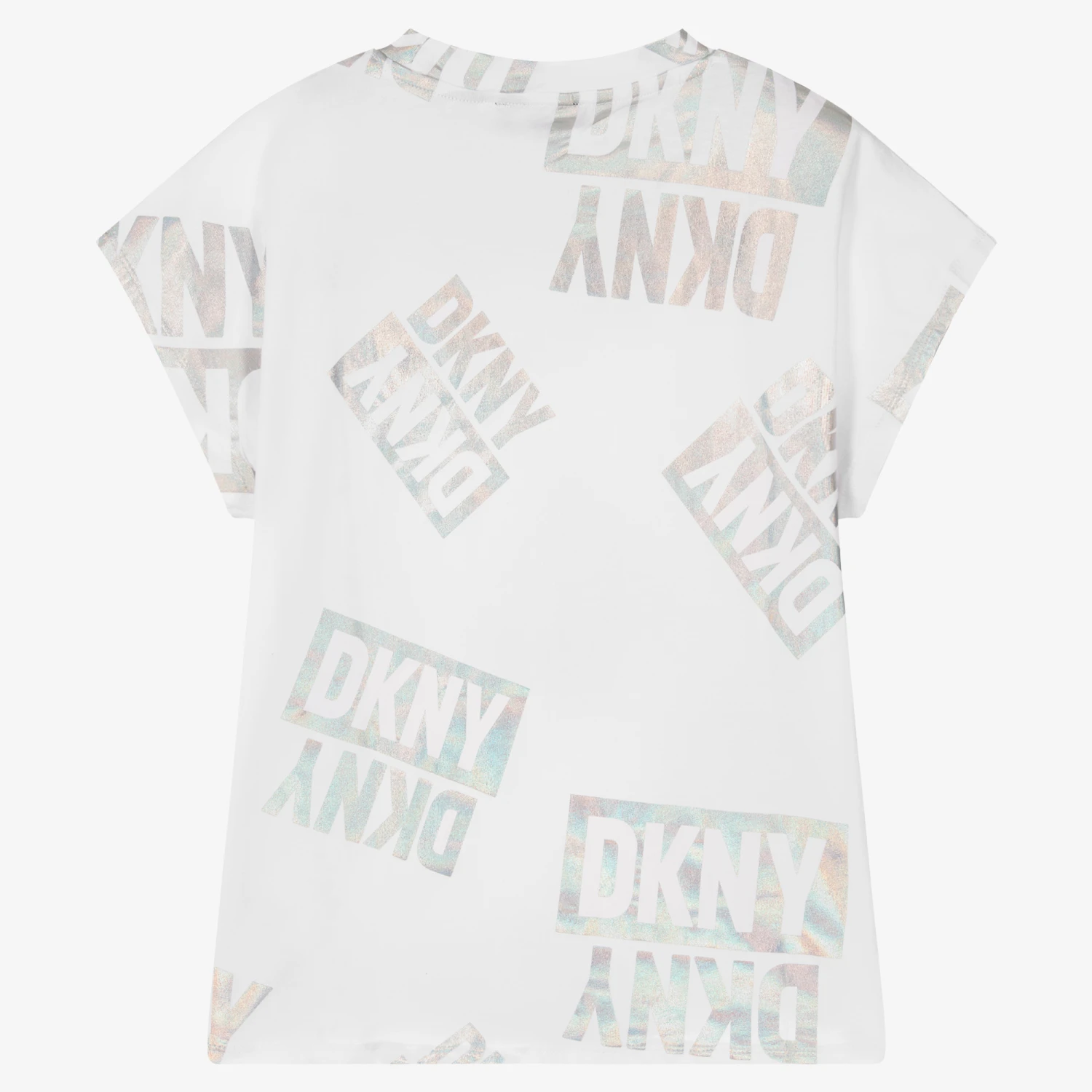 Teen girls white boxy fit T-shirt by DKNY, great for achieving a logo-inspired look. It has a black and white rubberised logo on the chest, with all-over logo prints in iridescent silver for an eye-catching fish. Made in soft cotton jersey, it effortlessly pairs with all your teen casual wear.