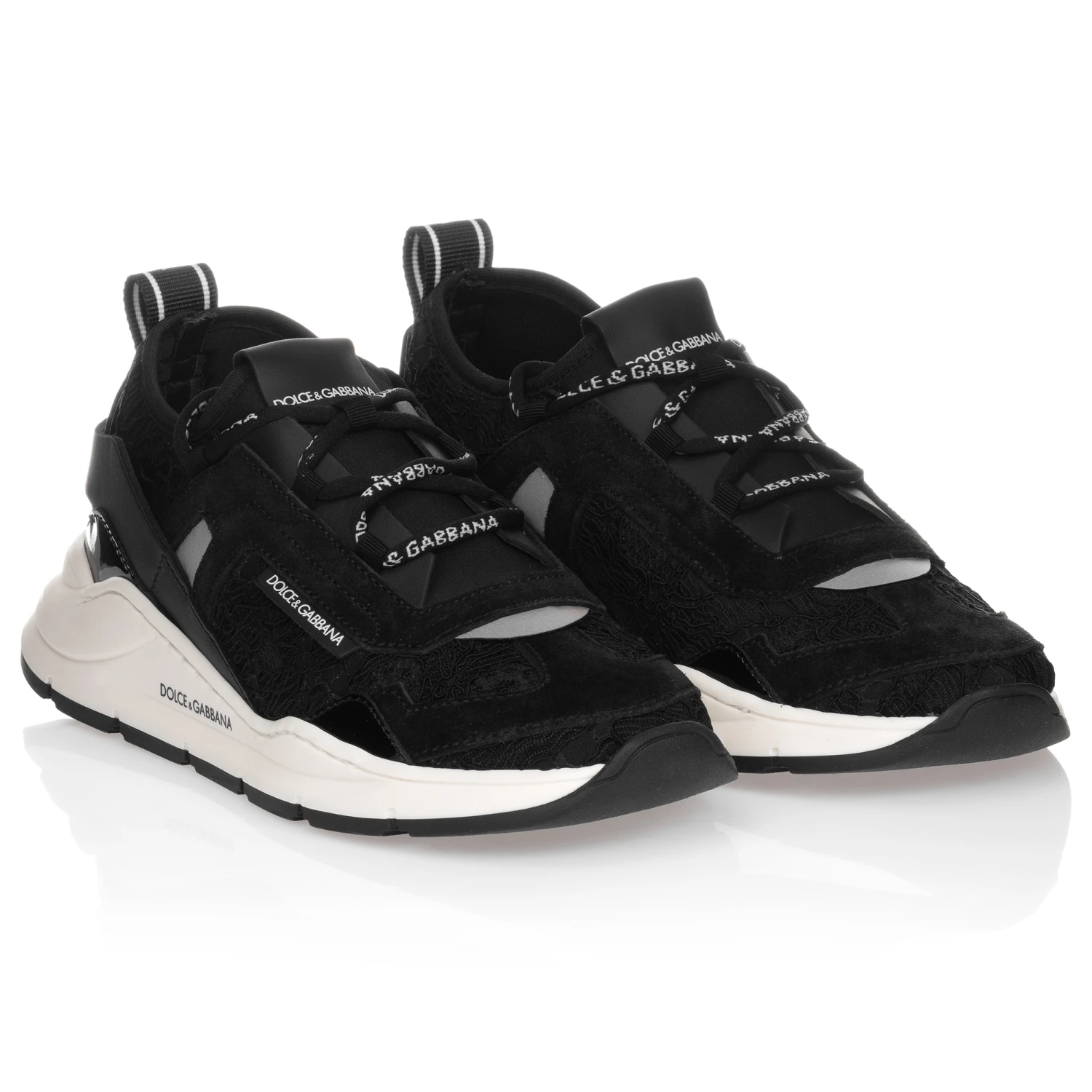 Teen girls black Daymaster trainers by Dolce & Gabbana. Made with pretty lace panels, they have logo branded laces, suede, patent leather and reflective trims. The leather-lined insole is lightly padded and there are branded heel pull tape. The ridged black and white outsole has a black logo print on the side.
