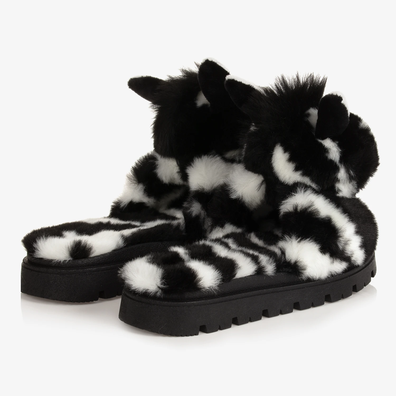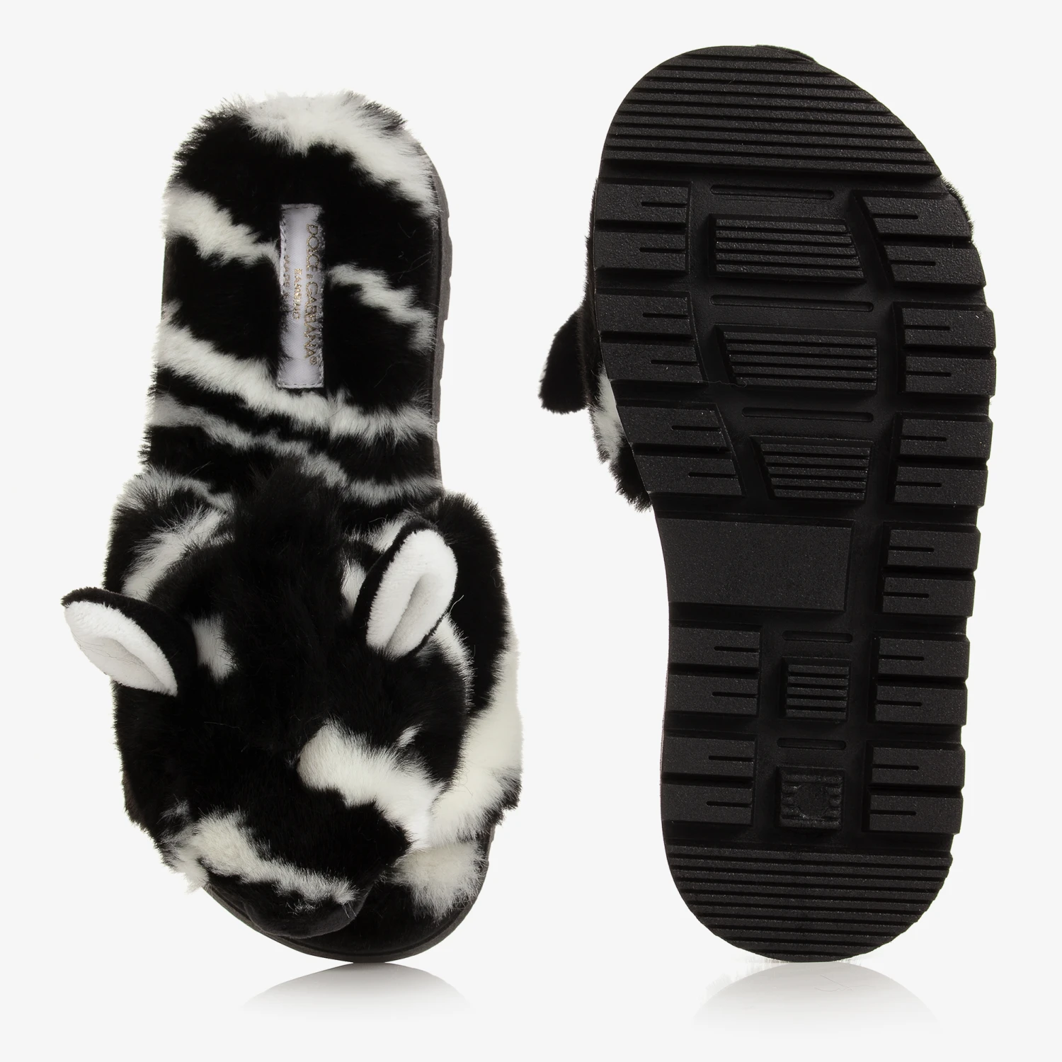 From Dolce & Gabbana, black and white faux fur sliders for teen girls. These eye-catching sliders have a 3D zebra face on the front and a deep tread sole for an alternative finish. The inner sole is lined with faux fur for added comfort.