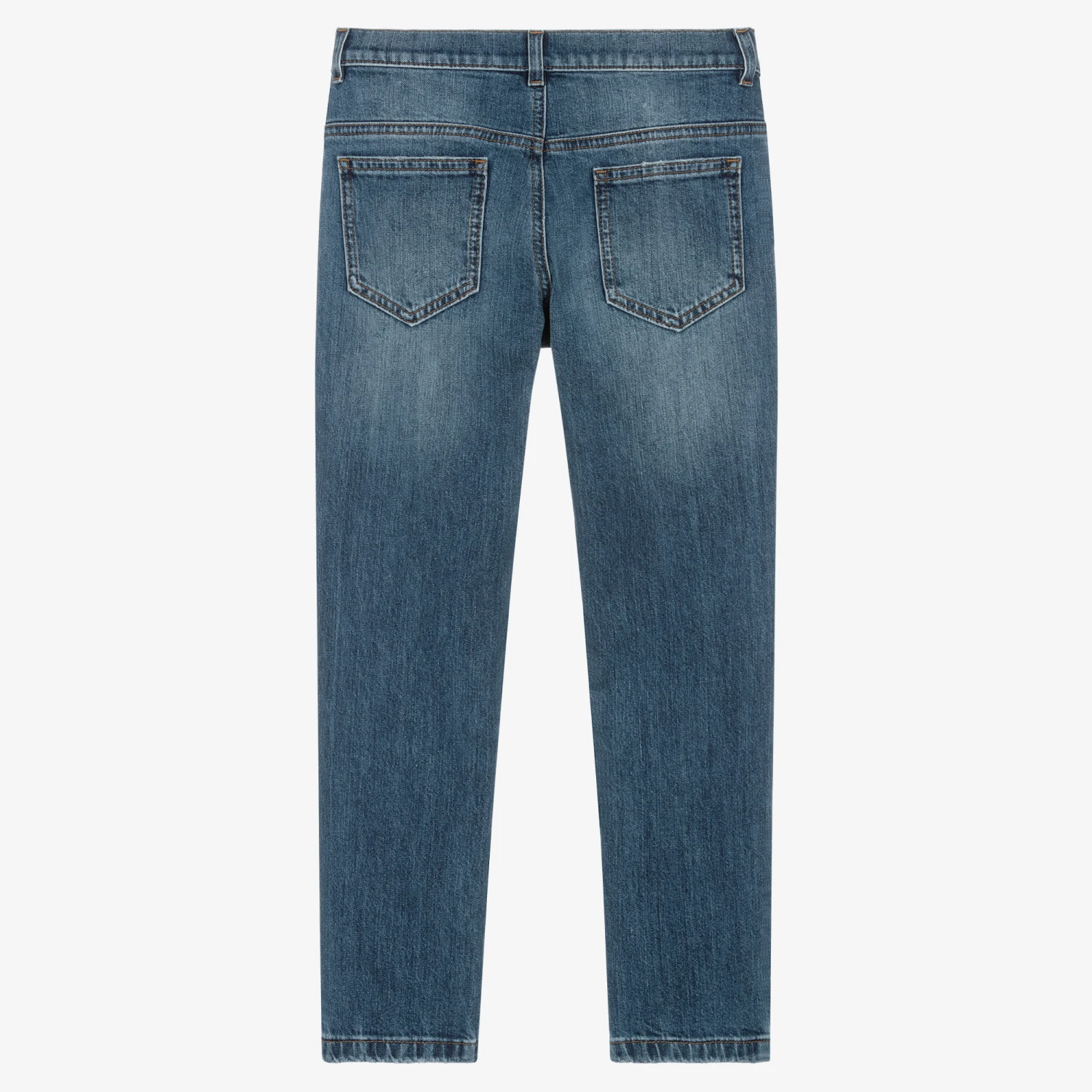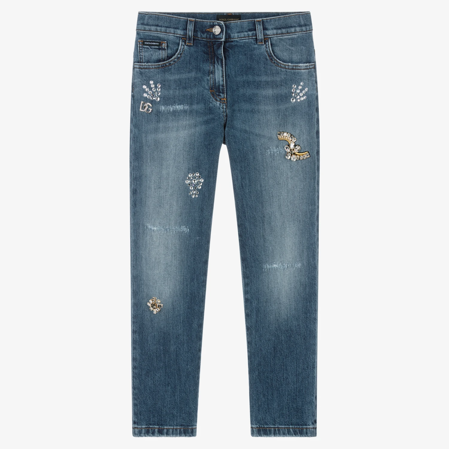Luxury jeans for teen girls by Dolce & Gabbana, made in mid-blue washed cotton denim with a gentle stretch and subtle distressed detailing. A classic five-pocket styling with a glamorous twist, the front is embellised with sparkly crystal gems set on gold metal frame, delicate embroidery and rhinestones. A branded silver metal DG logo and hardware give this casual piece an elevated look. They fasten with a button & zip on the front.