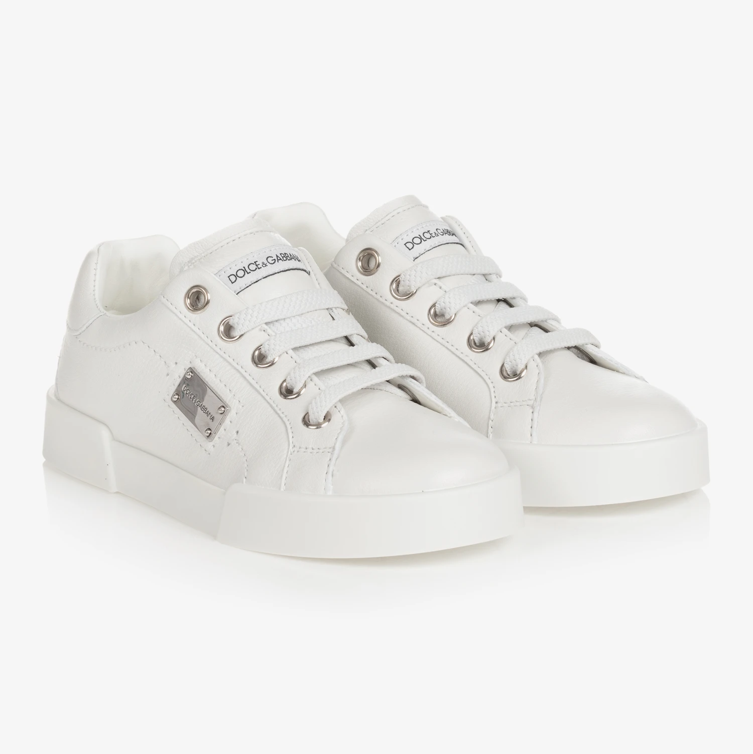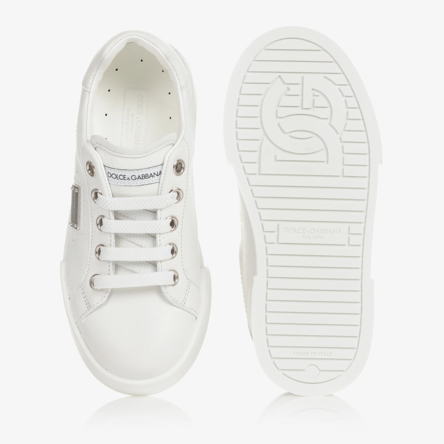 Designed by luxury Italian brand Dolce & Gabbana, these white low-top trainers for teen boys and girls are made in the designer’s Portofino style. Timeless and minimalist with a contemporary feel, they have shiny silver logo embossed plates on the sides for instant designer appeal. This versatile style is elevated by the iconic crossover DG logo, embossed on the non-slip rubber outer sole.
