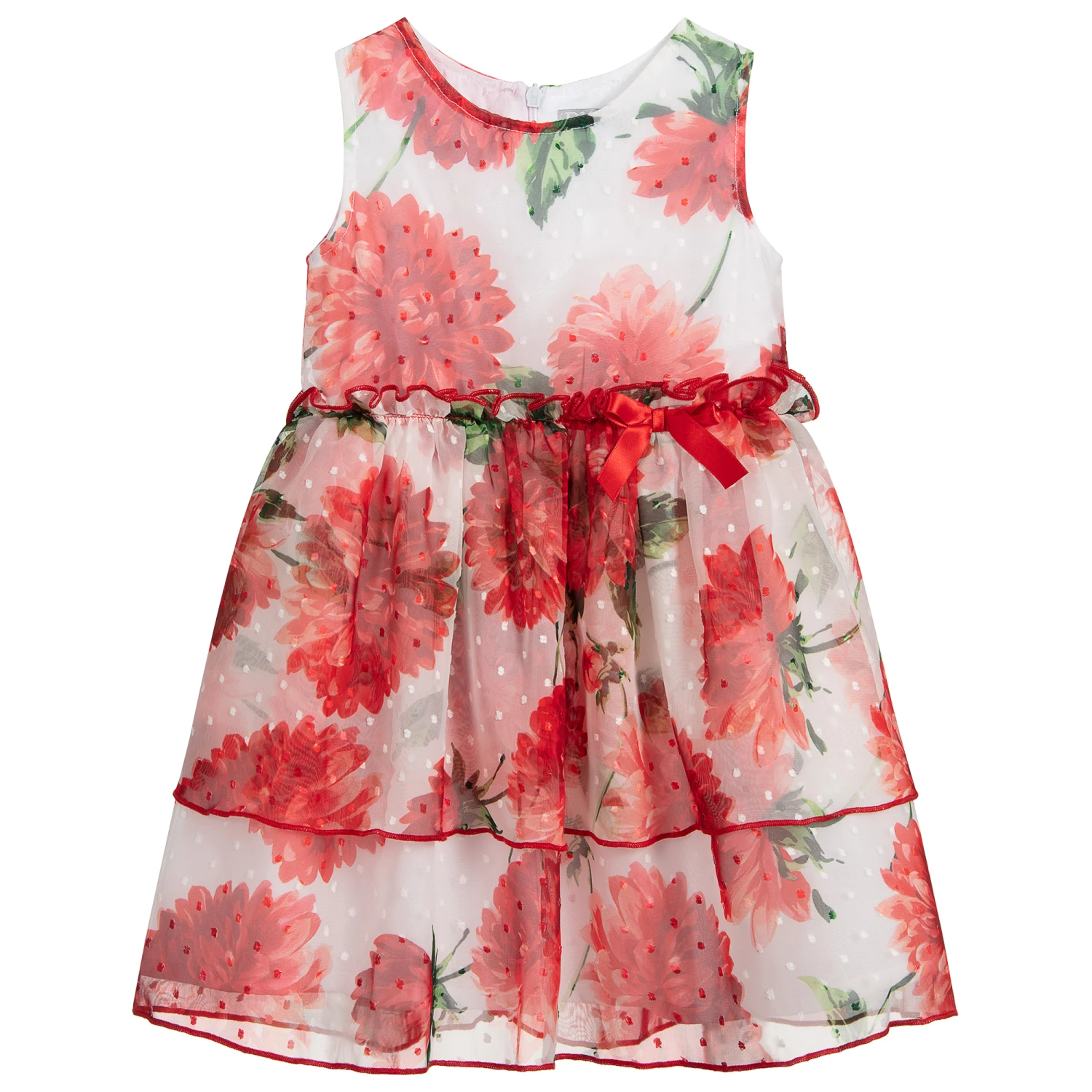 Teen girls white chiffon dress by Dr. Kid, with a red floral pattern. It has a tiered skirt, with a red satin ribbon on the ruffle waistband.