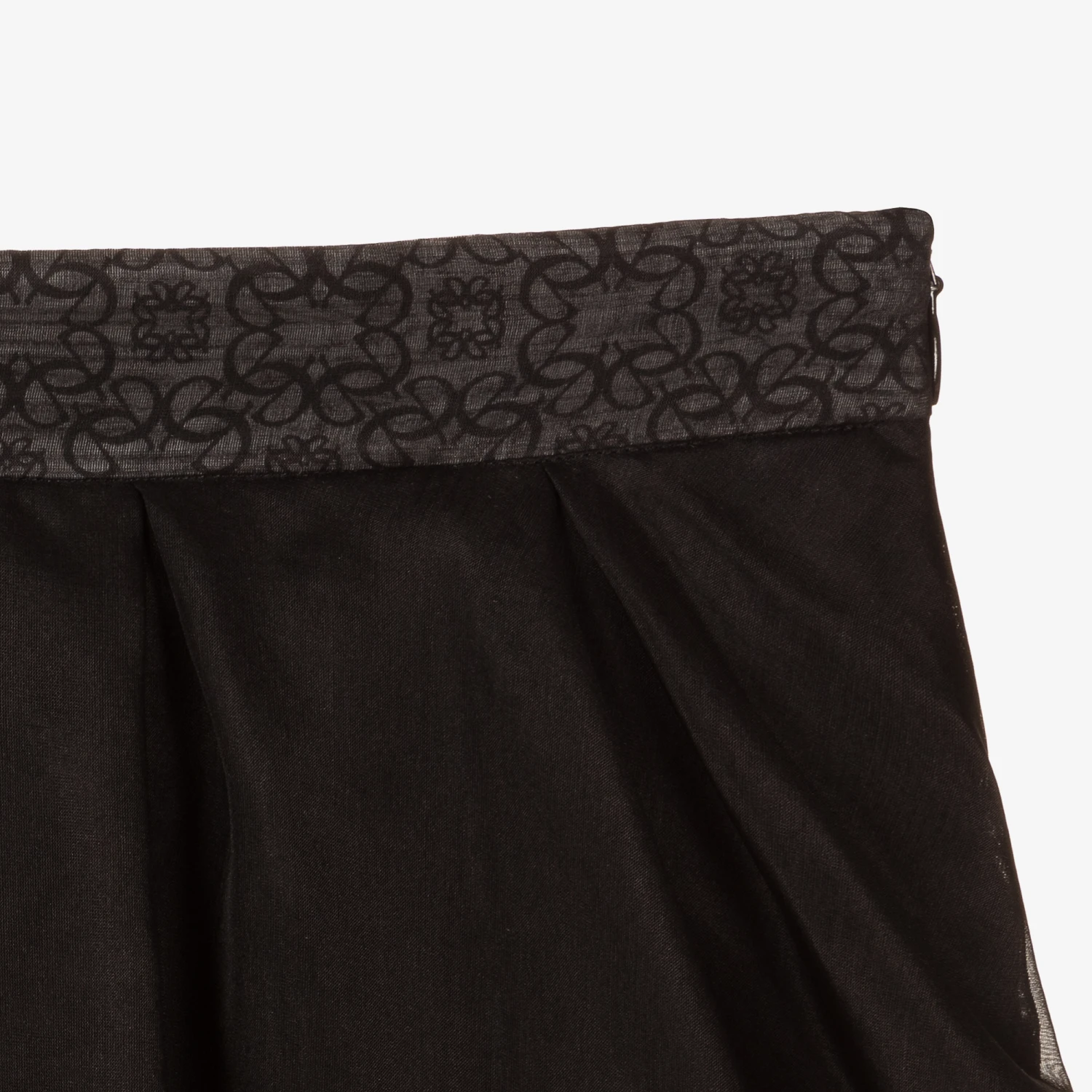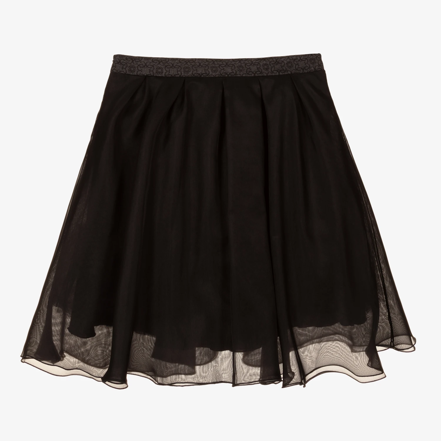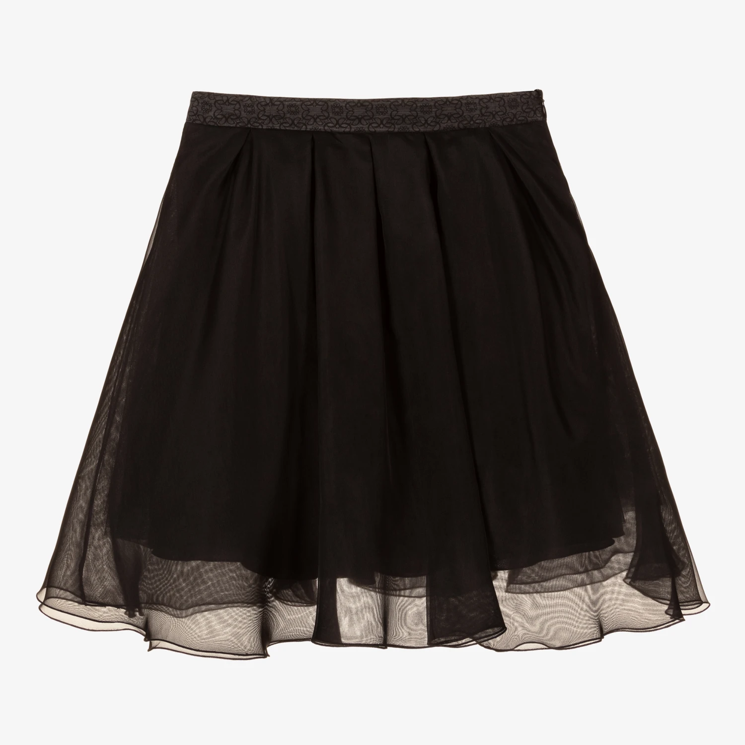 An elegant black skirt for teen girls by luxury brand Elie Saab, made in beautifully soft silk organza. Great for special occasions, this full and flared skirt has a patterned waistband with a subtle logo design. Finished with box pleats, it is fully lined in soft cotton voile and lightweight tulle for structure and volume. It has a neat, concealed zip fastening on one side.