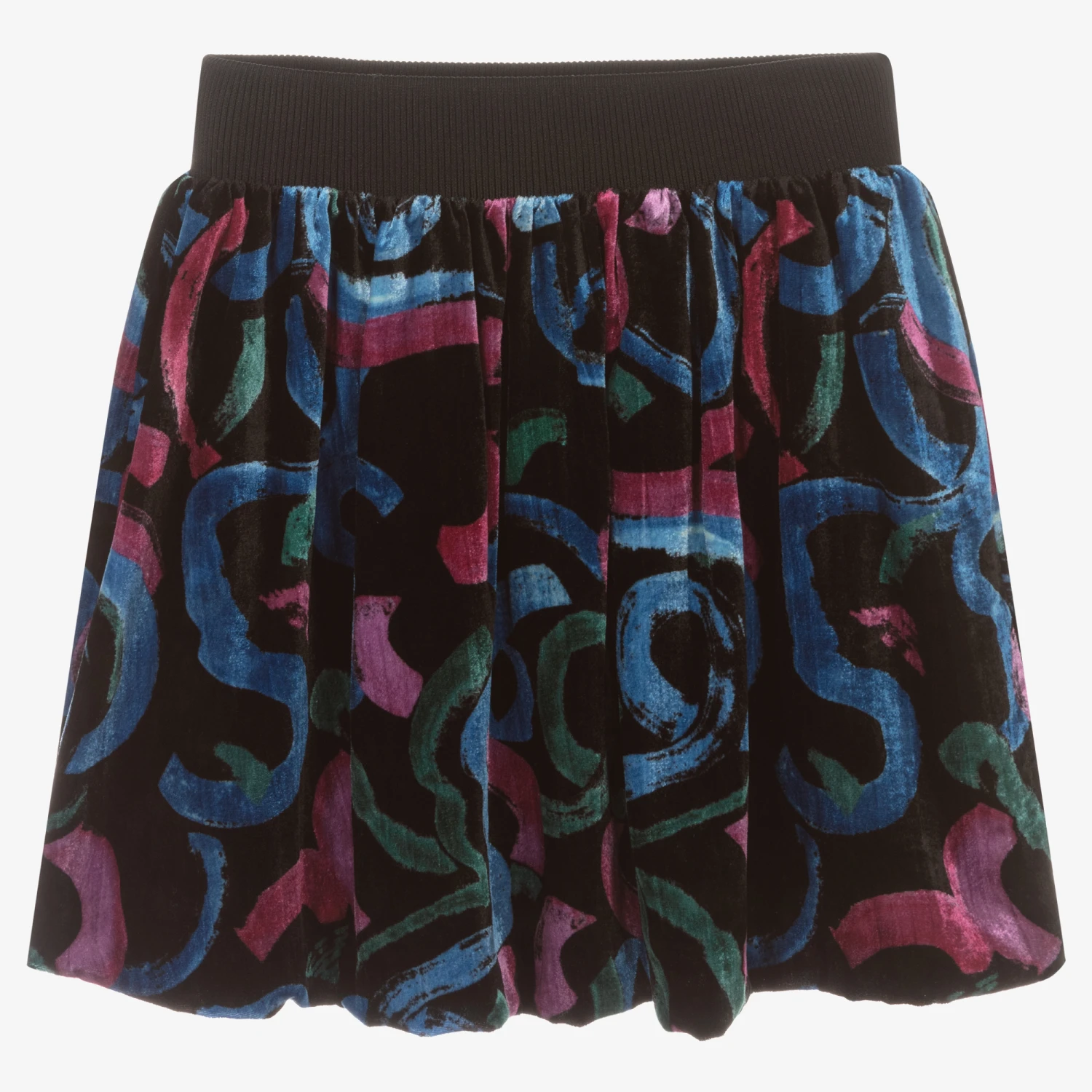 Pretty black skirt for teen girls by Emporio Armani, made in velour with a luxurious look. Patterned with a bold pink, green and blue abstract design, it has a stretchy waist and satin lining, comprising comfort and style.