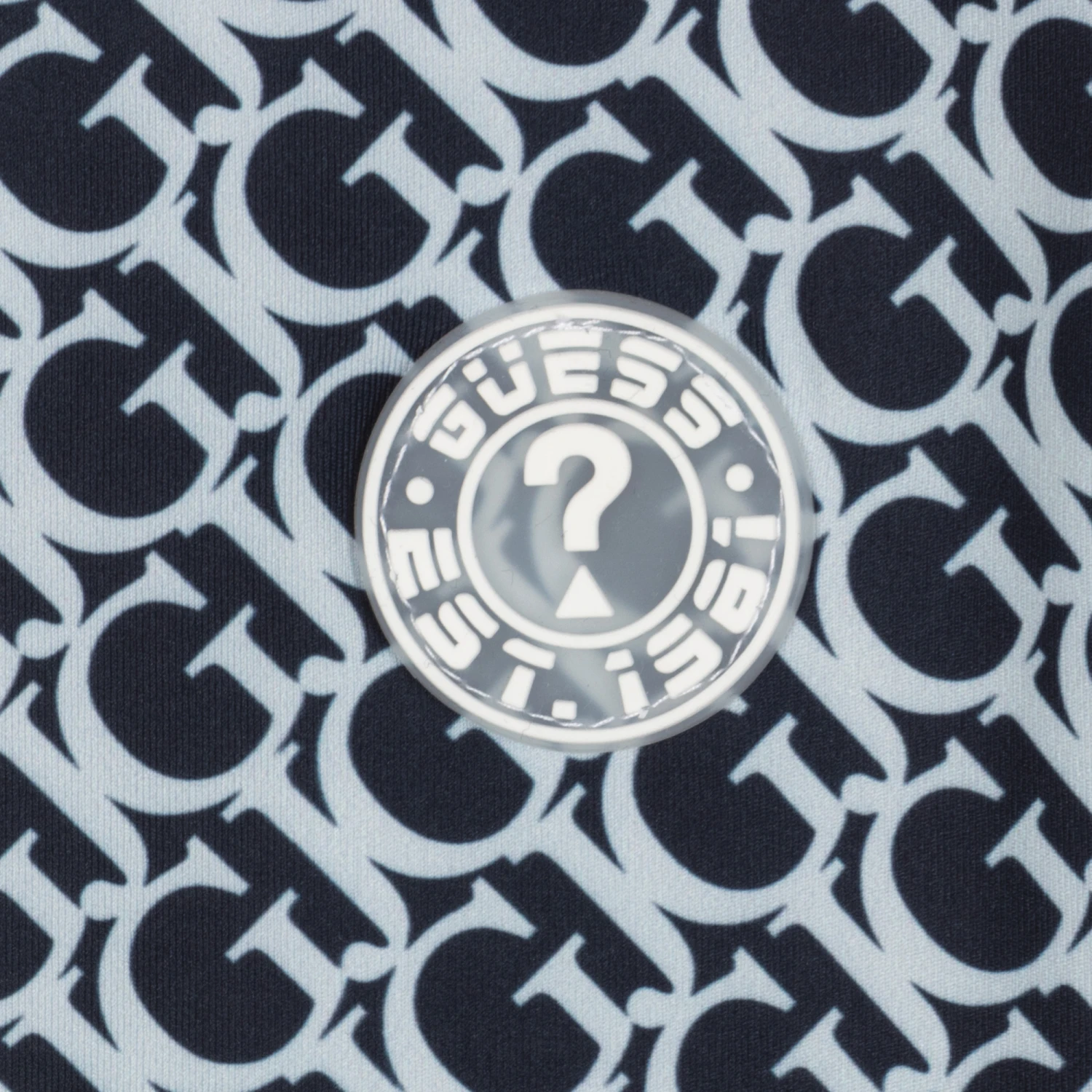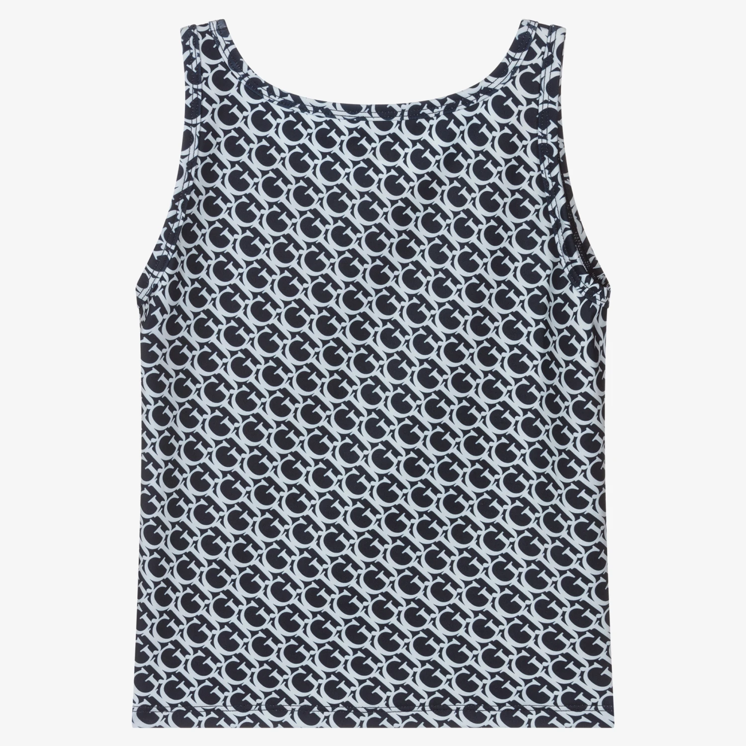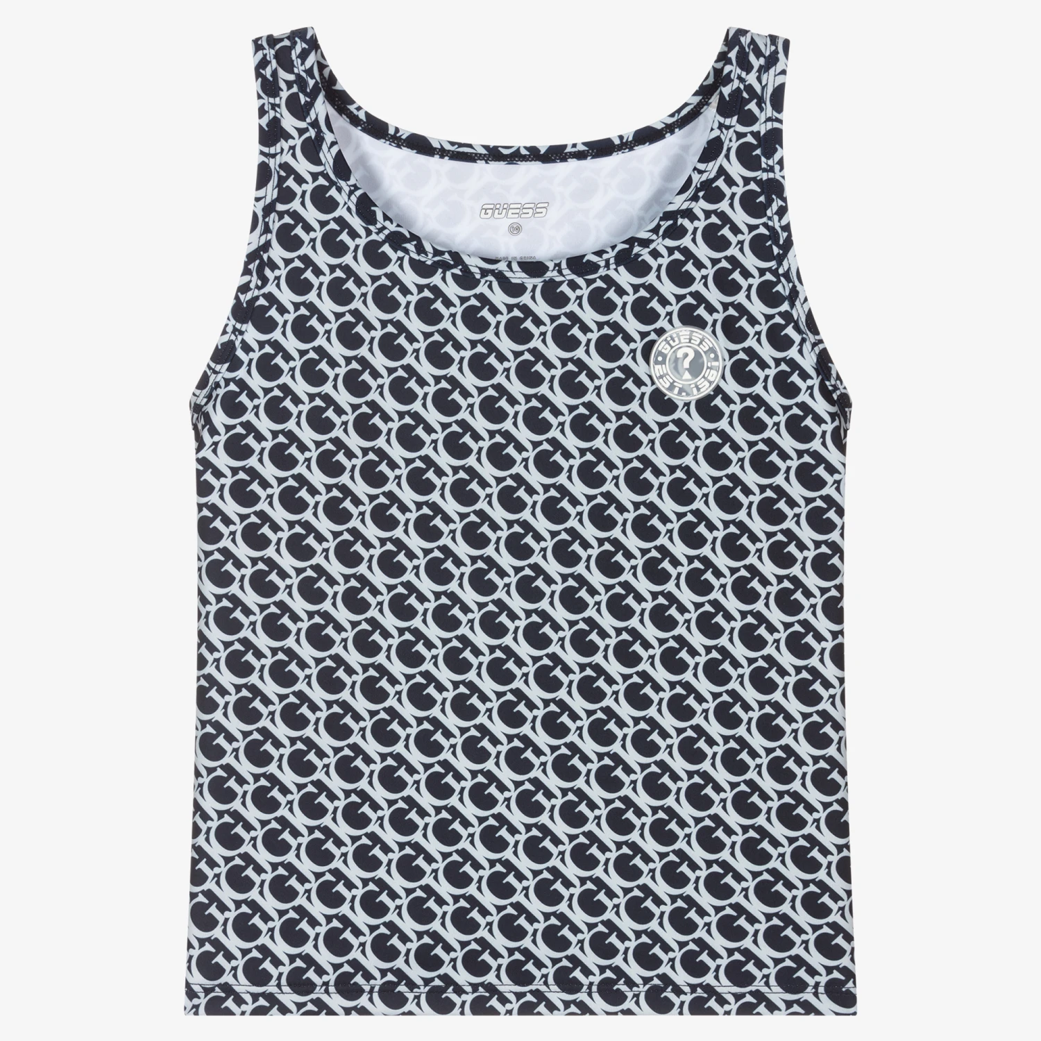Stylish yet functional navy blue cropped sports top for teen girls by Guess, made in soft and stretchy polyester, recycled from plastic. It has an all-over pale blue ‘GJ’ logo pattern and a rubber logo badge on the front. Ideal for exercise, the fabric is anti-bacterial and stays fresh and clean for longer.