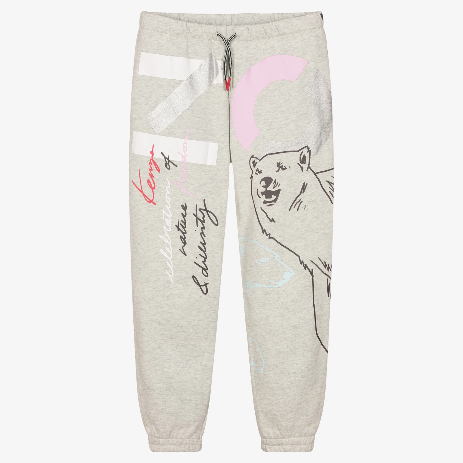 Grey marl joggers for teen girls by luxury French designer KENZO KIDS. They are printed with the brand’s multi-iconic logos such as the Tiger and polar bear in pink, blue and brown with shiny silver. Made in comfortable, mid-weight cotton jersey, they have a pale blue fleecy inside and a drawstring waistband, with concealed side pockets.