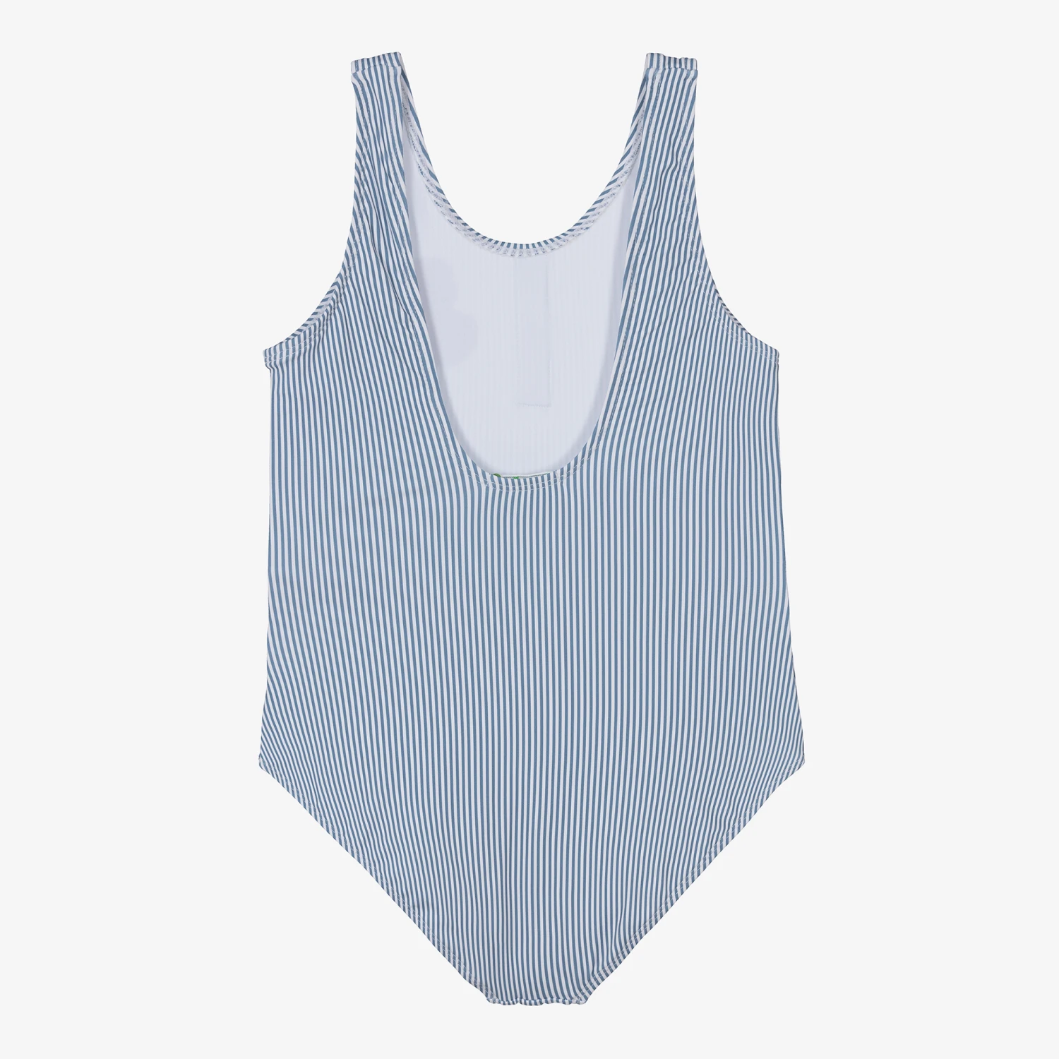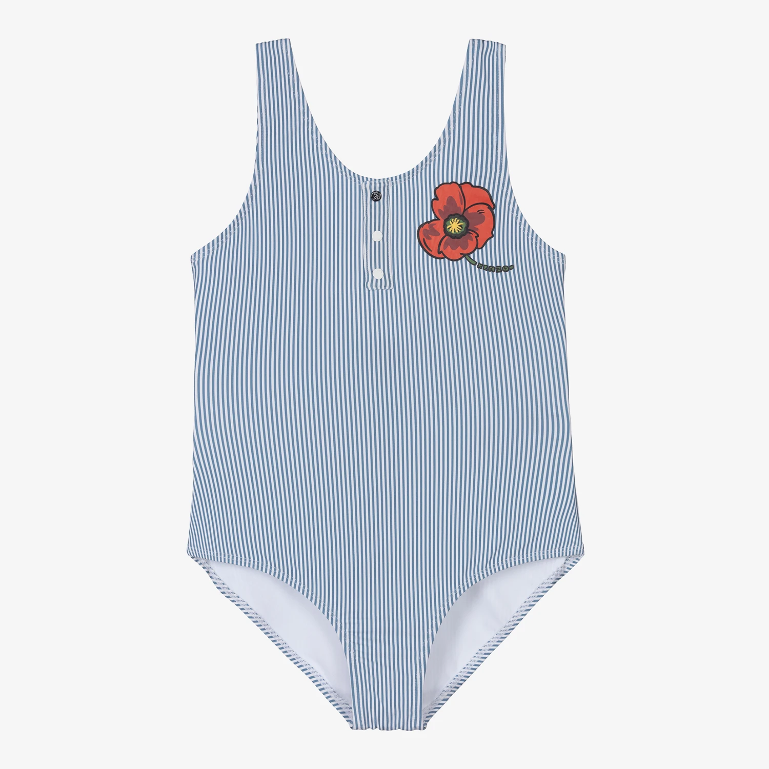 Classic with designer flair, this white and blue stripe swimsuit for teen girls is from KENZO KIDS. Luxuriously printed on the chest is a blooming red poppy, with a logo innovatively incorporated in the stem. Decorative buttons, with a black poppy logo-embossment, sit neatly on the front This swimsuit is smooth and stretchy with a full lining, and has a deep scooped back for a stylish finishing touch.
