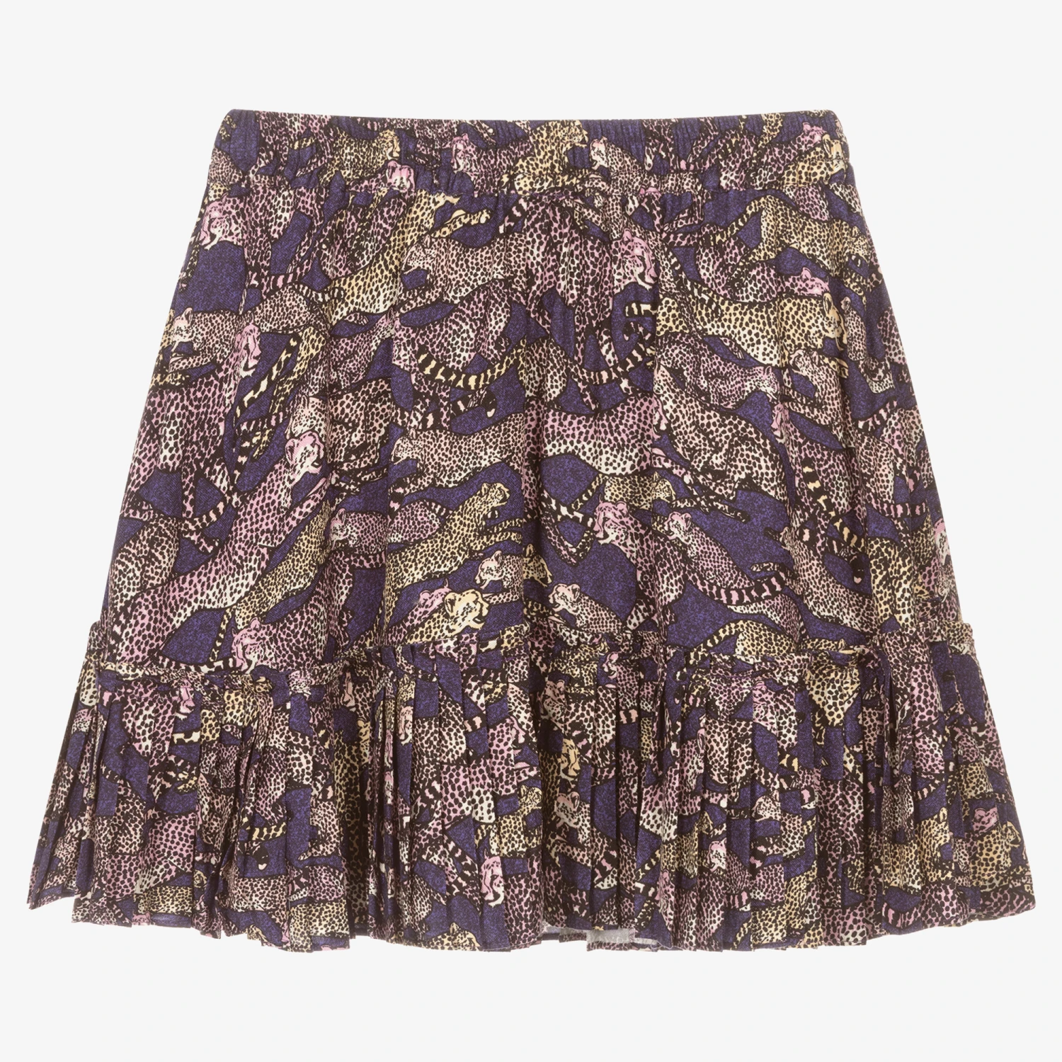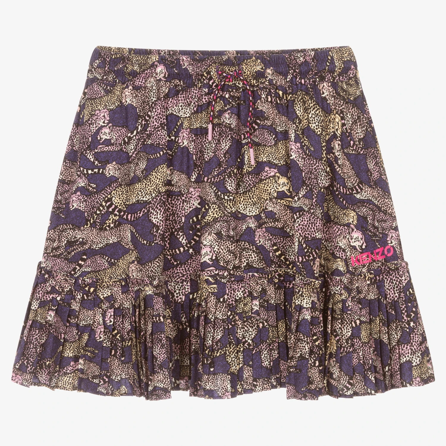 Purple skirt for teen girls by KENZO KIDS. A striking design, this soft, lightweight viscose skirt has all-over leaping cheetah prints in shades of pink and ivory, with a neon pink logo print on the front. There is a feminine pleated hem, useful side seam pockets and a sporty drawstring on the elasticated waist.