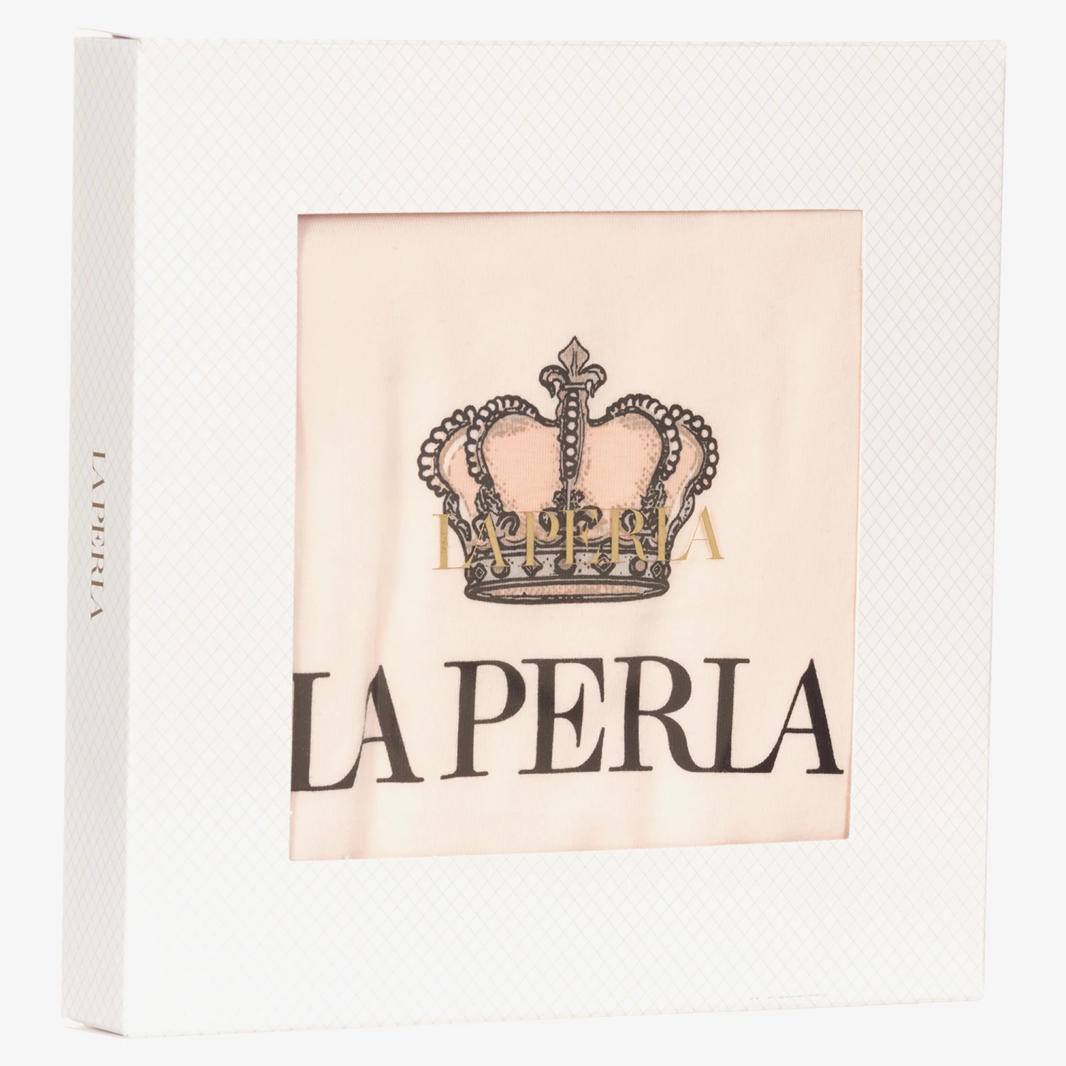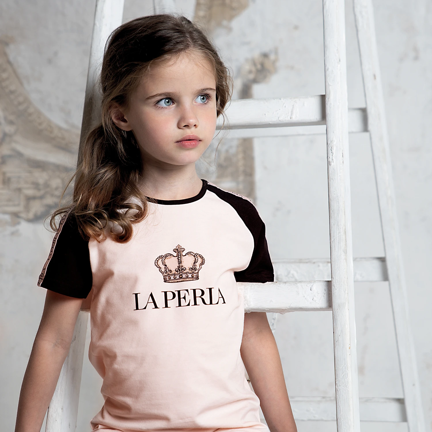 Sporty pale pink T-shirt for teen girls by luxury brand La Perla, made in super soft cotton jersey. There is a crown logo print, with logo taping across the shoulders of the black raglan sleeves.
